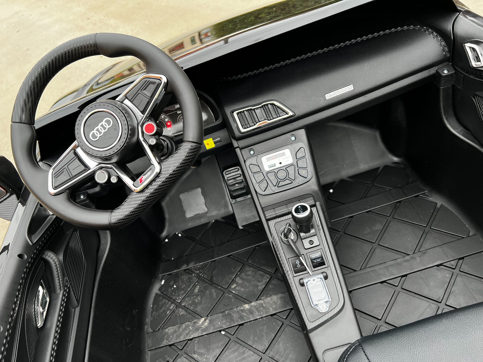 Audi R8 Spyder cu două locuri 24V Mega-dimensiuni cu putere a motoarelor 2 x 200W NOU: Scaune reglabile și volan Mașina de jucărie Audi R8 Spyder este cea mai mare mașină de jucărie din gama noastră și este, de asemenea, potrivită și confortabilă pentru doi copii mai mari. Este echipată cu un MP3 player cu intrare USB/AUX pentru redarea propriilor efecte media și sonore și scaune confortabile din piele. Tracțiunea este asigurată de două motoare de 200W cu o baterie portabilă de înaltă performanță 24V/14Ah, pe care o puteți scoate din jucărie și o puteți încărca și prin intermediul cutiei baterie din exteriorul jucăriei. Acest model are pornire cu cheie – sunt incluse 2 chei. Prin reglarea scaunelor, puteți adapta vehiculul și pentru copiii mai mici, cu opțiunea de a-i asigura cu centurile de siguranță. Difuzoare premium cu subwoofer pentru muzica de calitate. Dimensiuni totale caroserie: 175 cm x 108 cm x 75 cm. O husă de protecție este inclusă în pachet. Player MP3 cu conexiune Bluetooth. Motoare foarte puternice: 2 x 200W. Volan si scaune reglabile. Capacitate de încărcare de până la 100 kg. Uși care se deschid cu încuietoare de siguranță, efecte sonore, indicator de capacitate a bateriei pe MP3 Player, Bluetooth, 2 viteze înainte și 1 înapoi, lumini LED față și spate pentru conducerea în zone întunecate sau neiluminate și o telecomandă nu lipsesc, de asemenea, din dotări. Elaborarea masivă, capacitatea portantă și calitatea sunt dovada excelenței modelului. Roțile moi din polimer EVA cu suspensie – asigură o călătorie silențioasă și sunt rezistente la crăpături sau rupere! Accelerație lină – După ce ați apăsat pedala de accelerație, mașina de jucărie pleacă de pe loc, în timp ce accelerația este controlată electronic, astfel încât să fie lină datorită accelerației netede integrate. Când apăsați pe pedală, nu există nicio smucitură neplăcută la pornire. O opțiune pentru copiii mai mici – datorită setării unei viteze mai mici, poziționării ambelor scaune, a pornirii line și centurii de siguranță, modelul este potrivit și pentru copiii mai mici. Frână electrică – pentru oprire sigură și rapidă după eliberarea pedalei de accelerație În afară de încărcare și spălare, mașina de jucărie nu necesită nicio altă întreținere. Conducând această mașină fantastică de marcă, copilul tău va fi în centrul atenției și al interesului peste tot. Pachetul conține un adaptor cu indicator, o baterie portabilă, o telecomandă, o husă de protecție și mașina. Caracteristici 2 locuri Roți EVA Pornire cu cheie Scaun din piele Lumini LED MP3 player Port USB Capotă care se deschide Telecomandă Suspensii Uși care se deschid Centură de siguranță Bluetooth Selector viteză Caracteristici speciale Centuri de siguranță de calitate Lumini LED spate Lumini frontale LED Oglinzi retrovizoare imitație carbon Player MP3 cu conexiune Bluetooth Scaune reglabile Specificații tehnice / Dimensiunile produsului Dimensiuni: 175 cm x 108 cm x 75 cm Două scaune din piele (reglabile) Lumini LED față și spate Comutator REMOTE/PEDAL – comutați între telecomandă și control manual. Telecomanda funcționează în modul la distanță, pedala este blocată. Pedala funcționează în modul opus, când telecomanda este blocată. Tracțiune spate Potrivit pentru doi copii. Elaborare detaliată. Motor cu pornire lină – fără smucituri la apăsarea pedalei de accelerație Roți din polimer EVA moi Telecomandă de 2,4 GHz Axa suspensie Centuri de siguranță Uși care se deschid cu încuietori de siguranță Player MP3 cu Bluetooth. Greutate: 100 kg. Capacitate de încărcare EXTRA: până la 100 kg, capacitatea de încărcare testată: 110 kg Viteză: 7 – 9 km/h. Tracțiune: 2x motor 24V 200W Baterie: 1x 24V/14Ah (portabilă) Adaptor: de la 220V la 24V / 1000mA. Încărcare: de la 5 la 8 ore Timp de condus: 2 până la 3 ore, în funcție de greutate și teren Categoria de vârstă recomandată: de la 6 ani