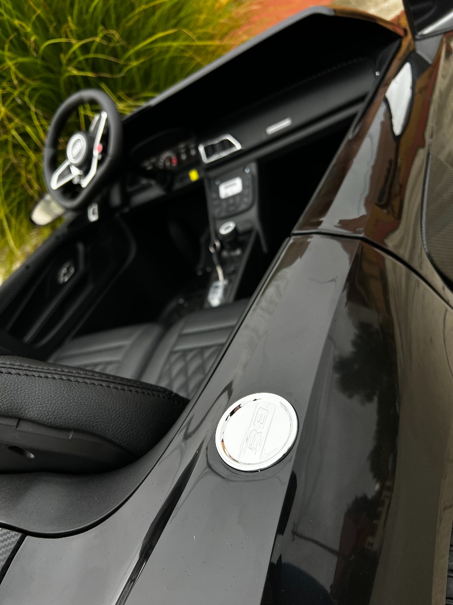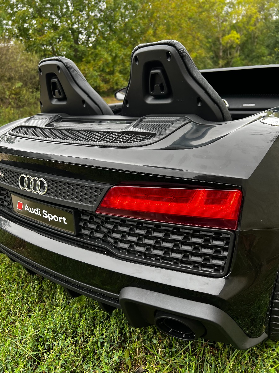 Mașină electrică Audi R8 SPYDER cu două locuri 24V, negru, MP3 Player cu USB/AUX și Bluetooth, Baterie 24V/14Ah, 2 motoare 200W, roți EVA cu suspensie spate, Scaune din piele, Controller cu cadran, Model cu Licență