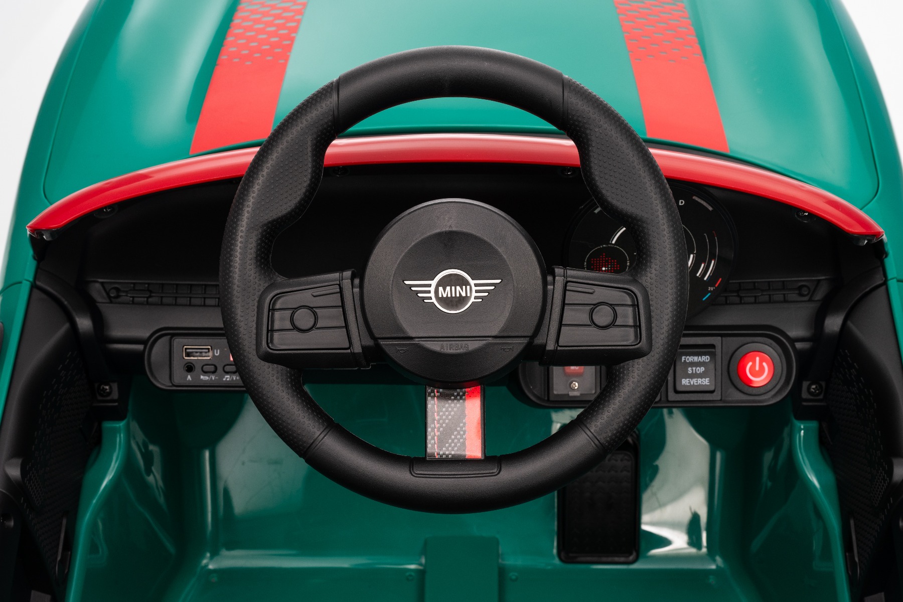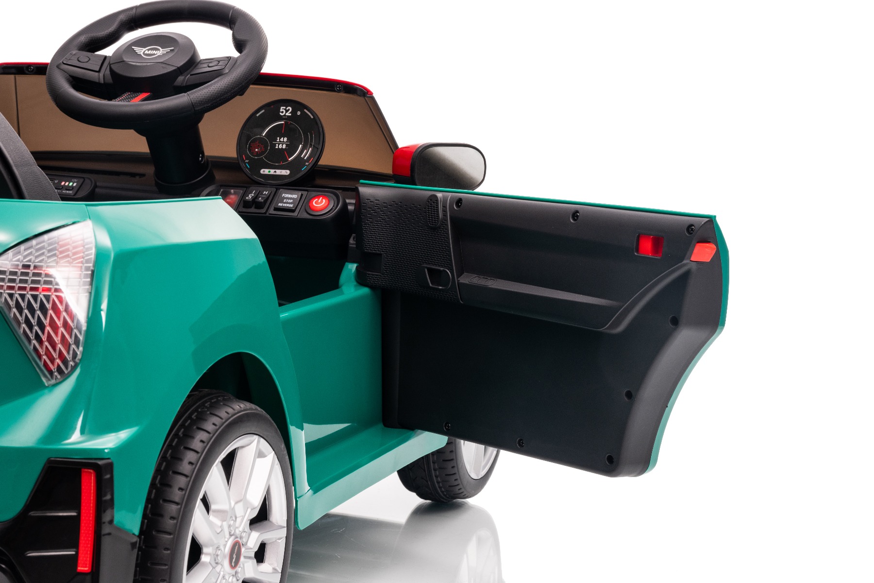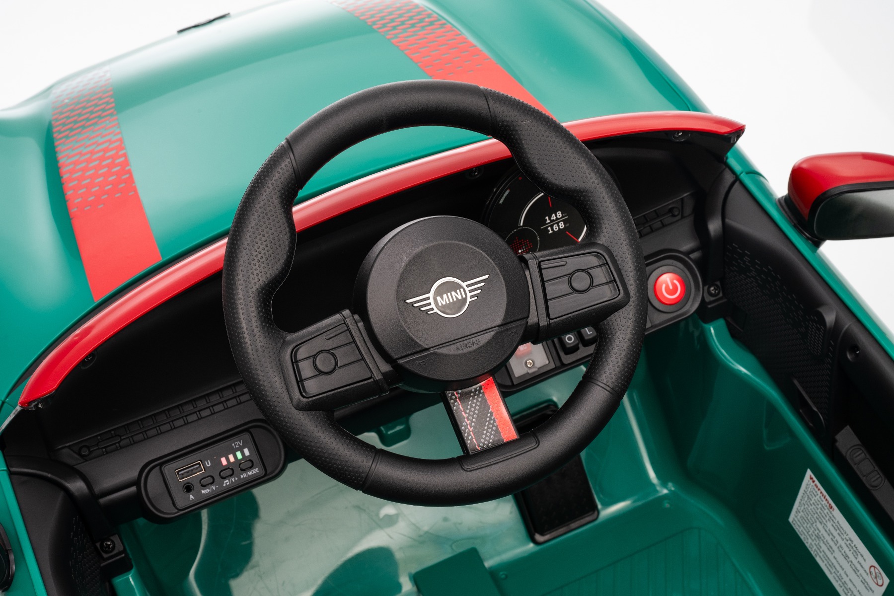 Mașinuța elecrică de jucărie MINI Cooper 12V NOU: Baterie litiu (10.8V3.1AH) Mașinuță electrică elegantă cu design emblematic MINI. Modelul este echipat cu o pereche de uși care se deschid, ce permit o îmbarcare confortabilă. Când comutatorul este pornit, modelul imită sunetul pornirii, iar luminile LED față și spate se aprind. Există efecte sonore precum claxon, sunet de condus, cântece sau melodii. Există o intrare USB și conexiune Bluetooth, iar volumul este controlat direct prin intermediul playerului MP3 încorporat. Volan multifuncțional – pentru un control mai ușor al conținutului media și efectelor sonore, precum claxonul Deschiderea ușilor – cu sistem de blocare, pentru o intrare și ieșire mai ușoară din vehicul Mașinuța are o telecomandă de nouă generație de 2,4 GHz, un comutator de pornire iluminat pornit/oprit și o frână de urgență, care dezactivează imediat toate funcțiile vehiculului atunci când este activată. Mașina are tracțiune pe ambele roți spate. Modelul are inclus un comutator pentru viteză mică/mare cu marșarier și funcția de tractare – poate fi tras ca o valiză. Pornirea controlată electronic asigură o accelerație lină, fără smucituri. 3 viteze de deplasare înainte sunt disponibile prin telecomandă Accelerare lină – Când apăsați pedala de accelerație, mașina începe să se deplaseze, iar pornirea este controlată electronic pentru a fi lină datorită accelerației line integrate. Acest lucru elimină smuciturile neplăcute la pornire și face călătoria mai confortabilă. Baterie litiu (10.8V3.1AH): Durata lungă de viață – Pot rezista la mai multe cicluri de încărcare. Capacitate mare – Sunt ușoare și puternice. Încărcare rapidă – Se încarcă rapid și se descarcă lent. Conținutul pachetului: Mașină electrică de jucărie MINI Cooper cu licență originală Telecomandă de 2,4 GHz cu frână de urgență Încărcător (13,3 V / 0,9 A) Baterie 10,8 V / 3,1 Ah (încorporată) Manual de utilizare Accesorii de montare (dacă este necesar – șuruburi, cheie) Caracteristici Lumini LED MP3 player Port USB Telecomandă Volan multifunctional Uși care se deschid Centură de siguranță Bluetooth Selector viteză Buton pornire Baterie litiu-ion Caracteristici speciale Player MP3 cu Bluetooth Roți auxiliare pentru tractare Uși care se deschid, cu blocare de siguranță Specificații tehnice / Dimensiunile produsului Model cu licență Tip mașină: Cu un loc Tracțiune mașină: 2×2 Motor mașină: 2 x 25 W Număr de viteze: 2 (mare/mic și marșarier) Viteză: 3–5 km/h Capacitate de încărcare: max. până la 30 kg Baterie: Litiu 10.8V/3.1Ah Timp de încărcare: min. 6–8 ore Autonomie: 2-3 ore în funcție de încărcătură și teren Pornire lină Frână de urgență Centură de siguranță: centură în 2 puncte Scaun: plastic standard Uși: cu sistem de deschidere Iluminare: lumini față și spate Echipament multimedia: USB, Bluetooth, control volan Vârstă recomandată: 3 până la 6 ani Dimensiuni: 96 x 55 x 47 cm Dimensiuni pachet: 100 x 51 x 26 cm Greutate vehicul: 9.9 kg