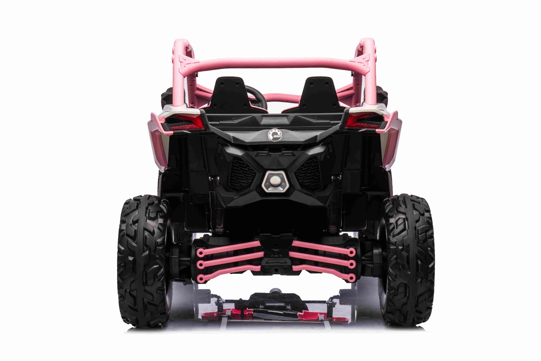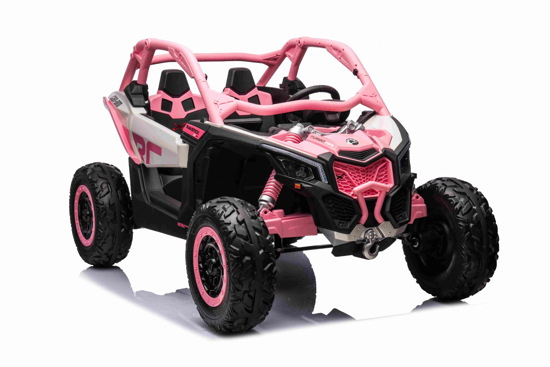 Mașină electrică copii Can-am Maverick 24V, Roz, cu două locuri, suspensie spate, telecomandă 2,4 Ghz, Baterie litiu portabilă, 4 motoare de 200 W, roți EVA, scaune din piele, player MP3 cu intrare USB/SD, model cu licență