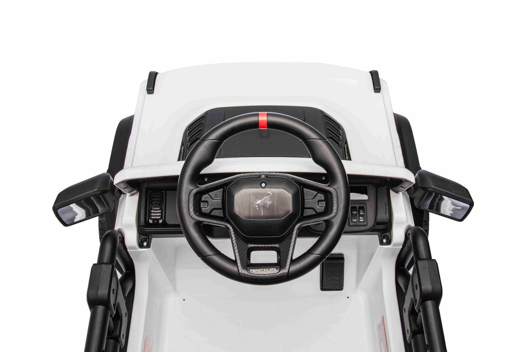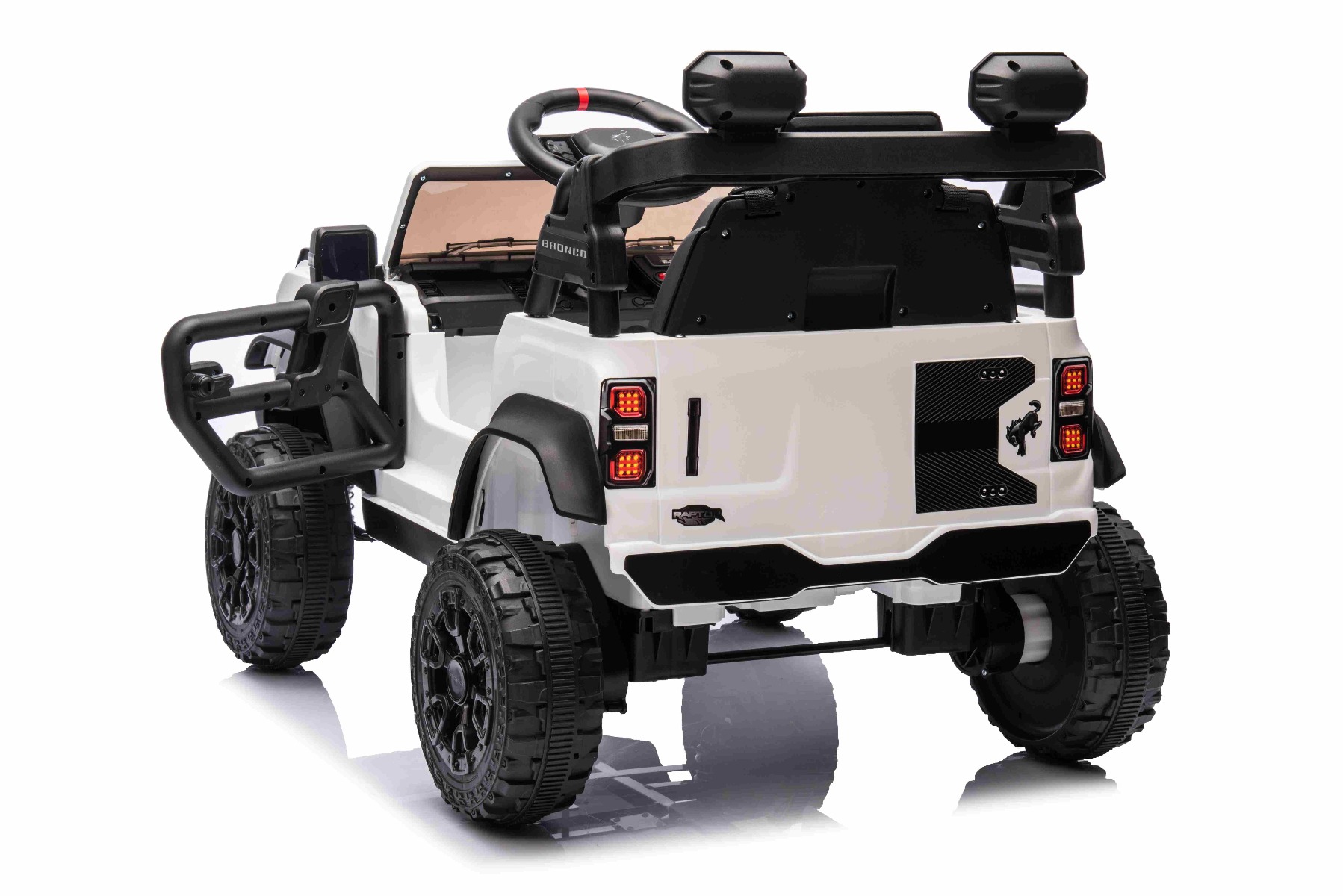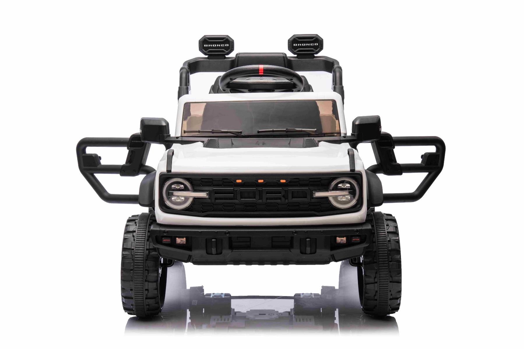 Mașina electrica copii Ford Bronco cu tracțiune spate cu licență (un singur loc), alb, baterie litiu, șasiu înalt, scaun lat, axă suspensie spate, telecomandă 2,4 GHz, player MP3 cu intrare USB, lumini LED