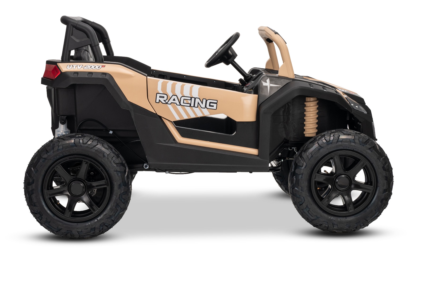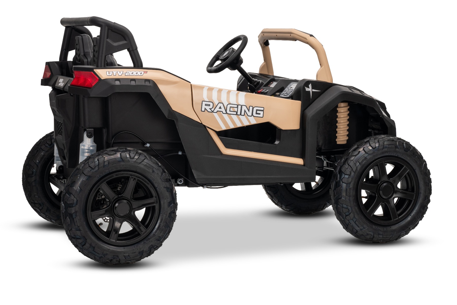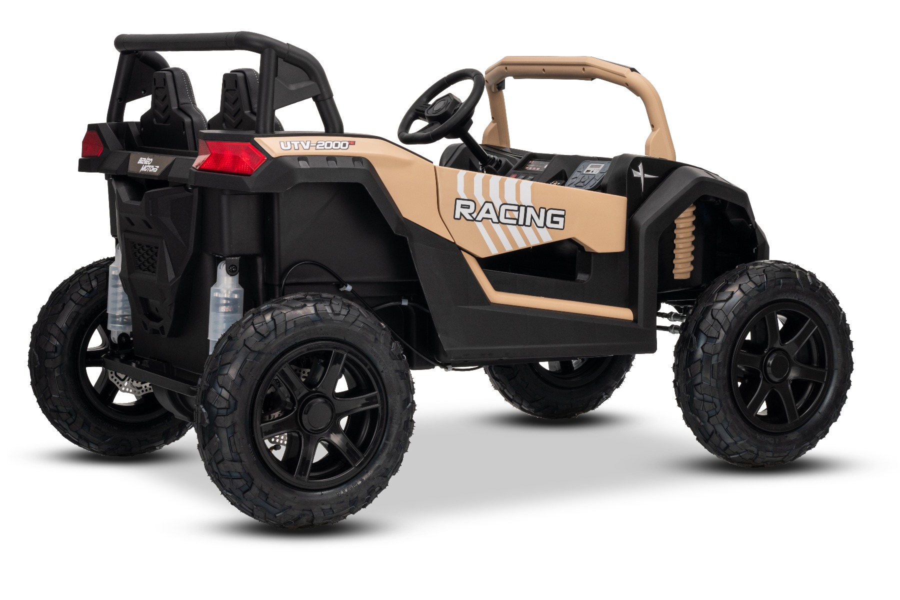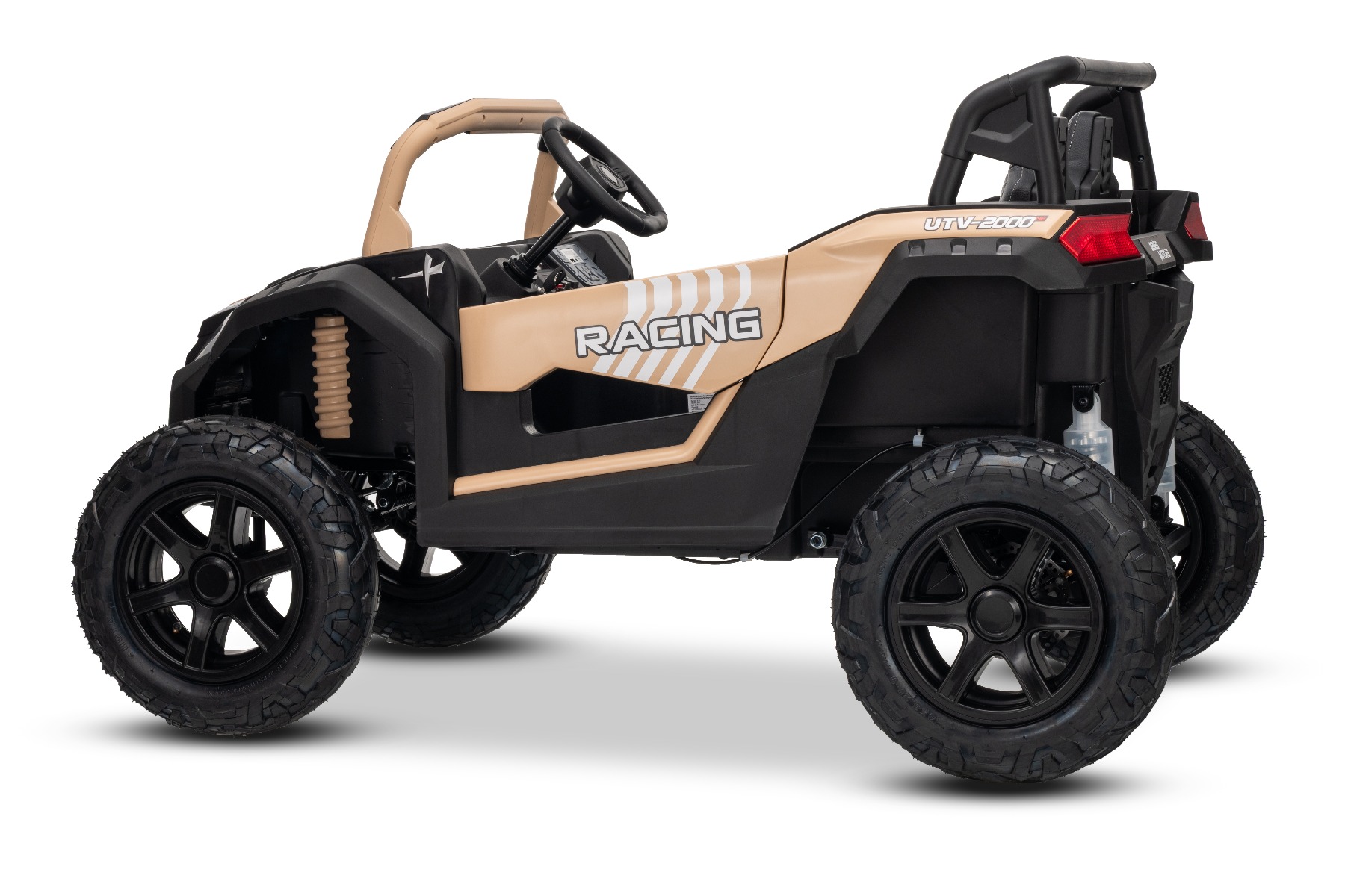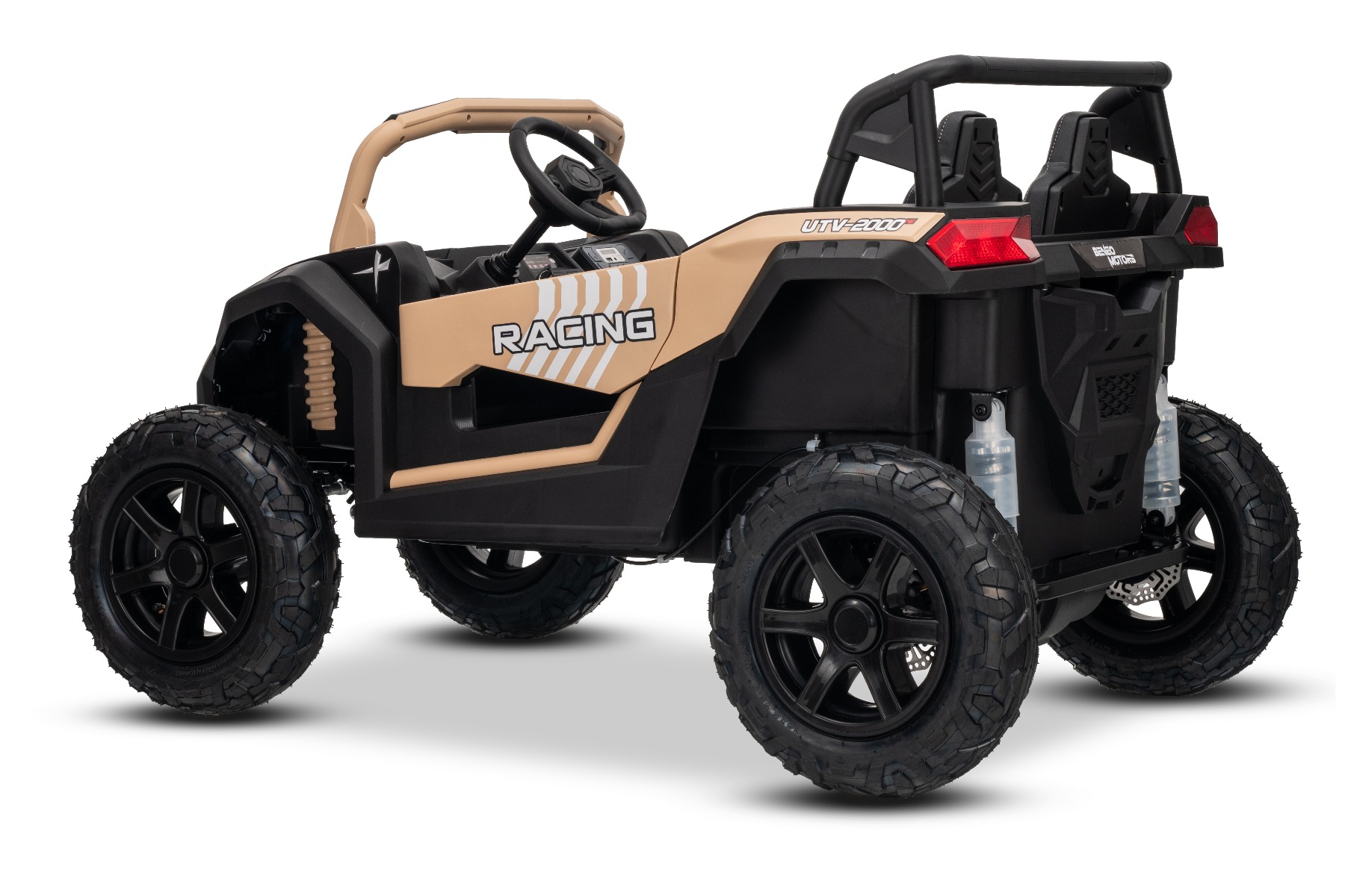 Mașina electrica copii UTV XXL 24V, kaki, cu două locuri, motor cu diferențial, roți gonflabile din cauciuc, punți spate cu suspensii, frână pe disc, scaun căptușit, volan reglabil, bluetooth, player MP3 cu intrare USB/SD