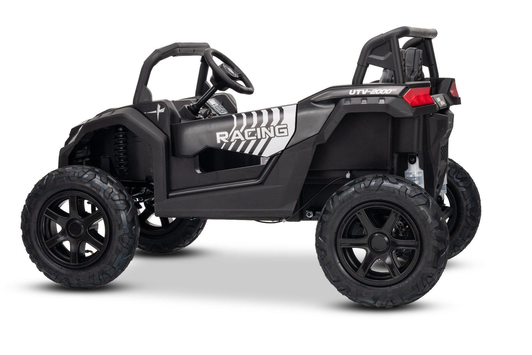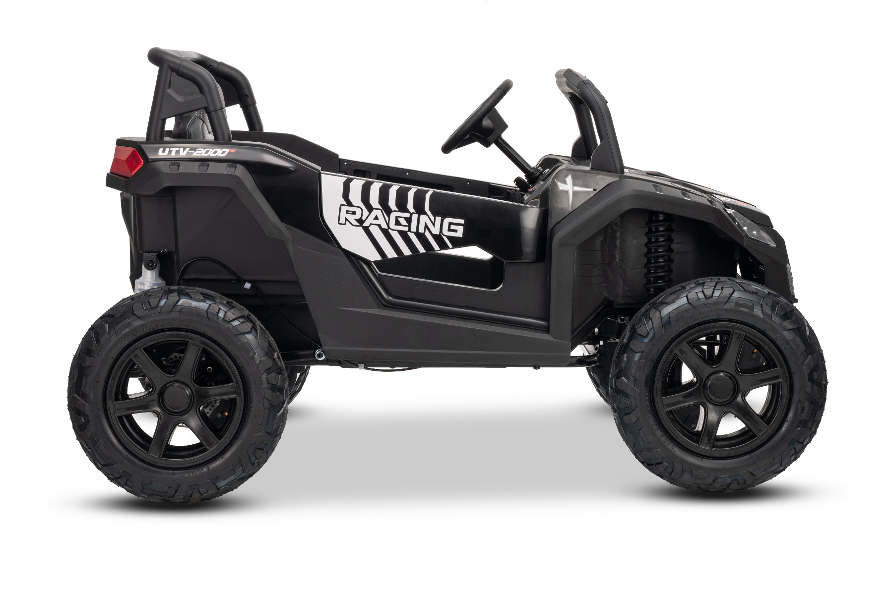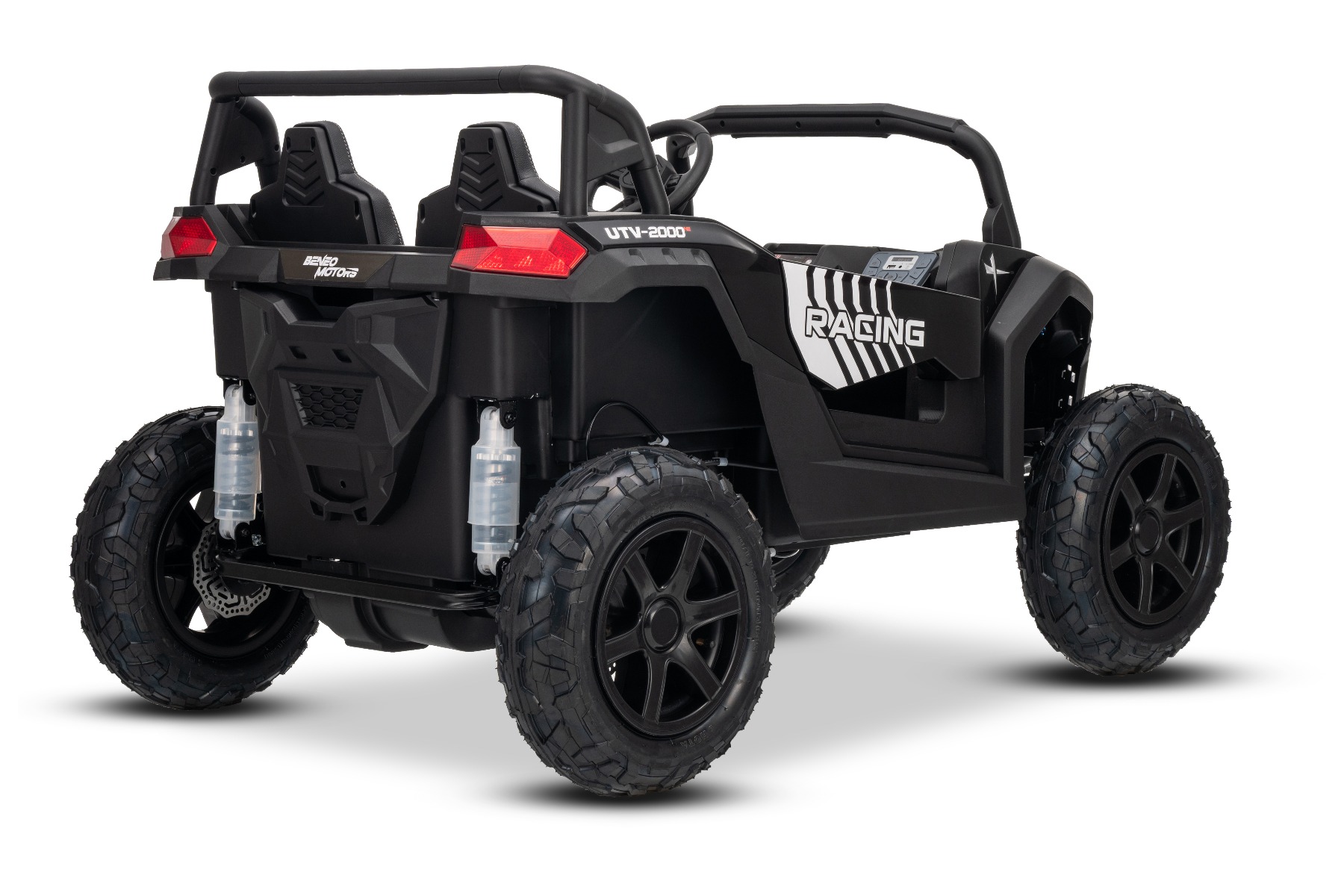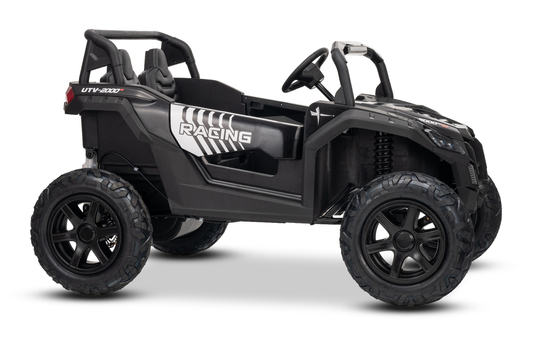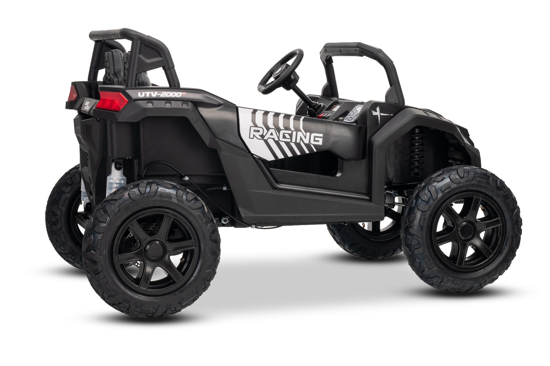 Mașina electrica copii UTV XXL 24V, negru, cu două locuri, motor cu diferențial, roți gonflabile din cauciuc, punți spate cu suspensii, frână pe disc, scaun căptușit, volan reglabil, bluetooth, player MP3 cu intrare USB/SD