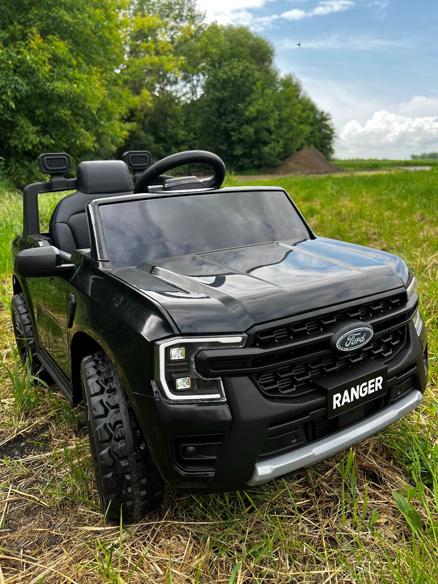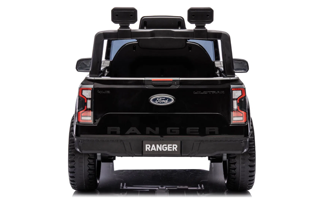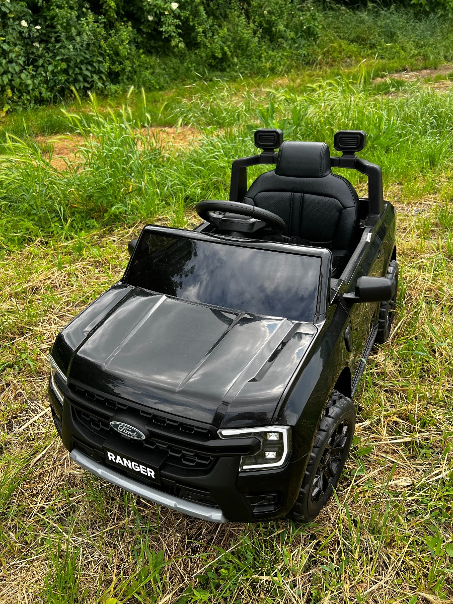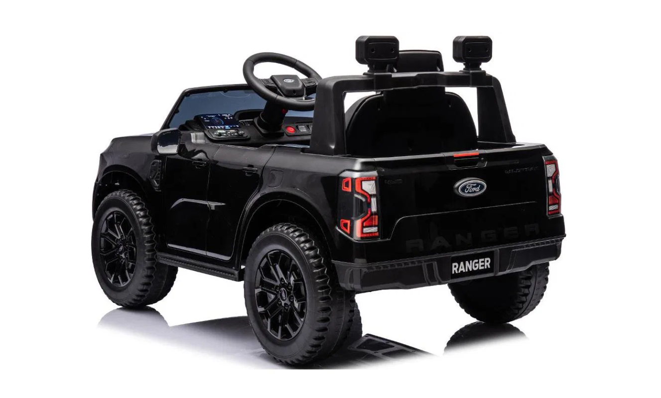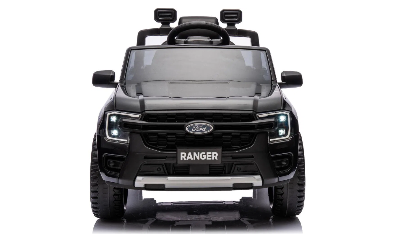 Mașină electrică de jucărie FORD Ranger 12V, negru, Scaun piele, Telecomandă 2,4 GHz, Intrare Bluetooth/USB, Suspensii, Baterie 12V, Roți din plastic, MOTOR 2 X 30W, Licență ORIGINALĂ