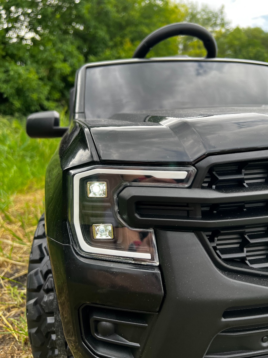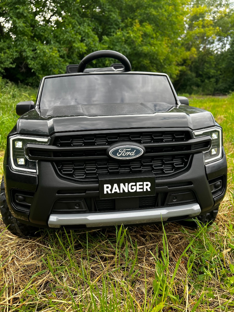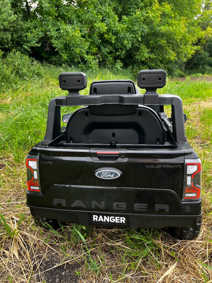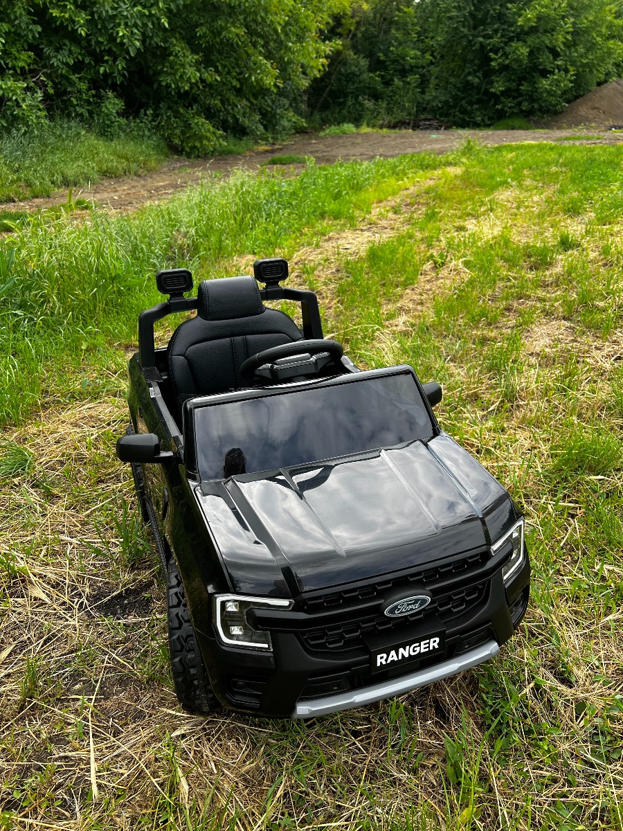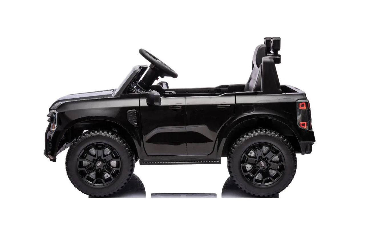 Mașină electrică de jucărie FORD Ranger 12V, negru, Scaun piele, Telecomandă 2,4 GHz, Intrare Bluetooth/USB, Suspensii, Baterie 12V, Roți din plastic, MOTOR 2 X 30W, Licență ORIGINALĂ