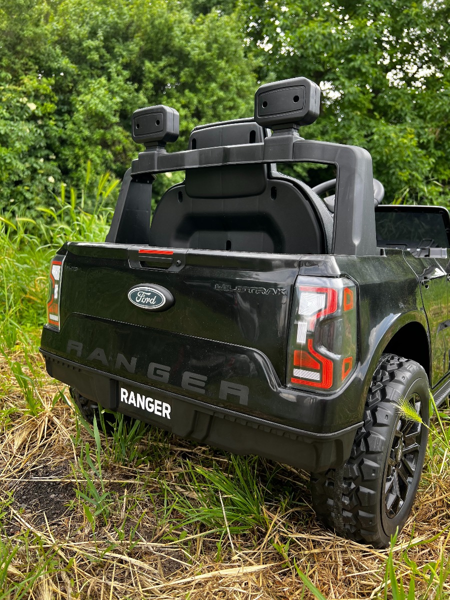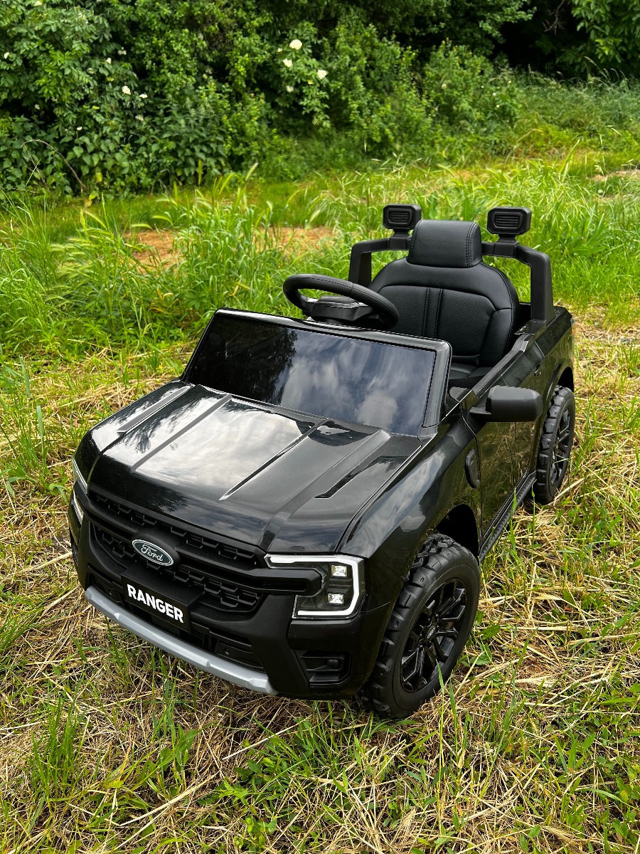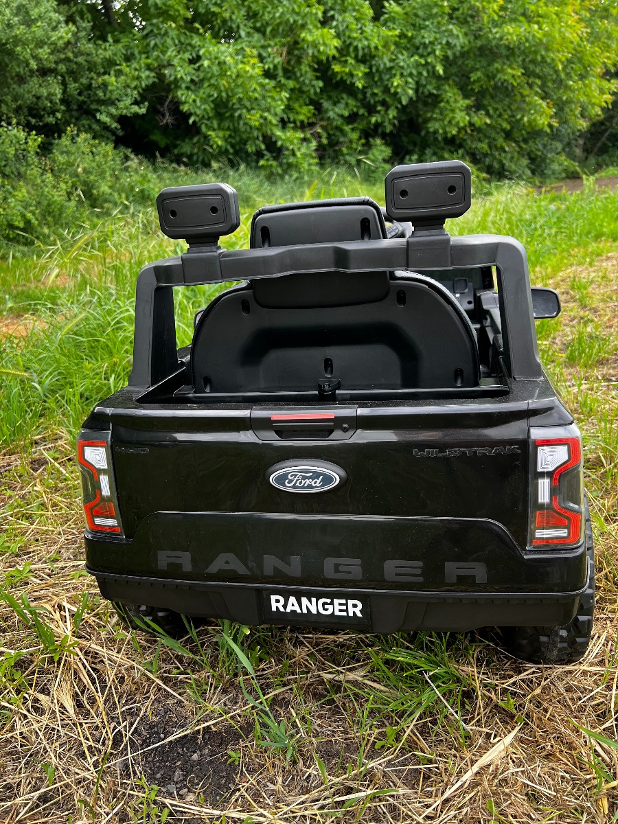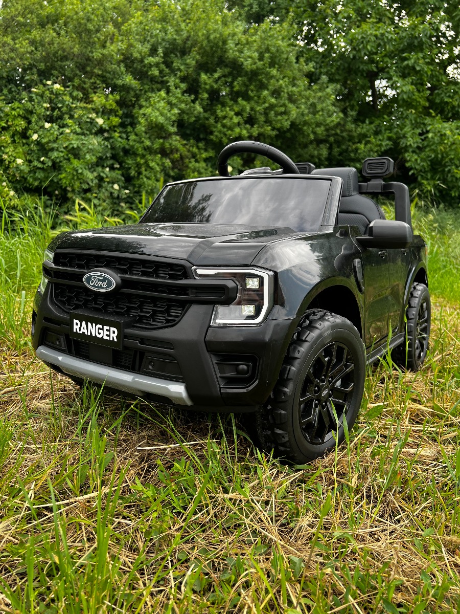 Mașină electrică de jucărie FORD Ranger 12V, negru, Scaun piele, Telecomandă 2,4 GHz, Intrare Bluetooth/USB, Suspensii, Baterie 12V, Roți din plastic, MOTOR 2 X 30W, Licență ORIGINALĂ