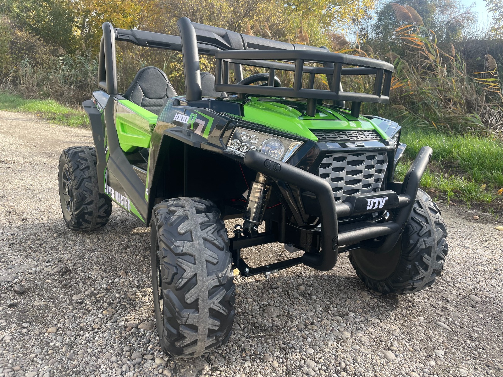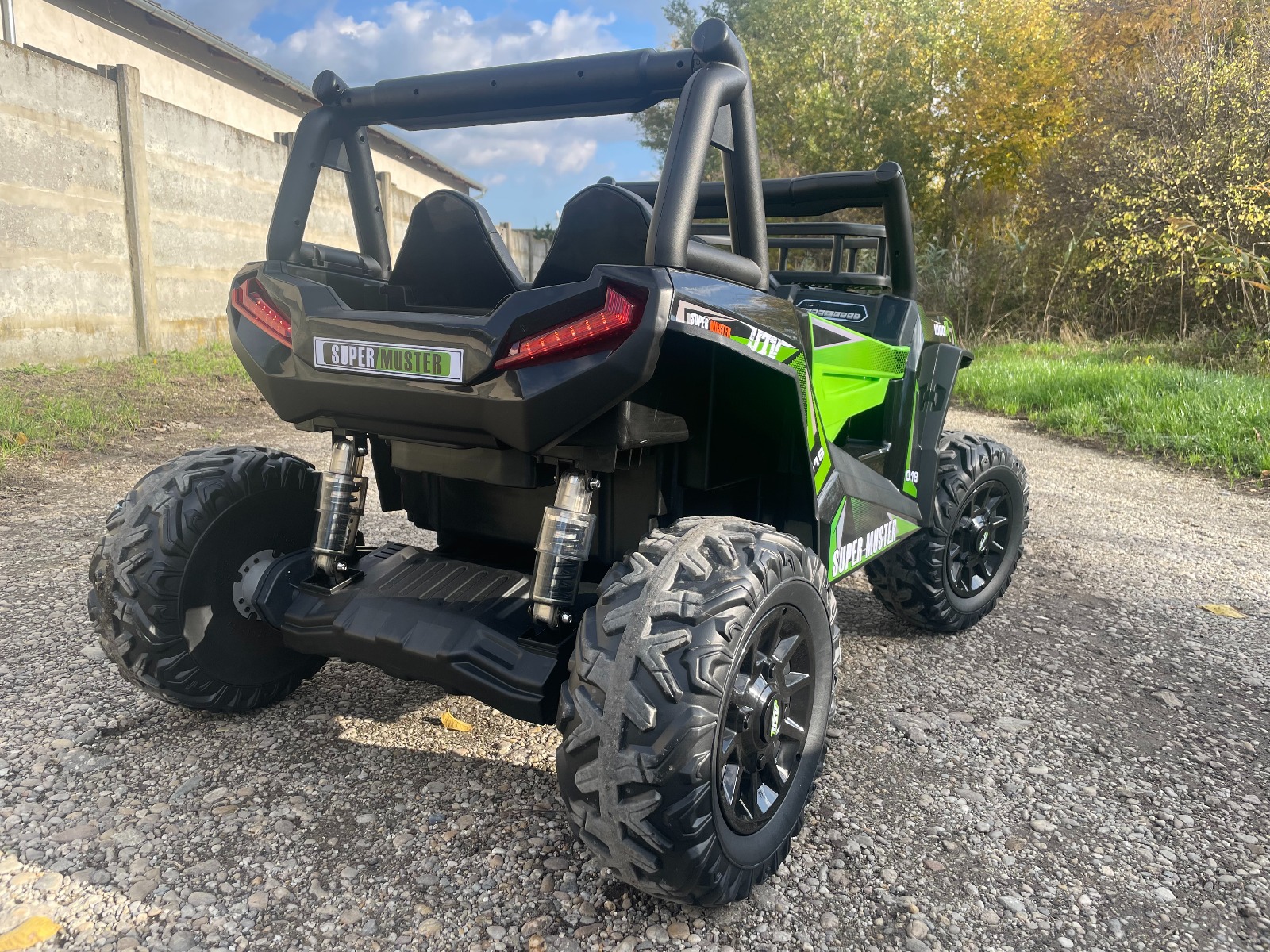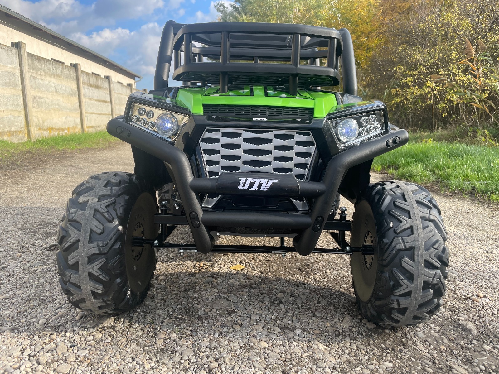 Mașină de jucărie electrică UTV imensă cu baterie litiu de 22V! 2 x Spații de depozitare, capacitate de încărcare testată de 100 kg 2 x Motoare de 200 W cu frâne electrice NOU: Baterie litiu 22.2V 4.5 AH Una dintre cele mai mari mașini din oferta noastră – UTV cu o baterie litiu de 22V și o frână electrică plasată pe motoarele extra-puternice de 200W. Mașina UTV are un aspect puternic, ușile se deschid, are 2 spații de depozitare, materiale de calitate și manopera excelentă. Are două scaune din piele, ceea ce o face potrivită pentru doi copii. • Roți din polimer EVA moi – asigură o deplasare liniștită și sunt rezistente la fisuri. • Axe suspendate cu protecție mecanică telescopică. Mașina este, de asemenea, echipată cu lumini față – spate și o punte iluminată în spate. 2 butoane elegante pentru claxon, muzică și melodii moderne, conexiune pentru MP3, USB, AUX și control al volumului și sunetului. Pentru siguranța copiilor, pe scaun există o centură de siguranță reglabilă. Ușă se deschide, efecte sonore, indicator de stare a bateriei, motoare de 2 x 200 W, cu tracțiune spate, 3 viteze înainte și 1 mers înapoi, datorită acestui echipament este potrivit[ și pentru conducerea off-road. Accelerație lină – Când pedala de accelerație este apăsată, mașina pornește, pornirea este controlată electronic, astfel încât să fie lină datorită accelerației line integrată. Nu există o pornire bruscă, neplăcută atunci când pedala este apăsată. Baterie litiu (22.2V4.5AH): Durata lungă de viață – Rezistă la mai multe cicluri de încărcare. Capacitate mare – Sunt ușoare și puternice. Încărcare rapidă – Se încarcă rapid și se descarcă lent. Posibilitate de a conduce chiar și pentru copiii mai mici – datorită setării unei viteze mai mici și a unui start lin !!! Frână electrică – pentru o oprire sigură și rapidă după eliberarea pedalei de accelerație Pachetul conține un adaptor cu indicator, nu supraîncarcă bateria + bateria reîncărcabilă. Caracteristici 2 locuri Roți EVA Scaun din piele Lumini LED MP3 player Port USB Telecomandă Volan multifunctional Suspensii Uși care se deschid Centură de siguranță Selector viteză Buton pornire Baterie litiu-ion Caracteristici speciale Uși care se deschid Suspensii Specificații tehnice / Dimensiunile produsului Dimensiuni auto: 136 x 87 x 85 cm Dimensiuni pachet: 144 x 77 x 53 cm Potrivit pentru doi copii Pornirea lină a motorului – fără întreruperi la apăsarea clapetei de accelerație Frână electrică amplasată pe motoare – când pedala de accelerație este eliberată, aceasta se activează și mașina se oprește mai repede decât alte modele Roți moi din polimer EVA Axe cu suspensii Telecomandă de 2,4 GHz cu asocierea la o anumită mașină – nu mai există interferențe de semnal de la alte mașini FRÂNĂ DE URGENȚĂ CU TELECOMANDĂ – dezactivează toate funcțiile de conducere ale mașinii. Apăsarea din nou a frânei de urgență activează funcțiile de deplasare. Această inovație oferă un control parental maxim asupra vehiculului și o utilizare sigură. Opțiunea de setare a vitezei de la distanță, din telecomandă – telecomanda inovatoare permite părinților să seteze viteza de conducere în timp ce copiii conduc. Setați indicatorul de viteză din telecomandă Scaune tapițate Centuri de siguranță Deschiderea ușilor Lumini cu leduri MP3 player cu UBS/AUX pentru redarea muzicii în mașină Greutate: 41 kg Capacitate de încărcare: 70 kg, Testat până la 100 kg (Parametrii indicați în manual se referă la echipamentul de bază) Viteză: 3 – 7 km / h. Motor: 2 x 200W Motor 24V Baterie: Litiu (22.2V4.5AH) Încărcare: 4 până la 5 ore Timp de conducere: 2.5 până la 3,5 ore, în funcție de greutate și teren Categoria de vârstă: 3 – 8 ani
