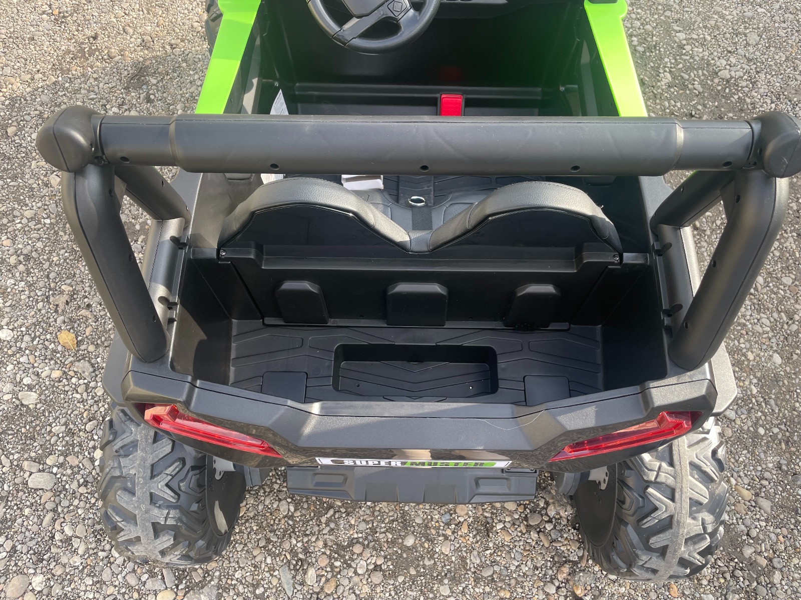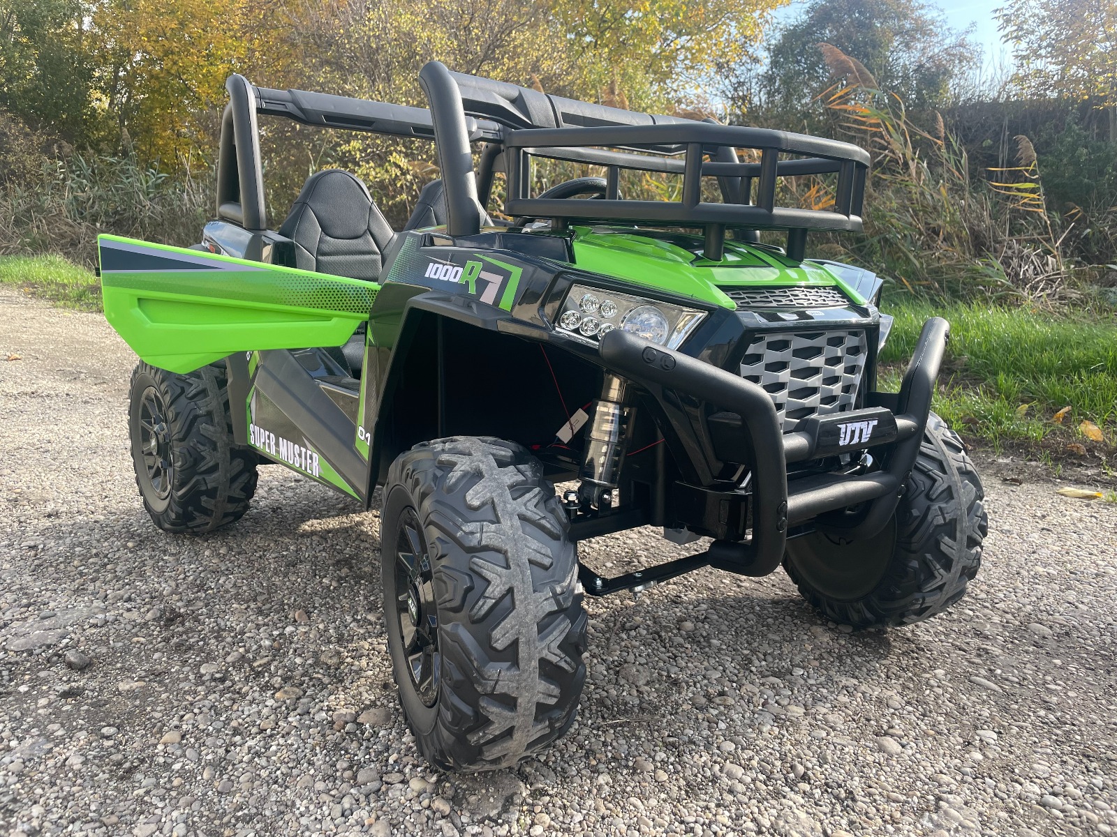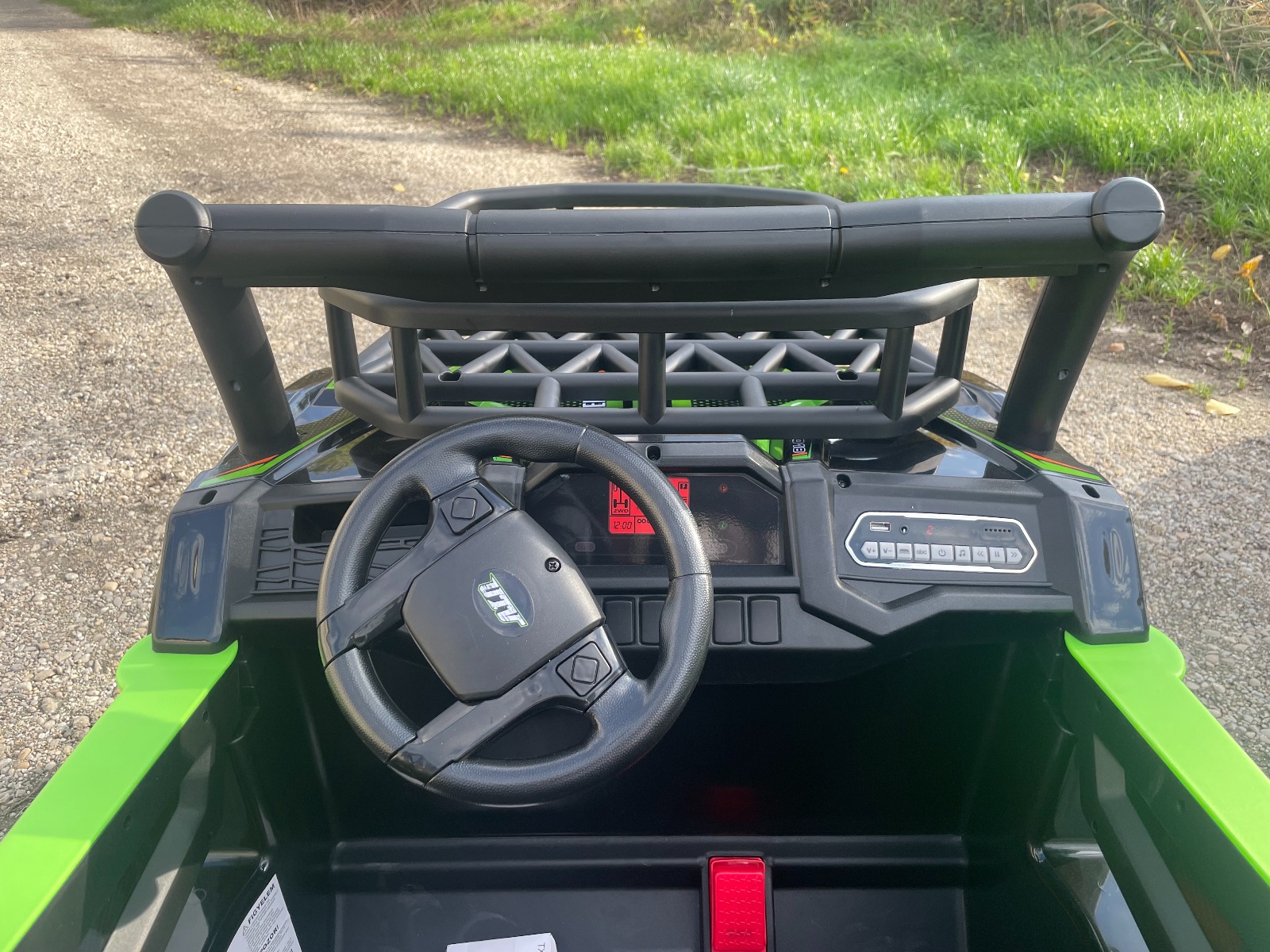 Mașină de jucărie electrică UTV imensă cu baterie litiu de 22V! 2 x Spații de depozitare, capacitate de încărcare testată de 100 kg 2 x Motoare de 200 W cu frâne electrice NOU: Baterie litiu 22.2V 4.5 AH Una dintre cele mai mari mașini din oferta noastră – UTV cu o baterie litiu de 22V și o frână electrică plasată pe motoarele extra-puternice de 200W. Mașina UTV are un aspect puternic, ușile se deschid, are 2 spații de depozitare, materiale de calitate și manopera excelentă. Are două scaune din piele, ceea ce o face potrivită pentru doi copii. • Roți din polimer EVA moi – asigură o deplasare liniștită și sunt rezistente la fisuri. • Axe suspendate cu protecție mecanică telescopică. Mașina este, de asemenea, echipată cu lumini față – spate și o punte iluminată în spate. 2 butoane elegante pentru claxon, muzică și melodii moderne, conexiune pentru MP3, USB, AUX și control al volumului și sunetului. Pentru siguranța copiilor, pe scaun există o centură de siguranță reglabilă. Ușă se deschide, efecte sonore, indicator de stare a bateriei, motoare de 2 x 200 W, cu tracțiune spate, 3 viteze înainte și 1 mers înapoi, datorită acestui echipament este potrivit[ și pentru conducerea off-road. Accelerație lină – Când pedala de accelerație este apăsată, mașina pornește, pornirea este controlată electronic, astfel încât să fie lină datorită accelerației line integrată. Nu există o pornire bruscă, neplăcută atunci când pedala este apăsată. Baterie litiu (22.2V4.5AH): Durata lungă de viață – Rezistă la mai multe cicluri de încărcare. Capacitate mare – Sunt ușoare și puternice. Încărcare rapidă – Se încarcă rapid și se descarcă lent. Posibilitate de a conduce chiar și pentru copiii mai mici – datorită setării unei viteze mai mici și a unui start lin !!! Frână electrică – pentru o oprire sigură și rapidă după eliberarea pedalei de accelerație Pachetul conține un adaptor cu indicator, nu supraîncarcă bateria + bateria reîncărcabilă. Caracteristici 2 locuri Roți EVA Scaun din piele Lumini LED MP3 player Port USB Telecomandă Volan multifunctional Suspensii Uși care se deschid Centură de siguranță Selector viteză Buton pornire Baterie litiu-ion Caracteristici speciale Uși care se deschid Suspensii Specificații tehnice / Dimensiunile produsului Dimensiuni auto: 136 x 87 x 85 cm Dimensiuni pachet: 144 x 77 x 53 cm Potrivit pentru doi copii Pornirea lină a motorului – fără întreruperi la apăsarea clapetei de accelerație Frână electrică amplasată pe motoare – când pedala de accelerație este eliberată, aceasta se activează și mașina se oprește mai repede decât alte modele Roți moi din polimer EVA Axe cu suspensii Telecomandă de 2,4 GHz cu asocierea la o anumită mașină – nu mai există interferențe de semnal de la alte mașini FRÂNĂ DE URGENȚĂ CU TELECOMANDĂ – dezactivează toate funcțiile de conducere ale mașinii. Apăsarea din nou a frânei de urgență activează funcțiile de deplasare. Această inovație oferă un control parental maxim asupra vehiculului și o utilizare sigură. Opțiunea de setare a vitezei de la distanță, din telecomandă – telecomanda inovatoare permite părinților să seteze viteza de conducere în timp ce copiii conduc. Setați indicatorul de viteză din telecomandă Scaune tapițate Centuri de siguranță Deschiderea ușilor Lumini cu leduri MP3 player cu UBS/AUX pentru redarea muzicii în mașină Greutate: 41 kg Capacitate de încărcare: 70 kg, Testat până la 100 kg (Parametrii indicați în manual se referă la echipamentul de bază) Viteză: 3 – 7 km / h. Motor: 2 x 200W Motor 24V Baterie: Litiu (22.2V4.5AH) Încărcare: 4 până la 5 ore Timp de conducere: 2.5 până la 3,5 ore, în funcție de greutate și teren Categoria de vârstă: 3 – 8 ani