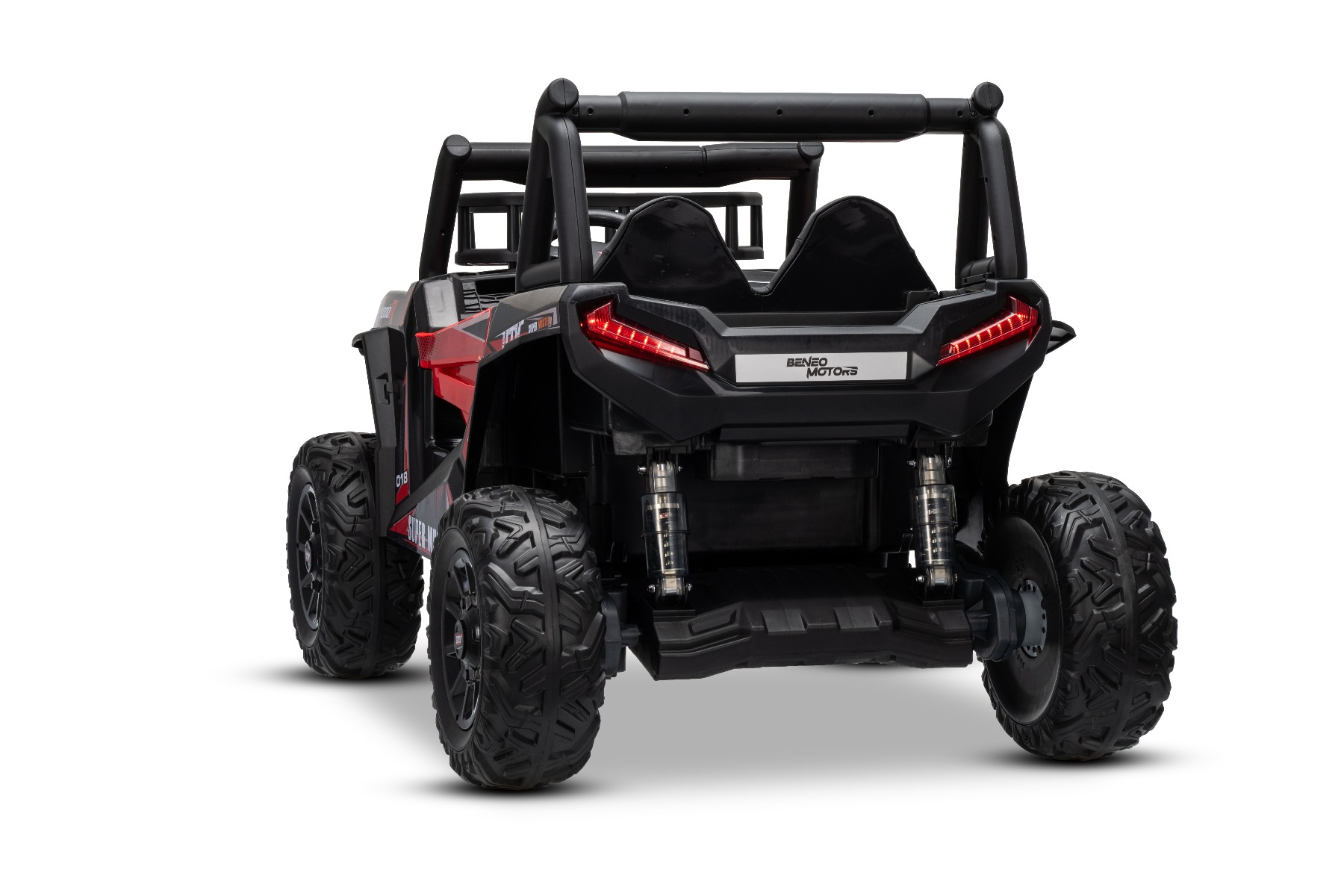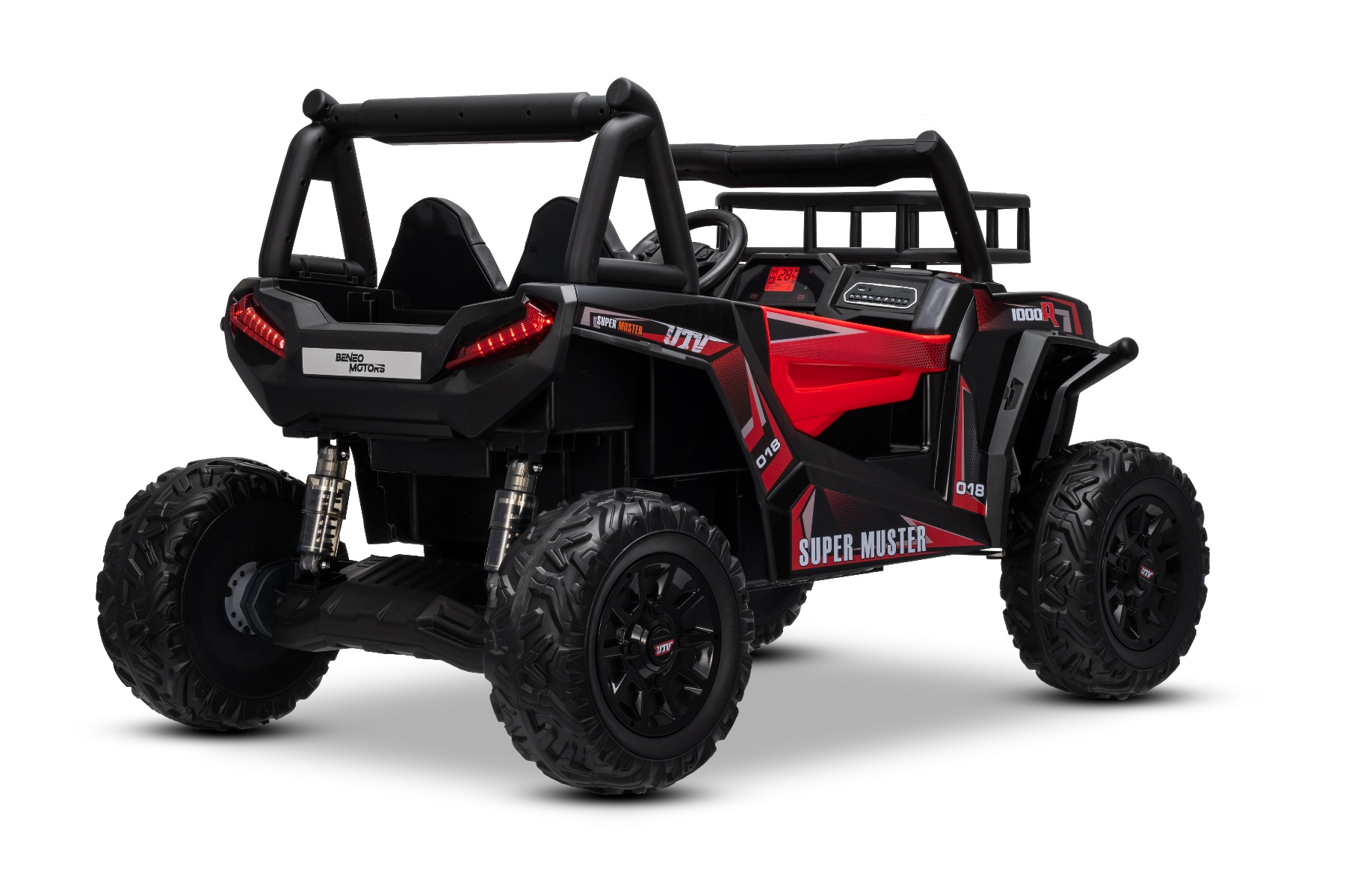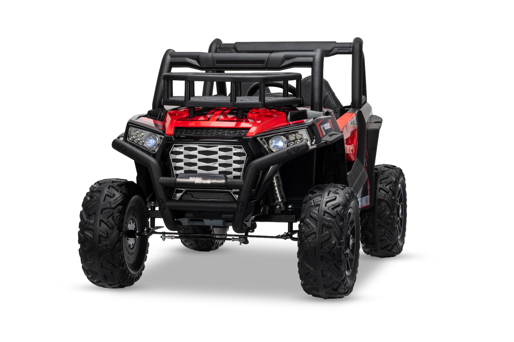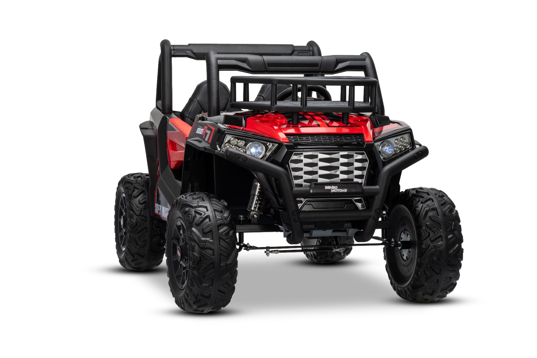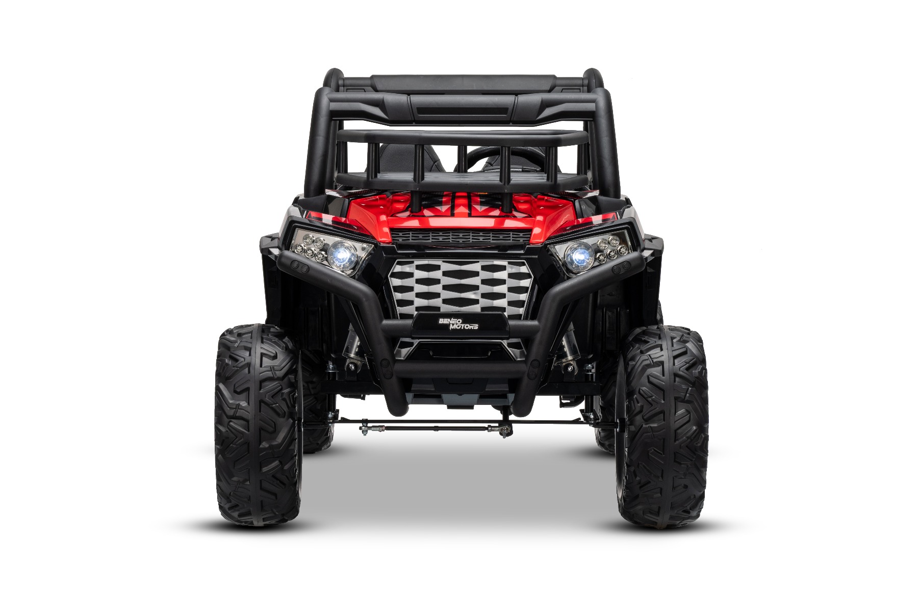 Mașină electrică pentru copii UTV 24V, roșie, două locuri, motor 2 x 200 W, Baterie litiu, roți EVA, osii cu arcuri, frână electrică, scaun tapițat, 2.4 GHz DO, două locuri, USB, AUX