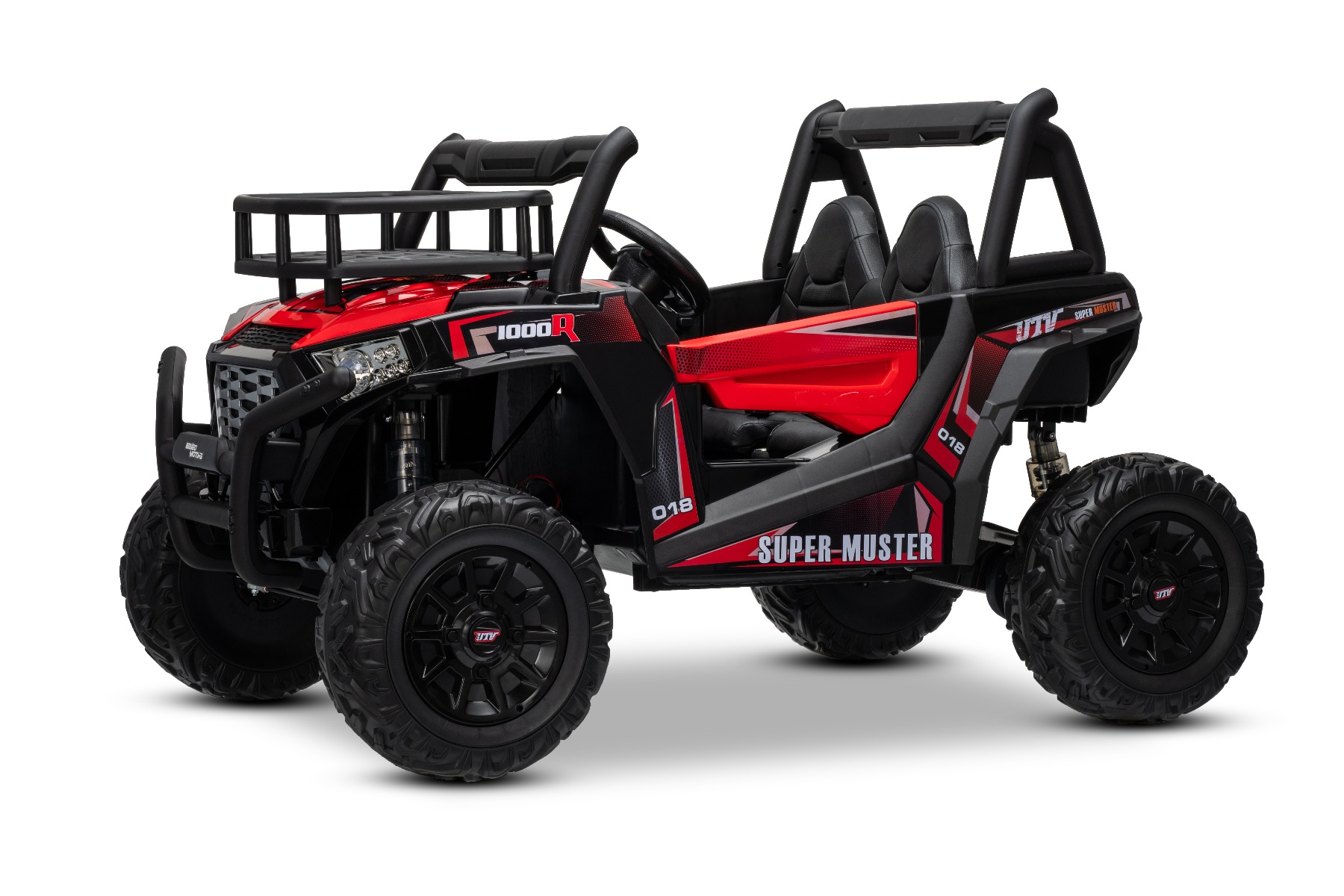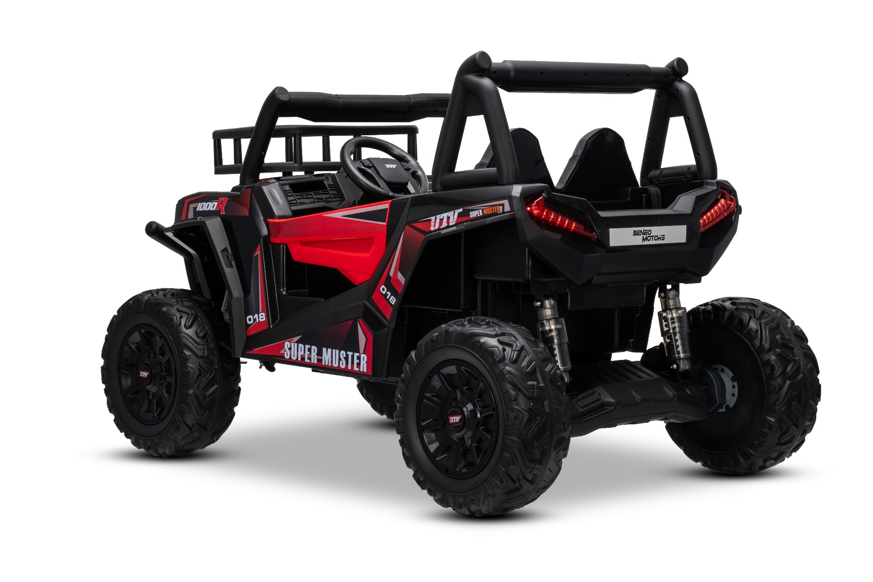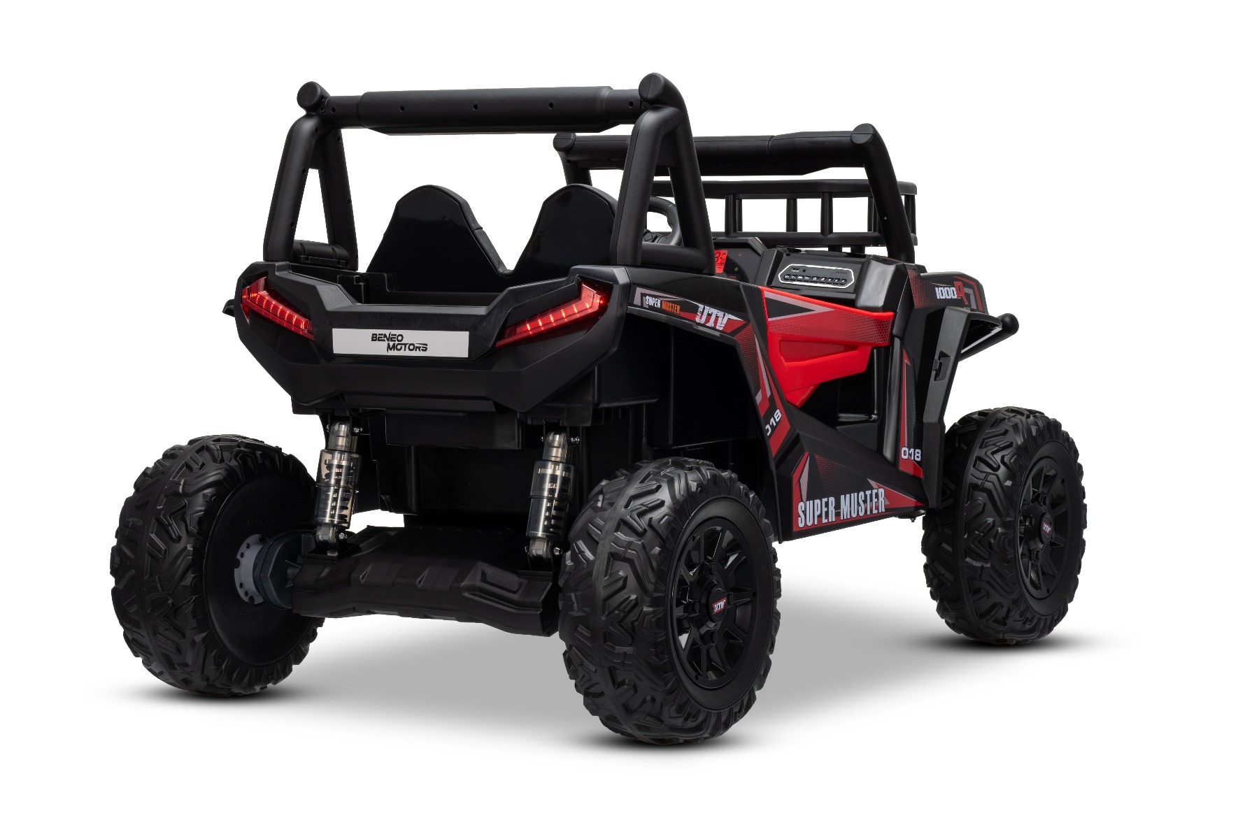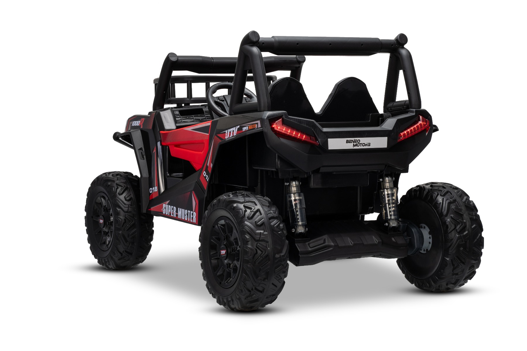 Mașină electrică pentru copii UTV 24V, roșie, două locuri, motor 2 x 200 W, Baterie litiu, roți EVA, osii cu arcuri, frână electrică, scaun tapițat, 2.4 GHz DO, două locuri, USB, AUX
