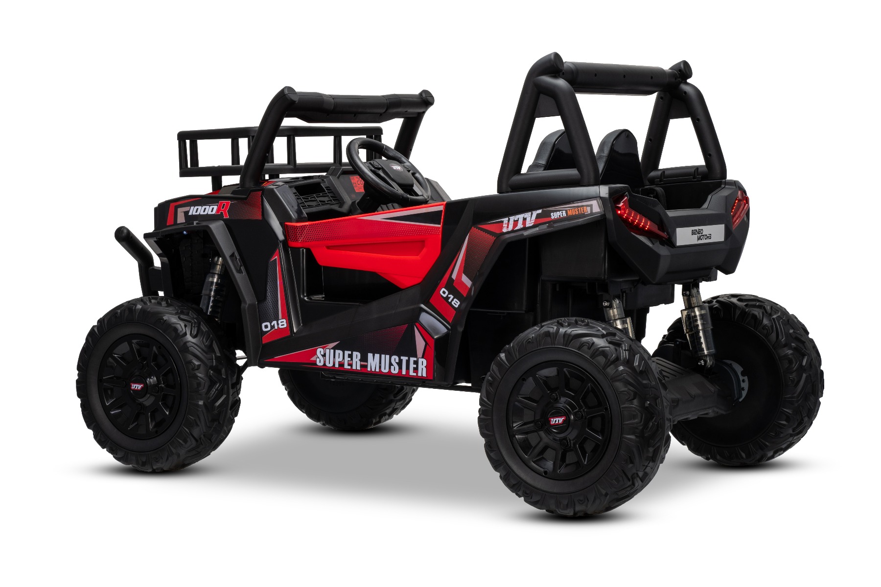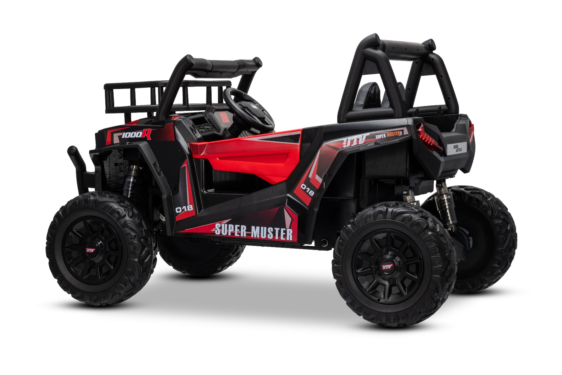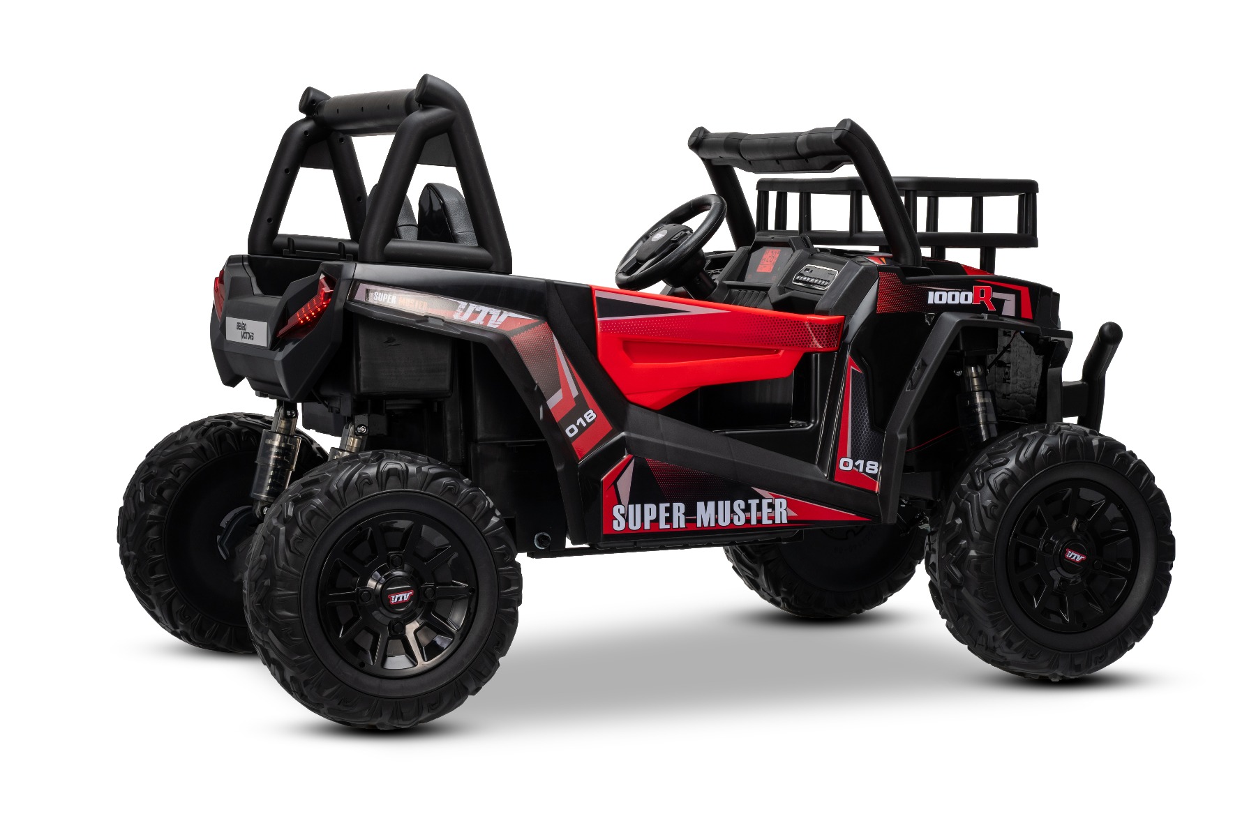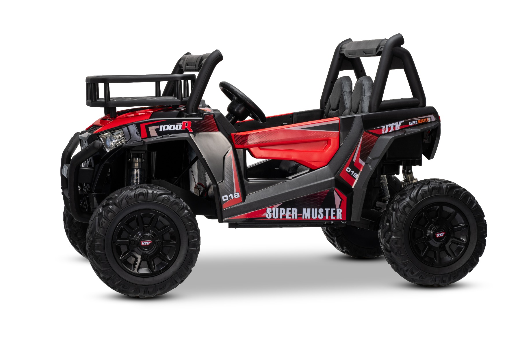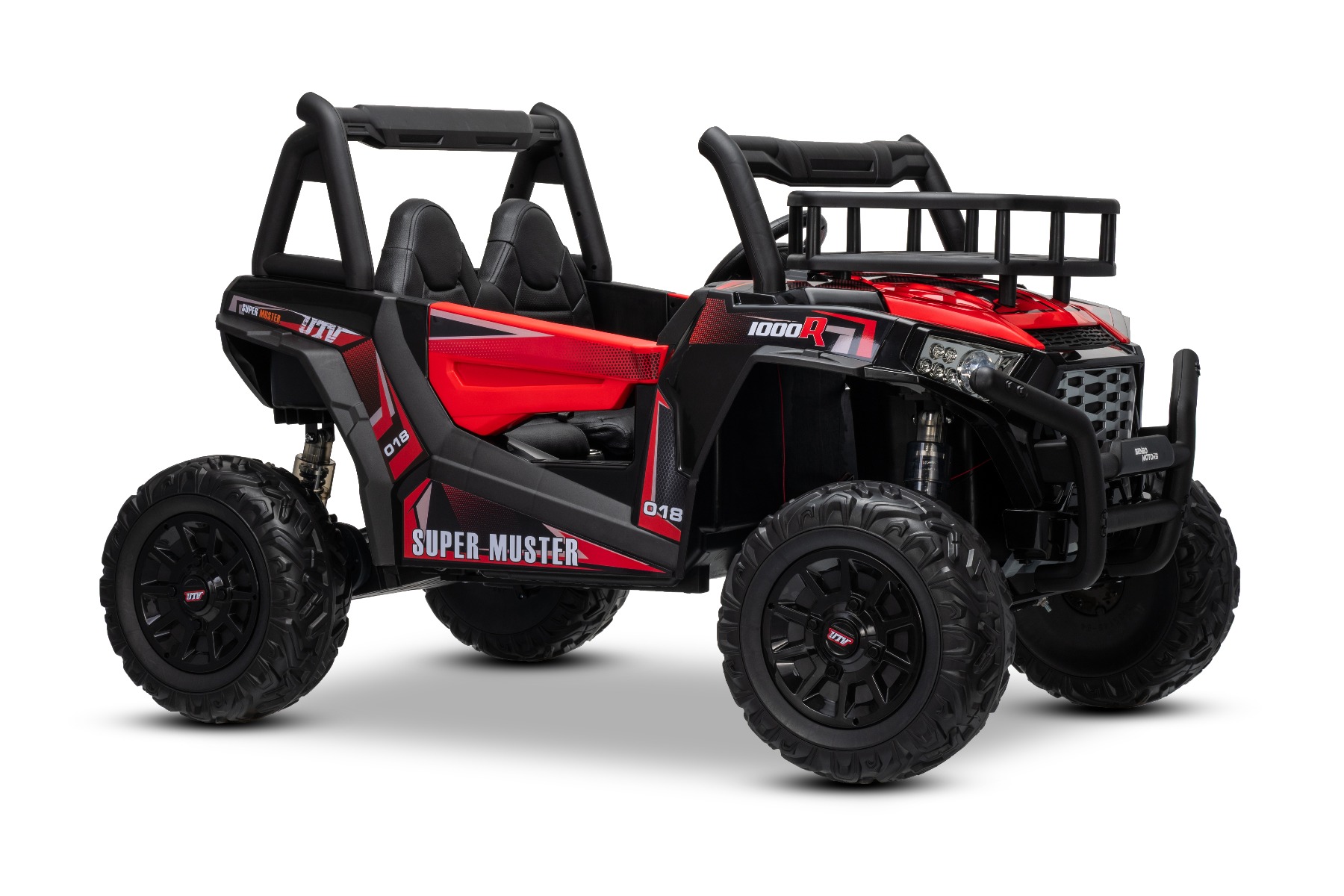 Mașină electrică pentru copii UTV 24V, roșie, două locuri, motor 2 x 200 W, Baterie litiu, roți EVA, osii cu arcuri, frână electrică, scaun tapițat, 2.4 GHz DO, două locuri, USB, AUX