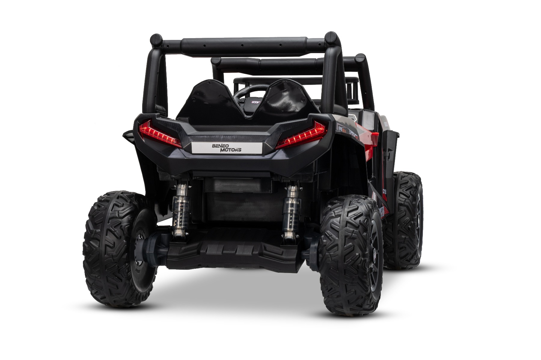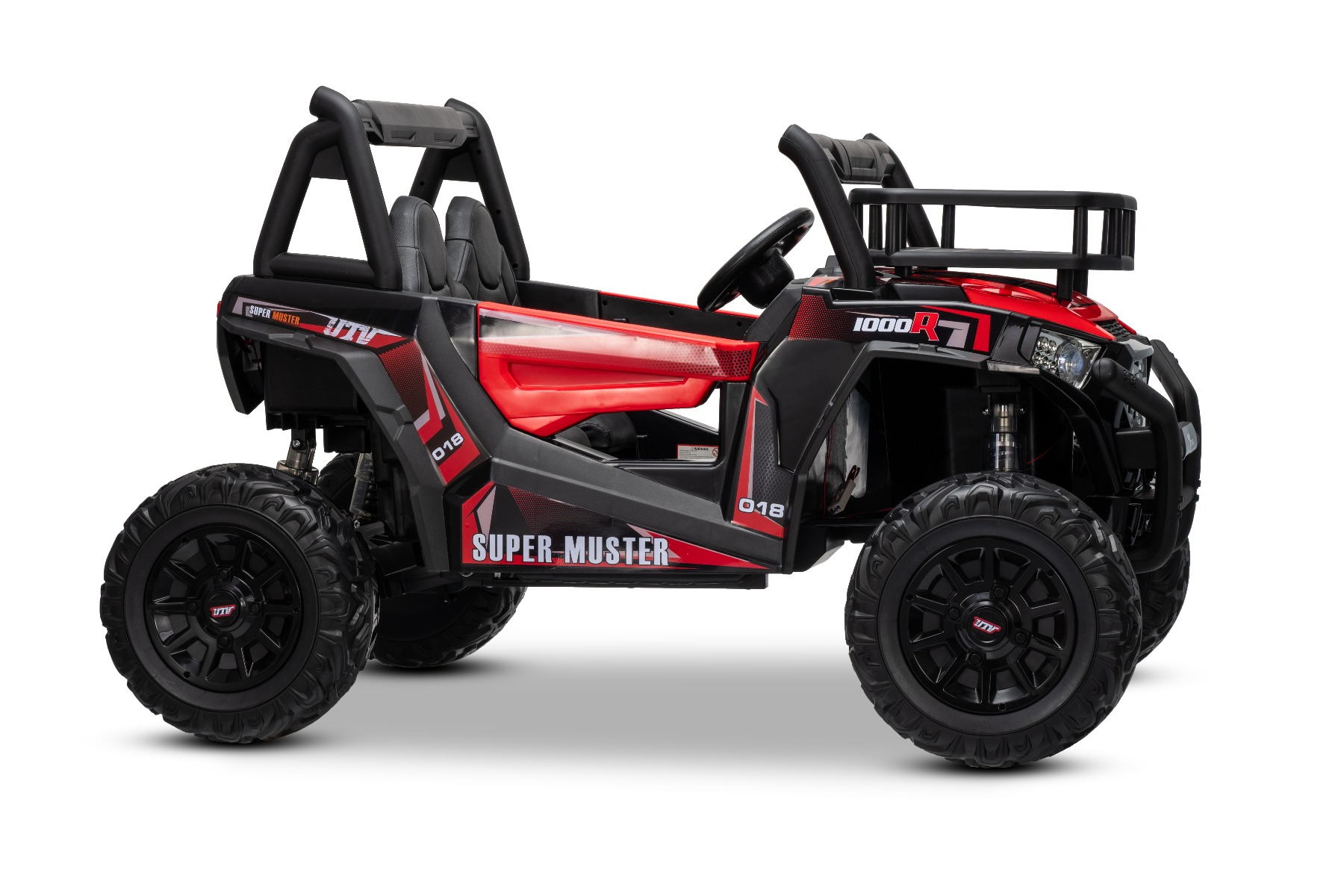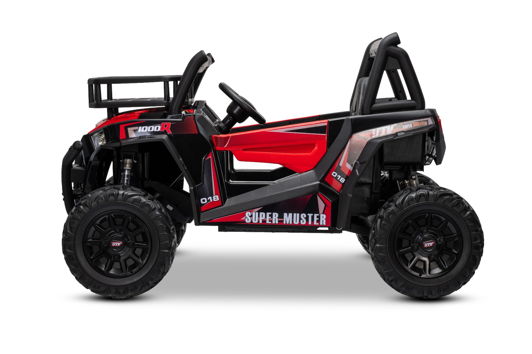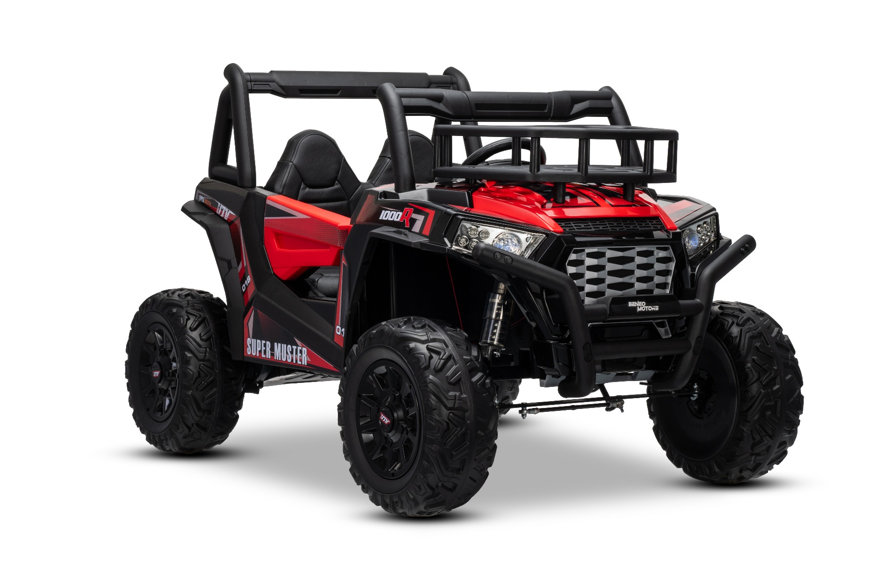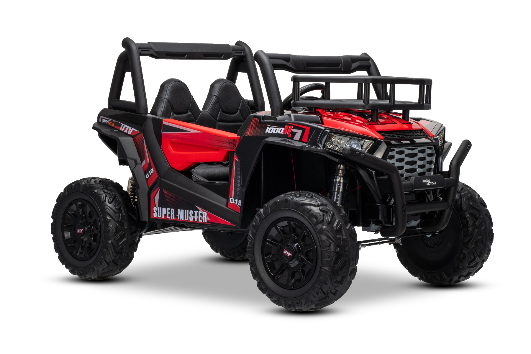 Mașină electrică pentru copii UTV 24V, roșie, două locuri, motor 2 x 200 W, Baterie litiu, roți EVA, osii cu arcuri, frână electrică, scaun tapițat, 2.4 GHz DO, două locuri, USB, AUX