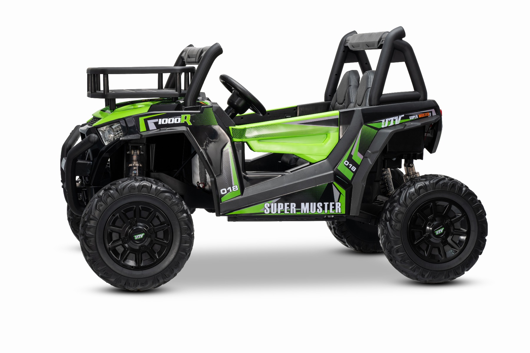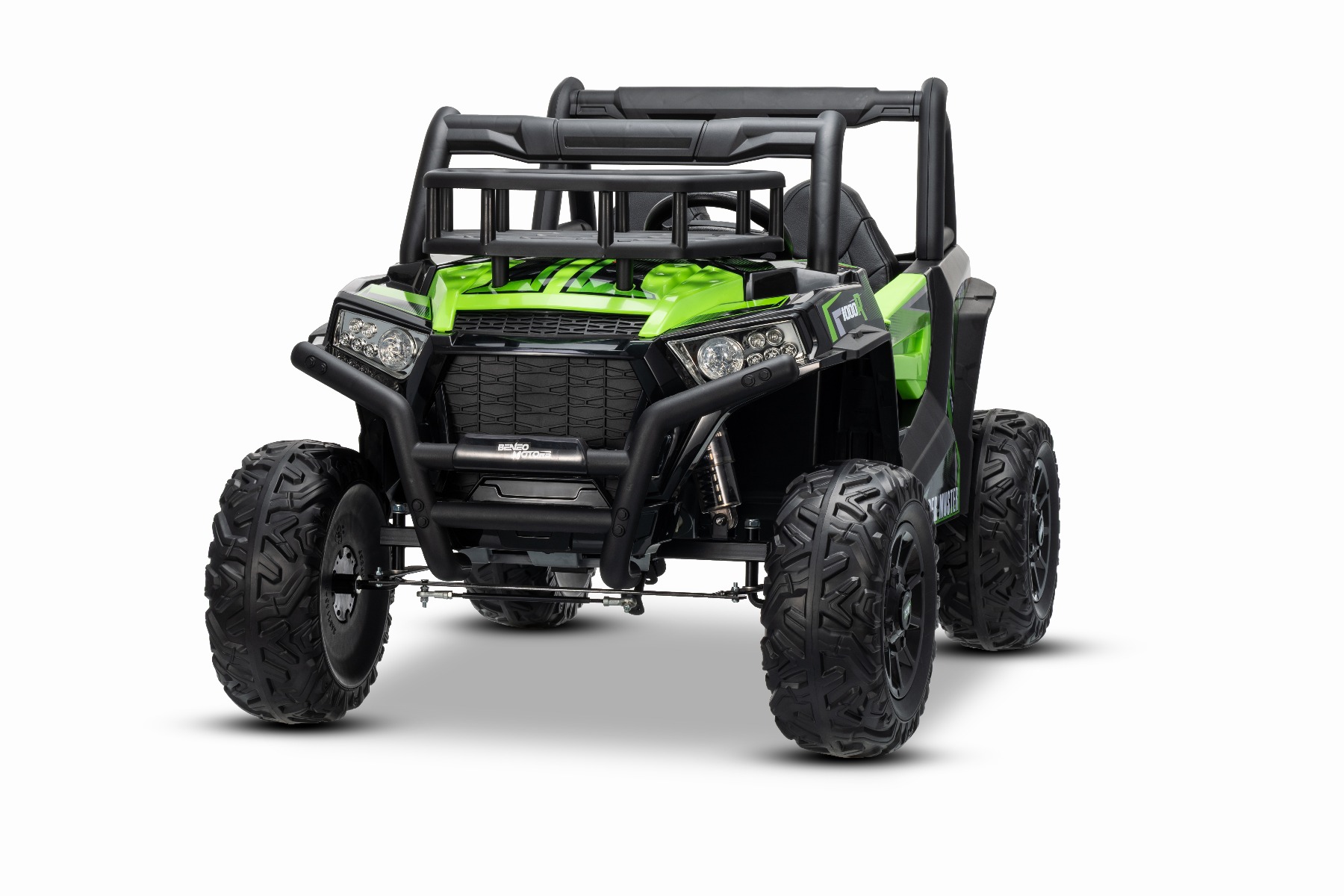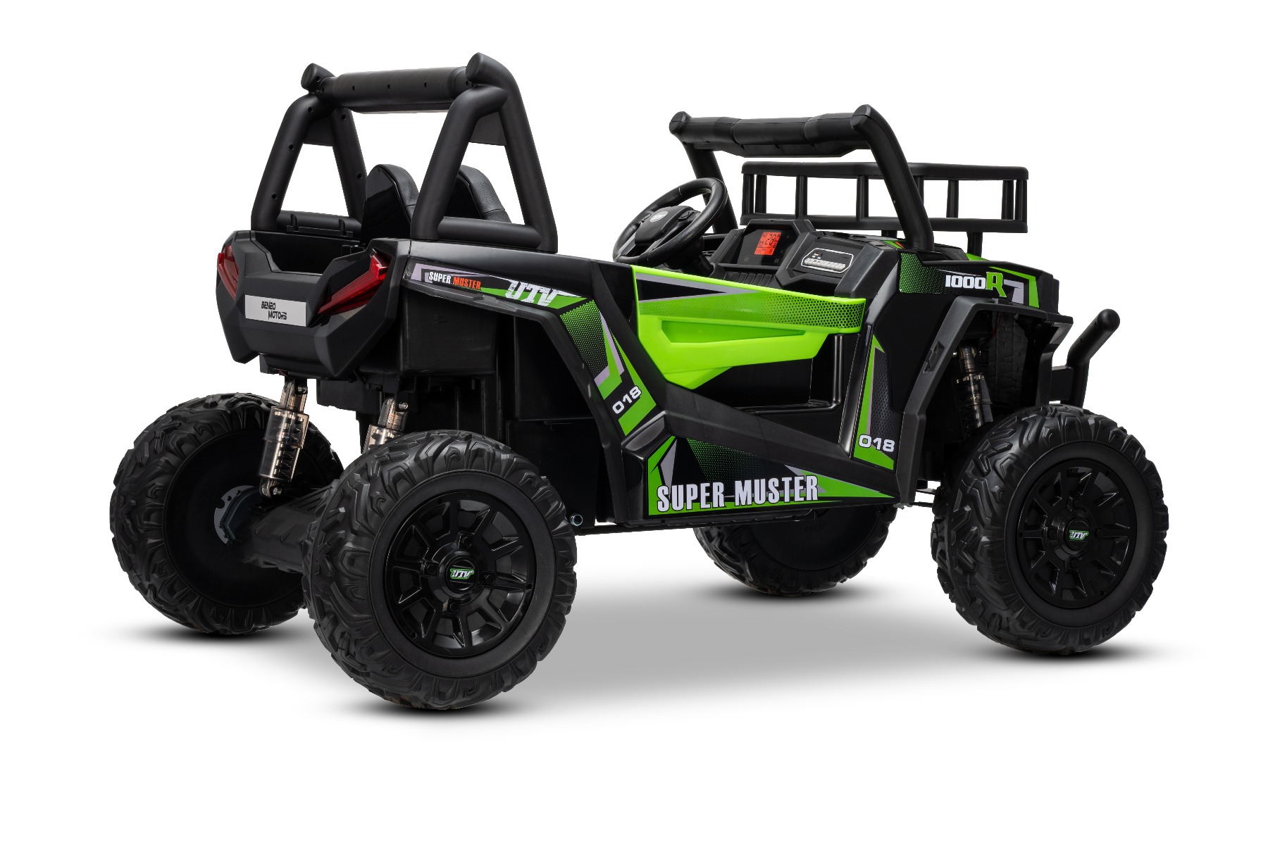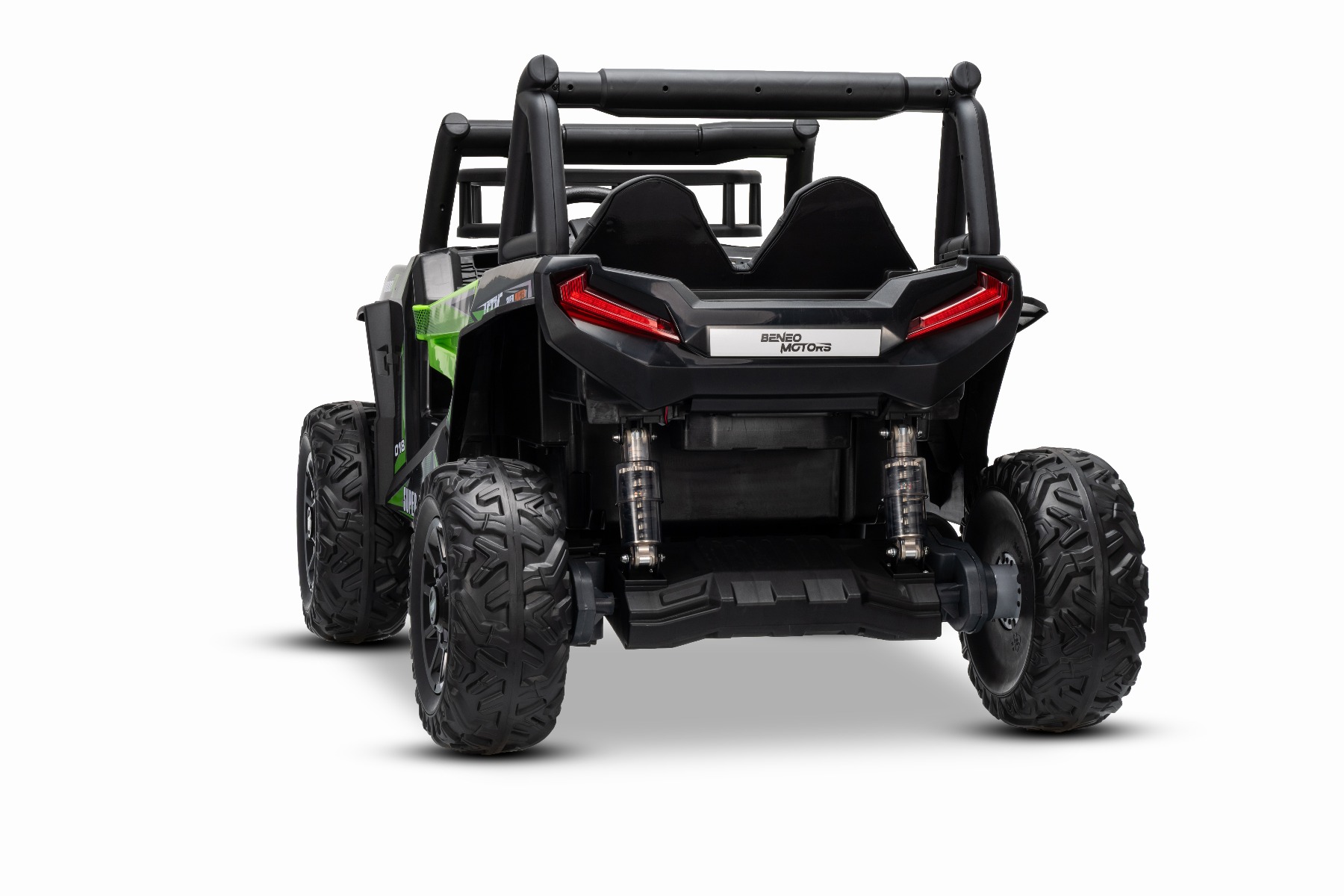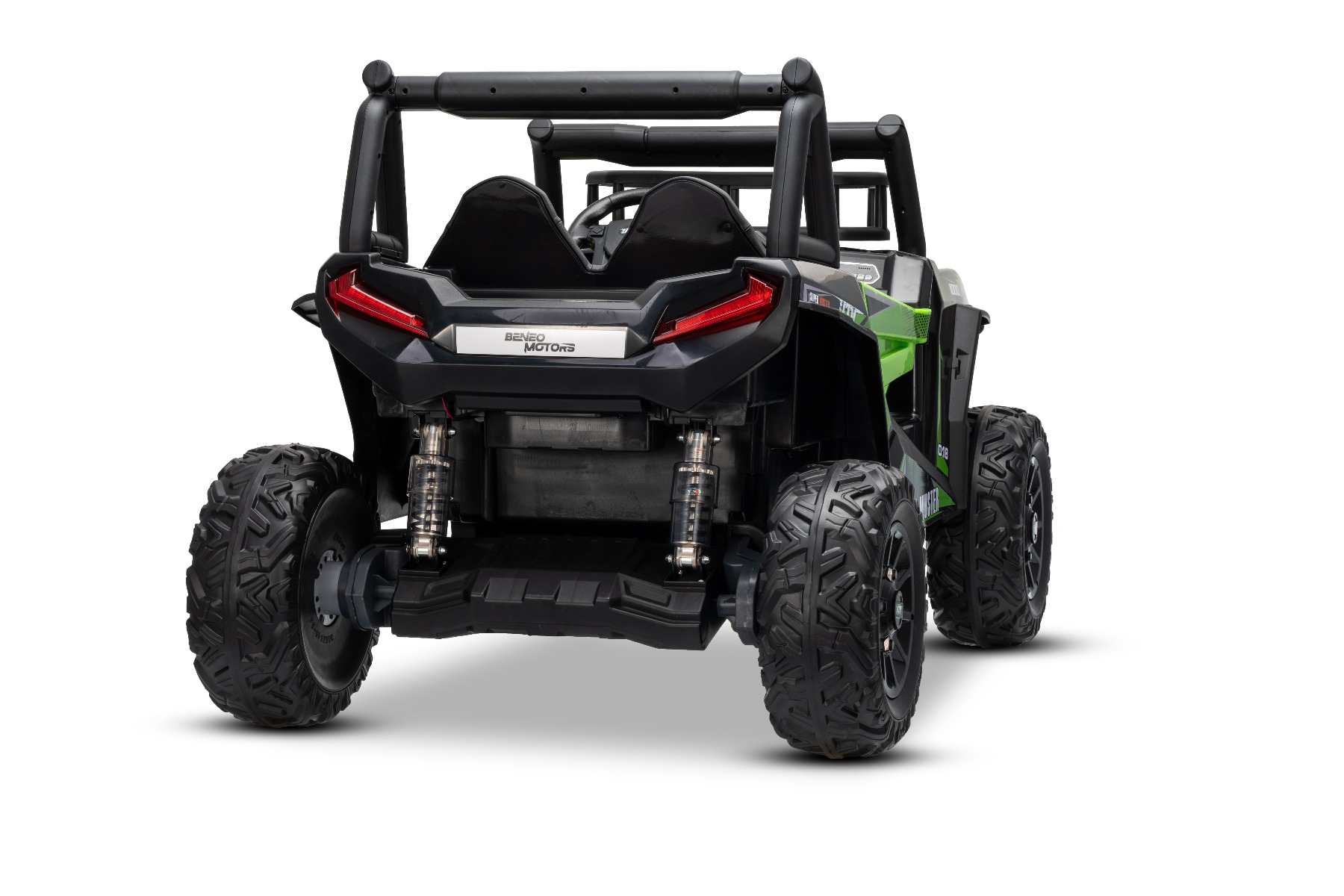 Mașină electrică pentru copii UTV 24V, verde, două locuri, motor 2 x 200 W, Baterie litiu, roți EVA, osii cu arcuri, frână electrică, scaun tapițat, 2.4 GHz DO, două locuri, USB, AUX