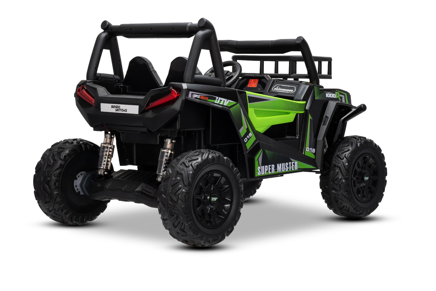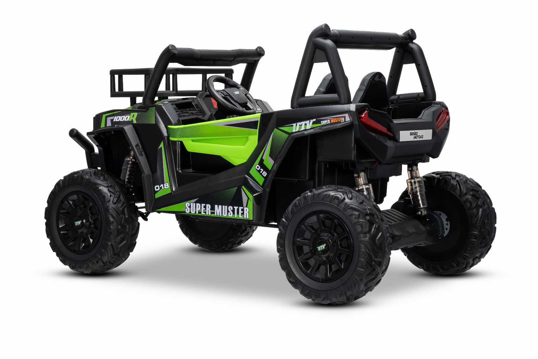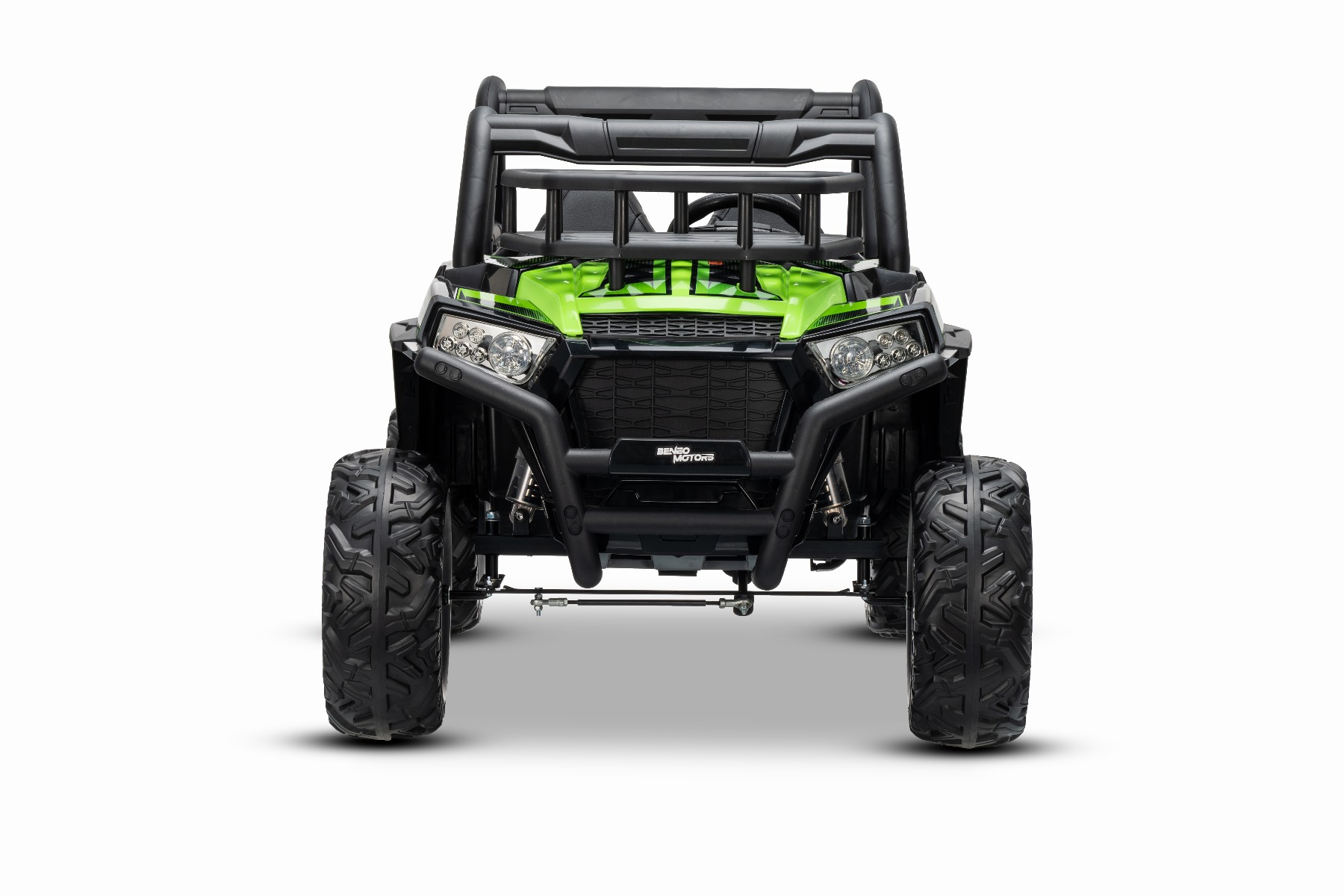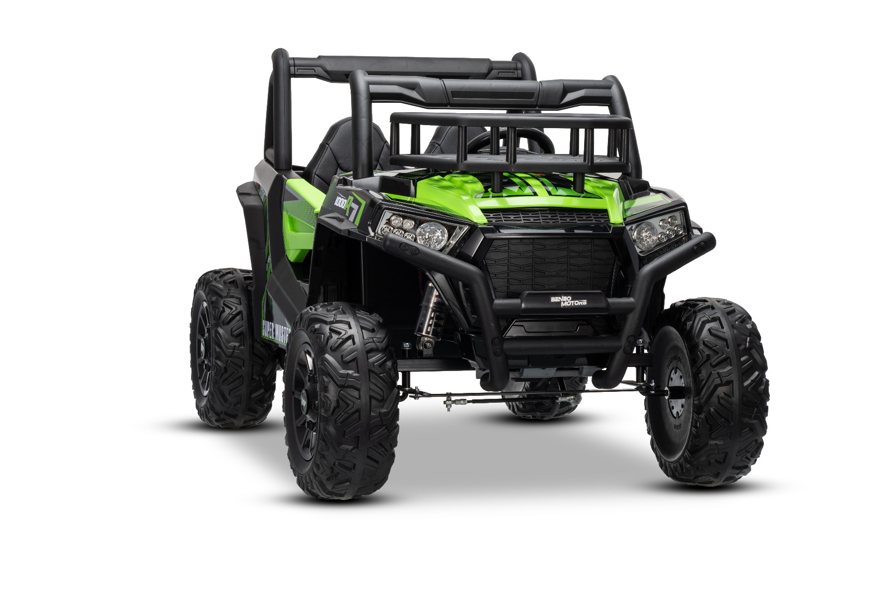 Mașină electrică pentru copii UTV 24V, verde, două locuri, motor 2 x 200 W, Baterie litiu, roți EVA, osii cu arcuri, frână electrică, scaun tapițat, 2.4 GHz DO, două locuri, USB, AUX
