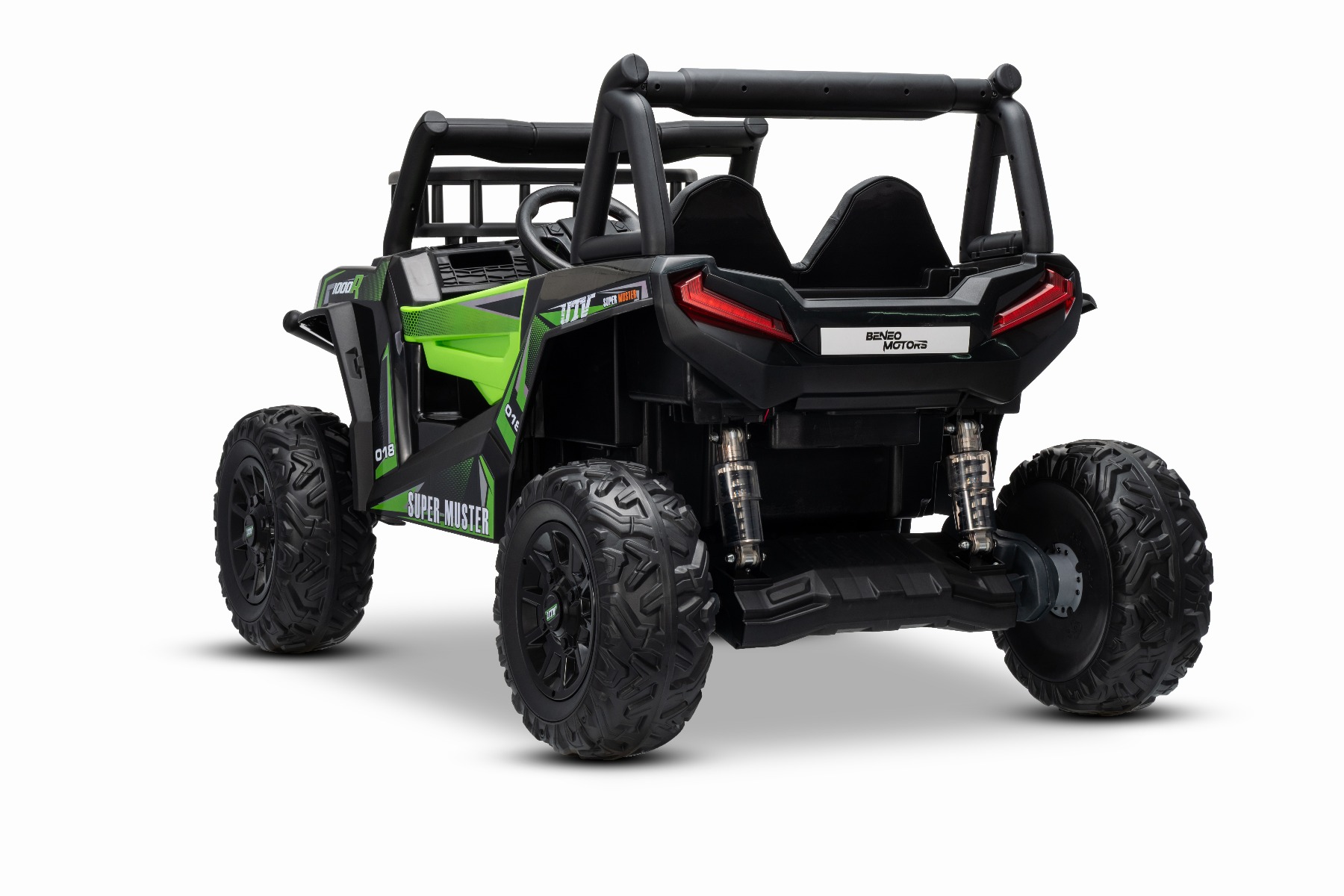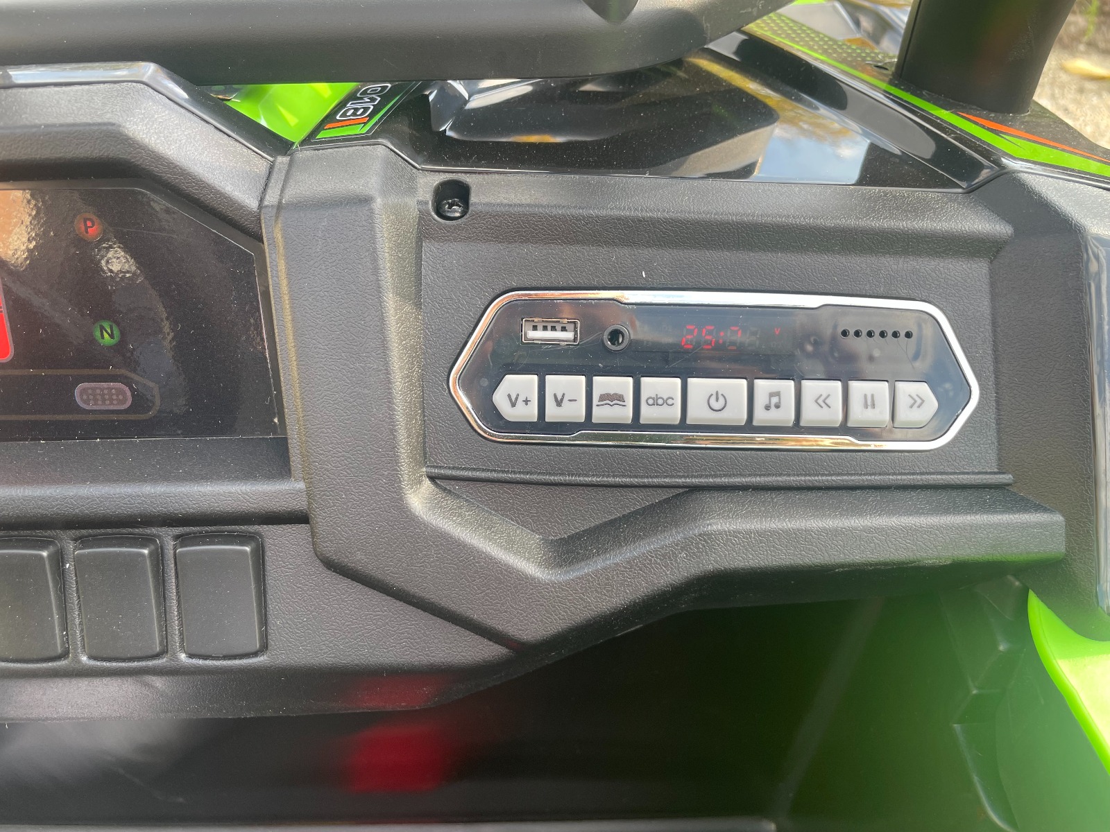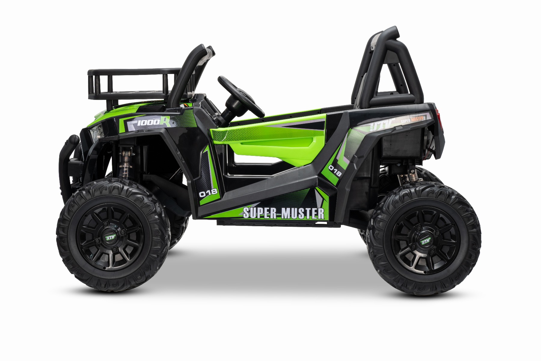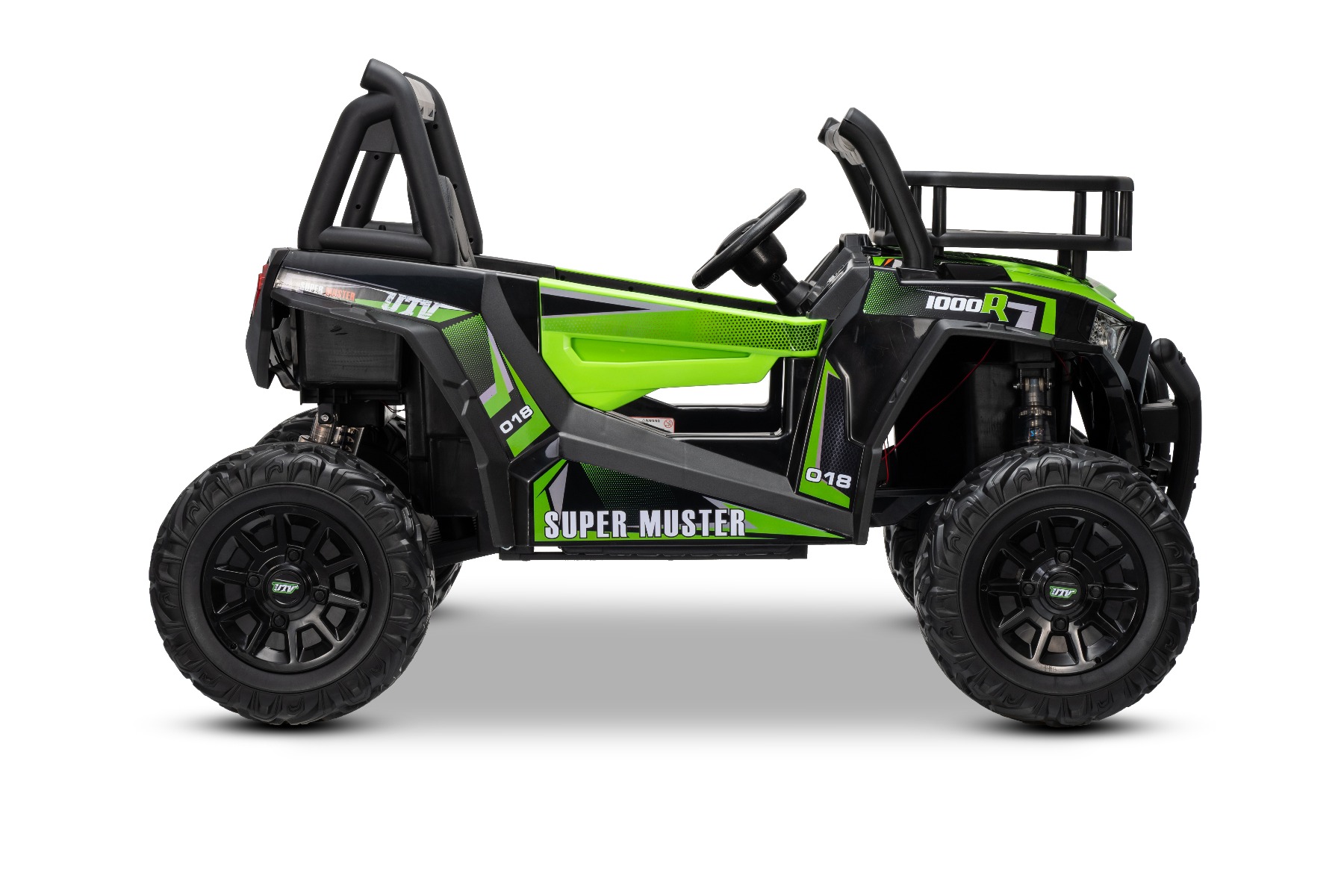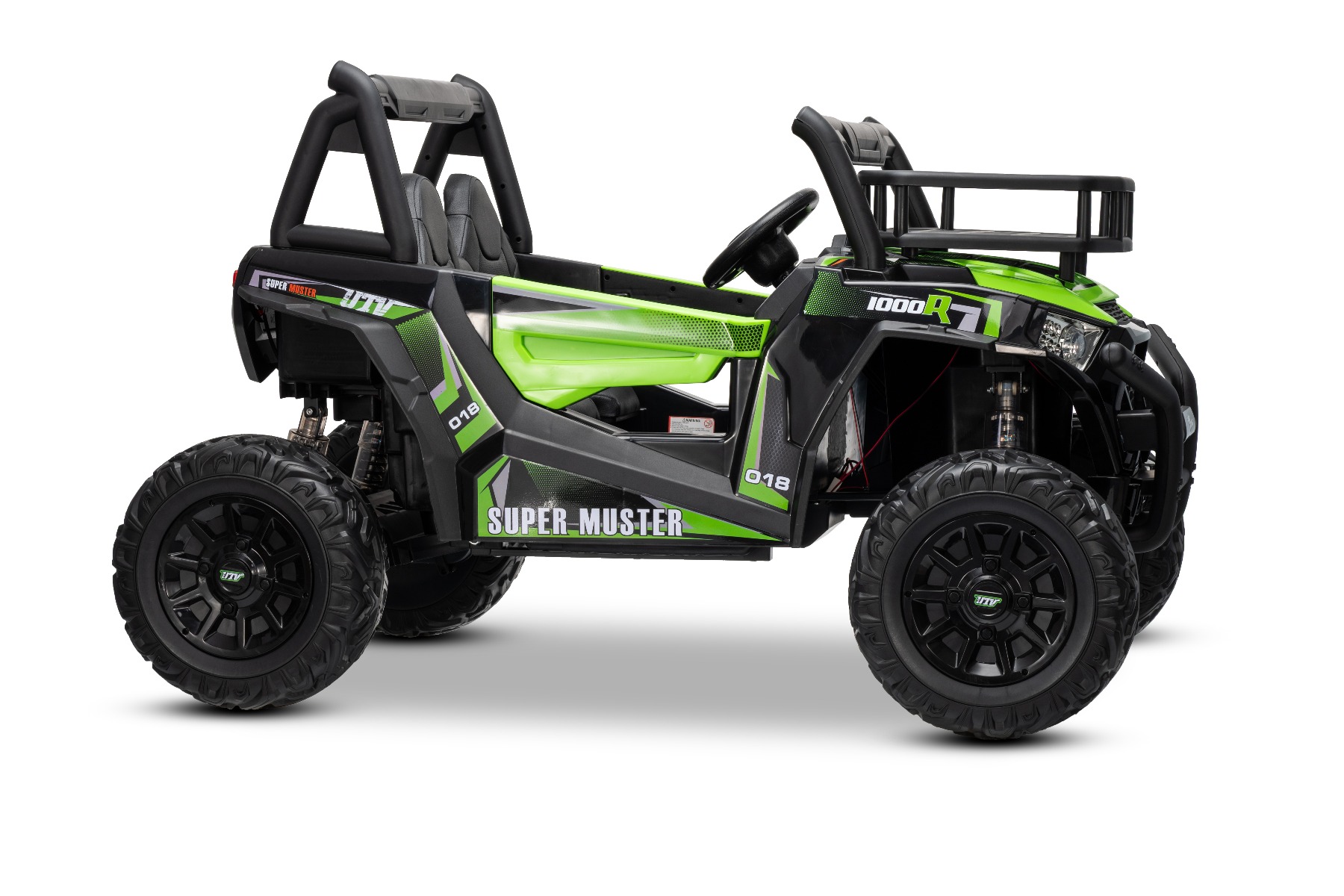 Mașină electrică pentru copii UTV 24V, verde, două locuri, motor 2 x 200 W, Baterie litiu, roți EVA, osii cu arcuri, frână electrică, scaun tapițat, 2.4 GHz DO, două locuri, USB, AUX