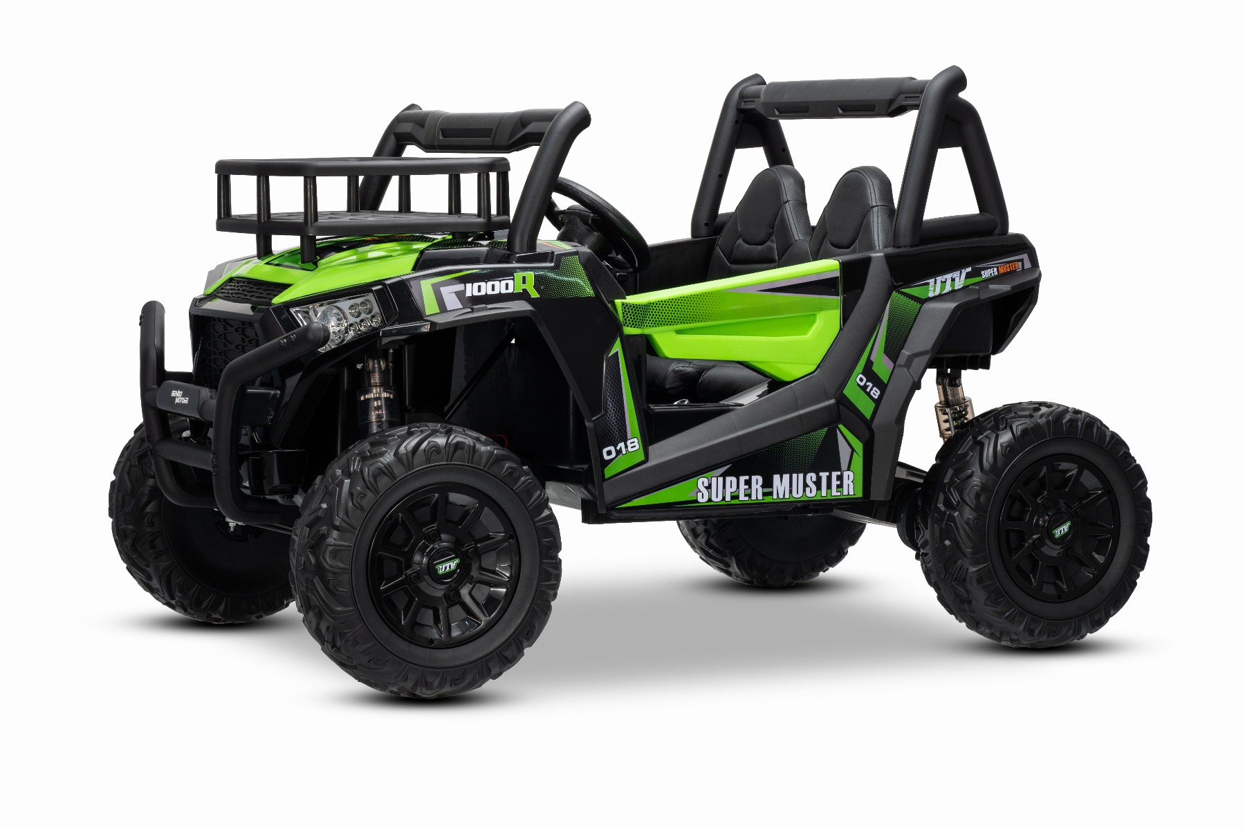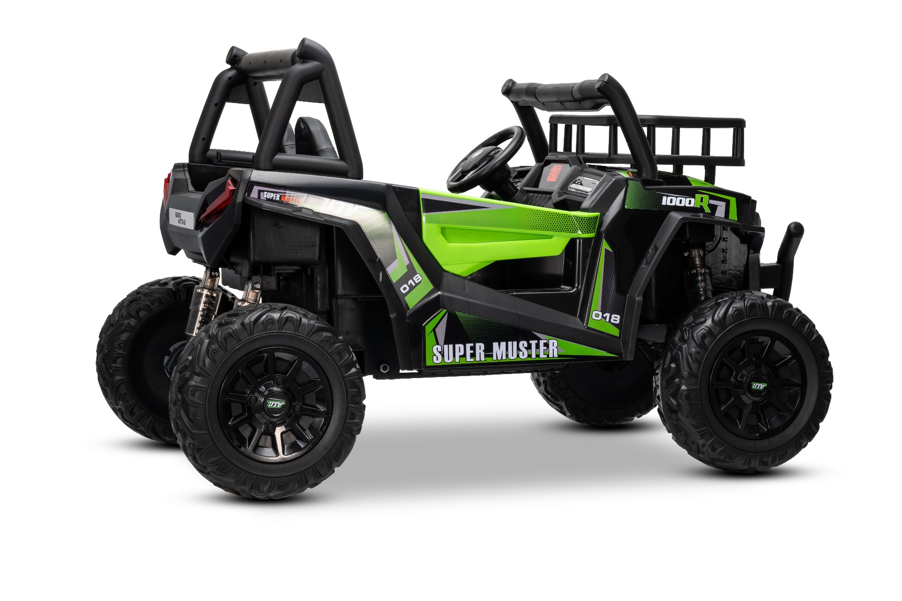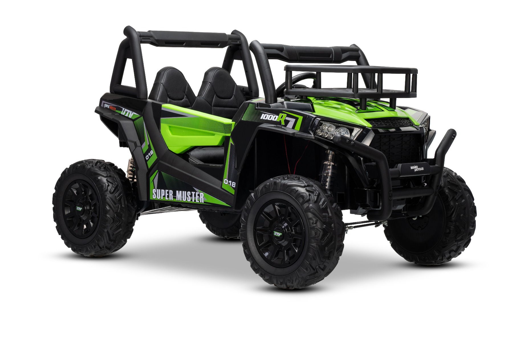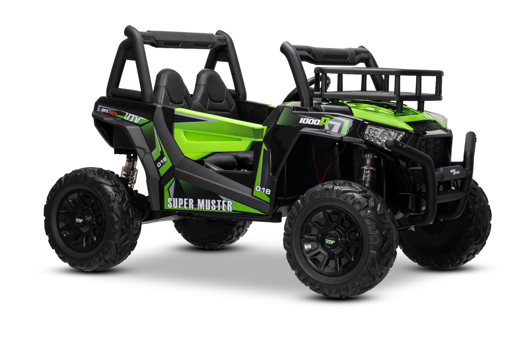 Mașină electrică pentru copii UTV 24V, verde, două locuri, motor 2 x 200 W, Baterie litiu, roți EVA, osii cu arcuri, frână electrică, scaun tapițat, 2.4 GHz DO, două locuri, USB, AUX