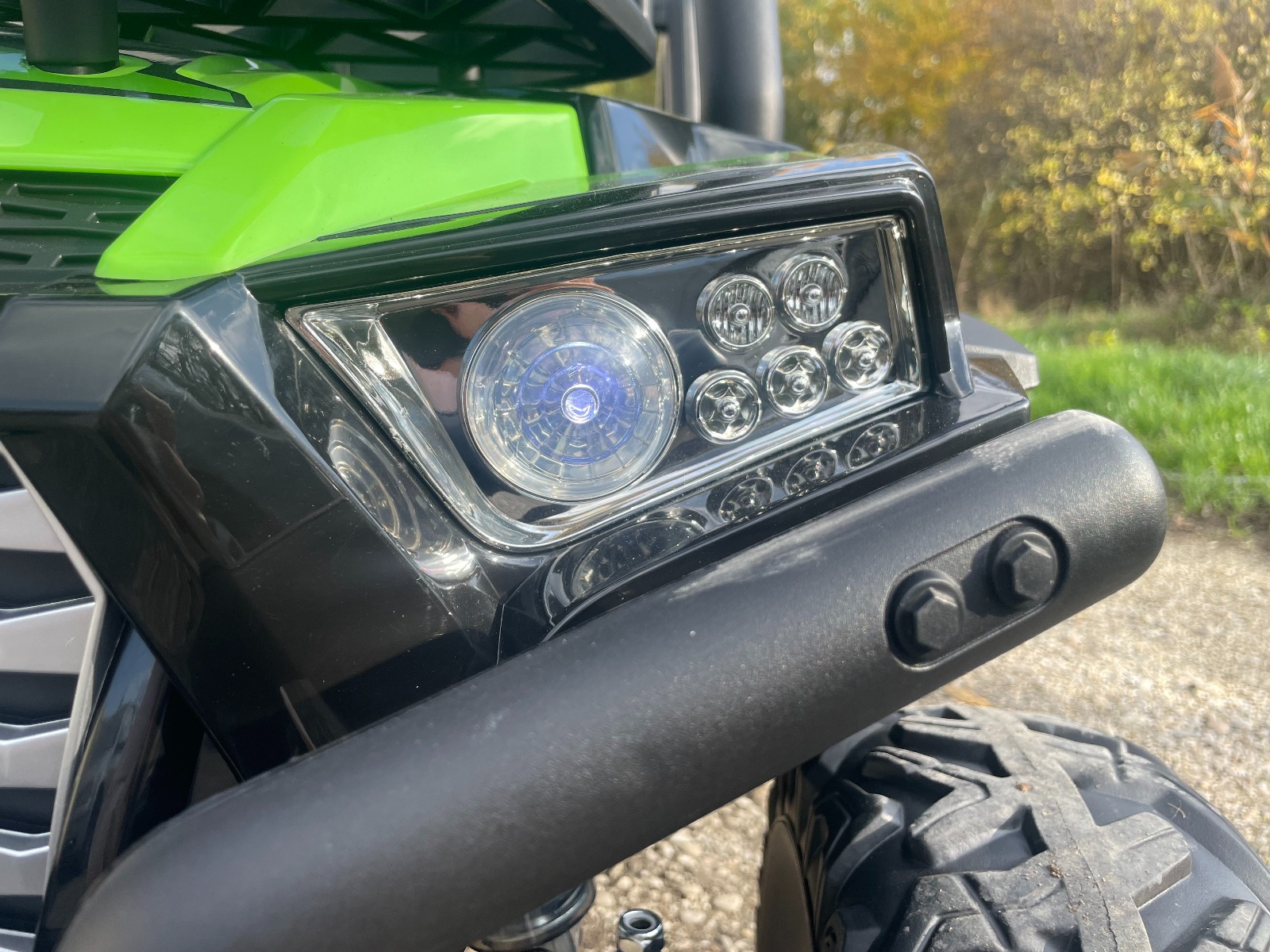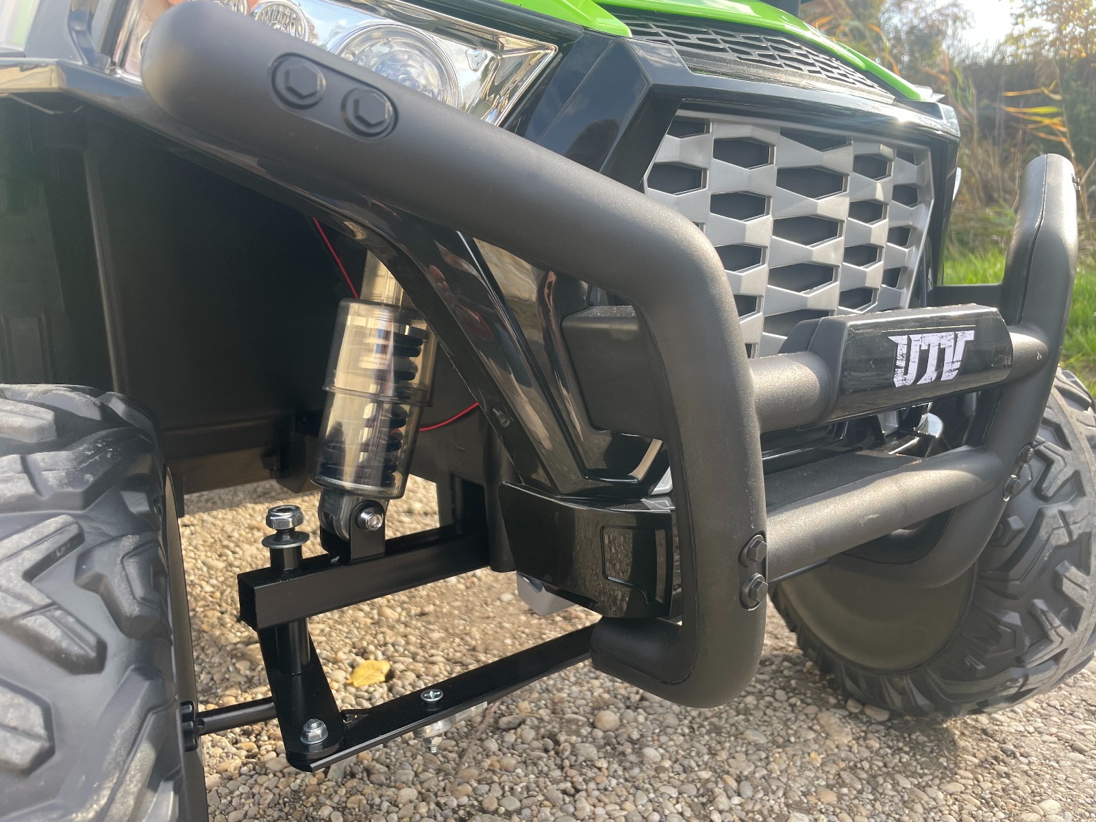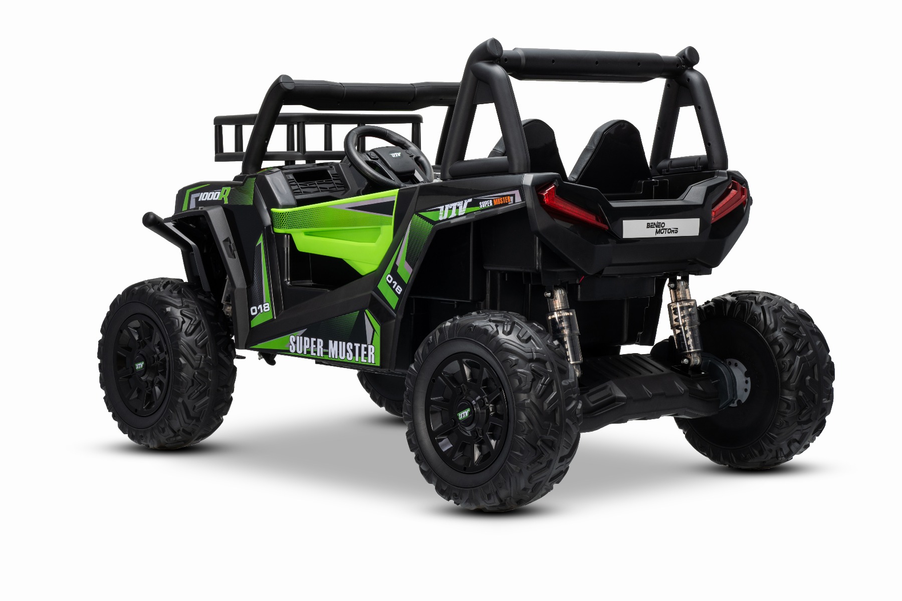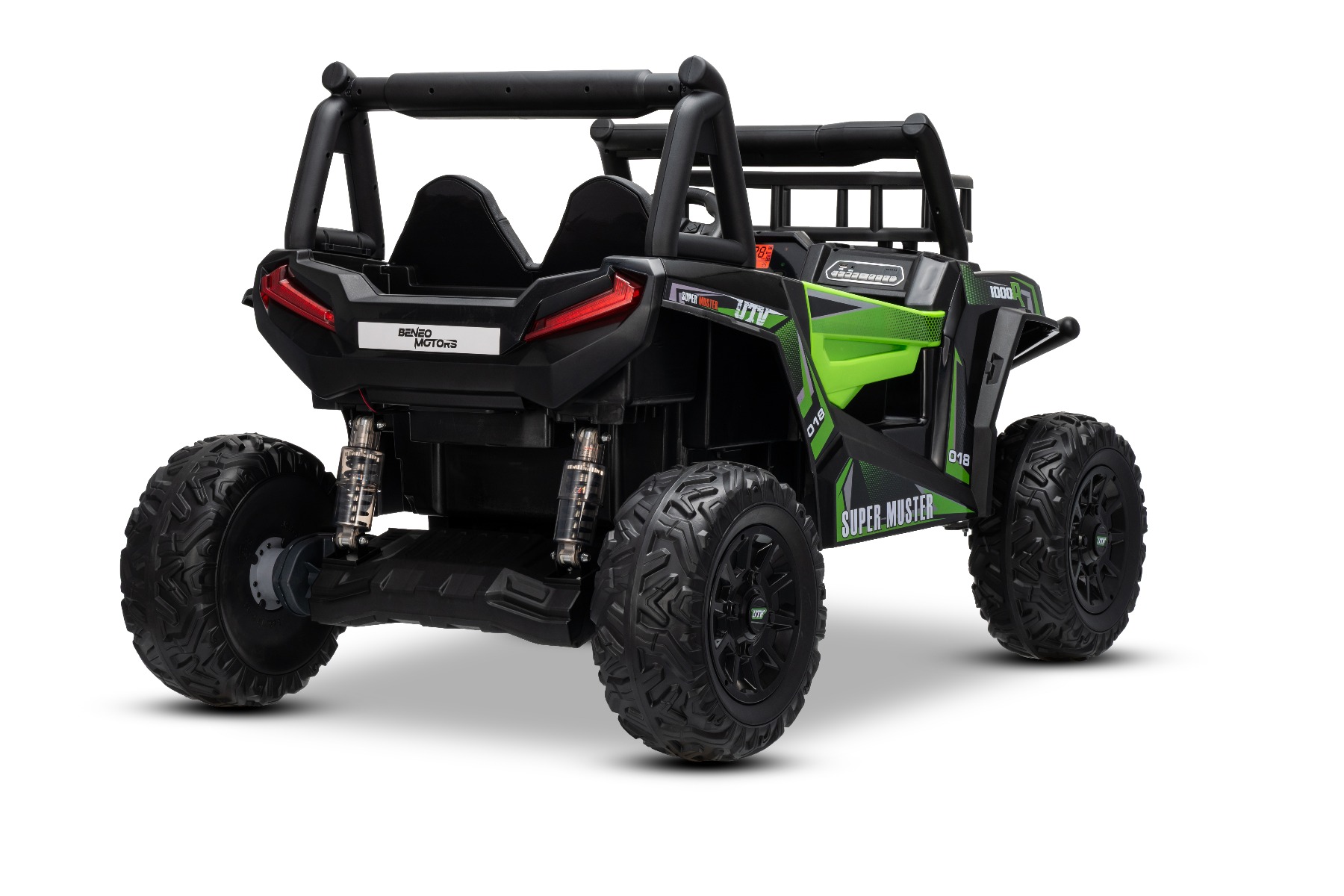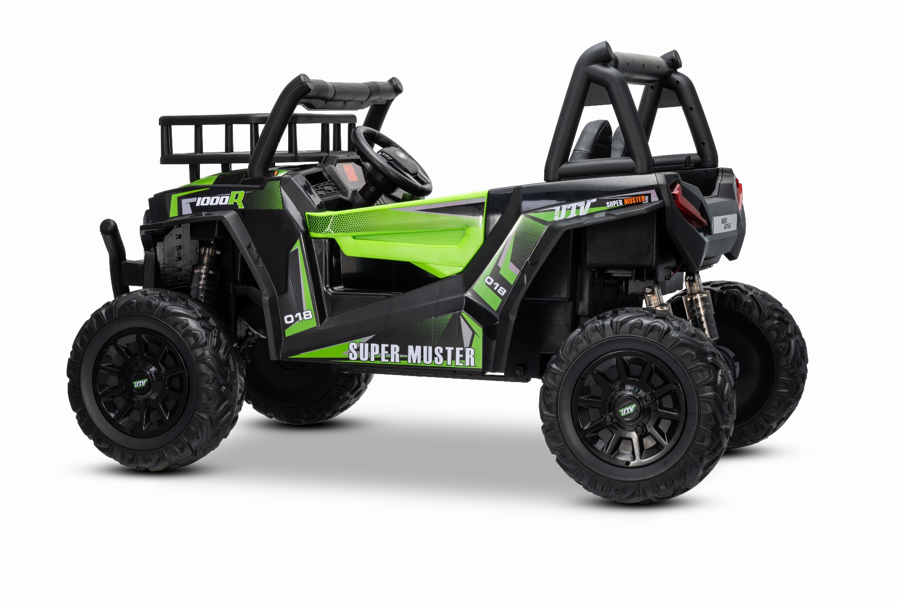 Mașină electrică pentru copii UTV 24V, verde, două locuri, motor 2 x 200 W, Baterie litiu, roți EVA, osii cu arcuri, frână electrică, scaun tapițat, 2.4 GHz DO, două locuri, USB, AUX