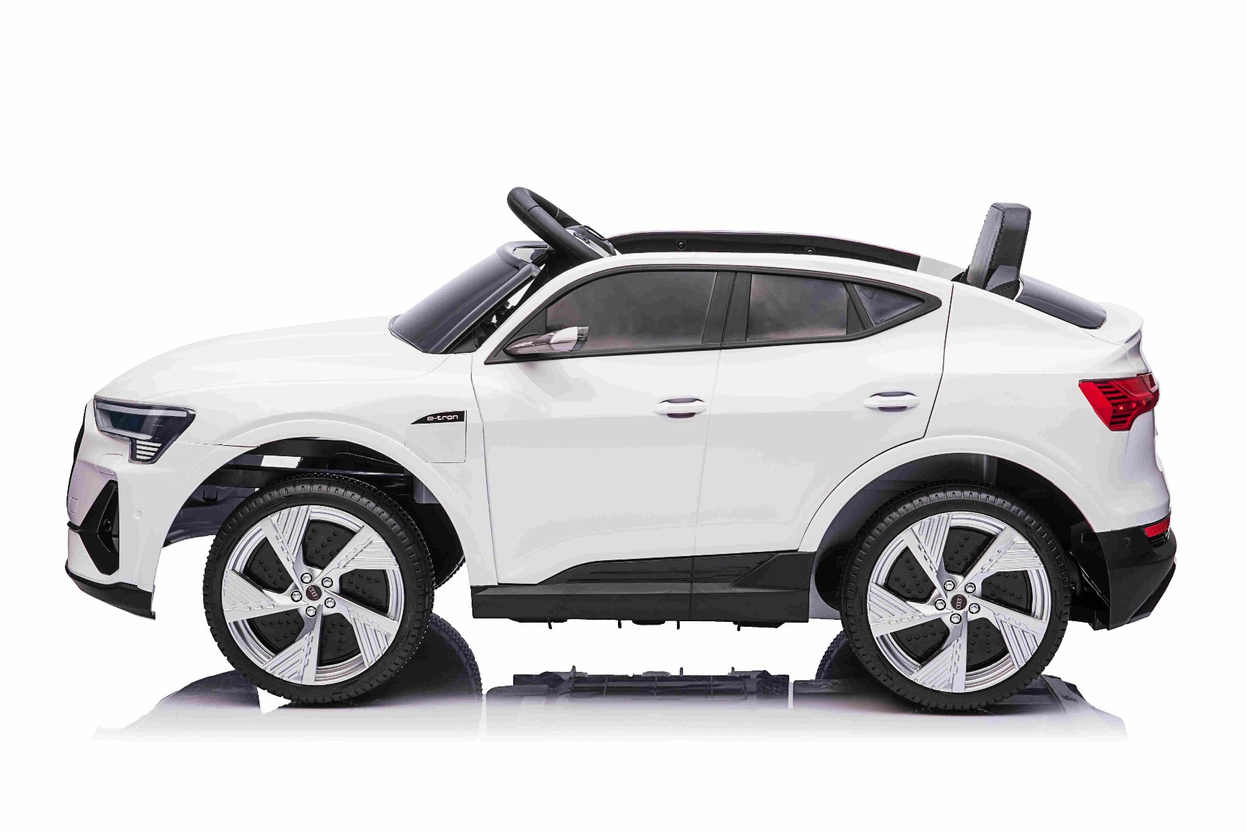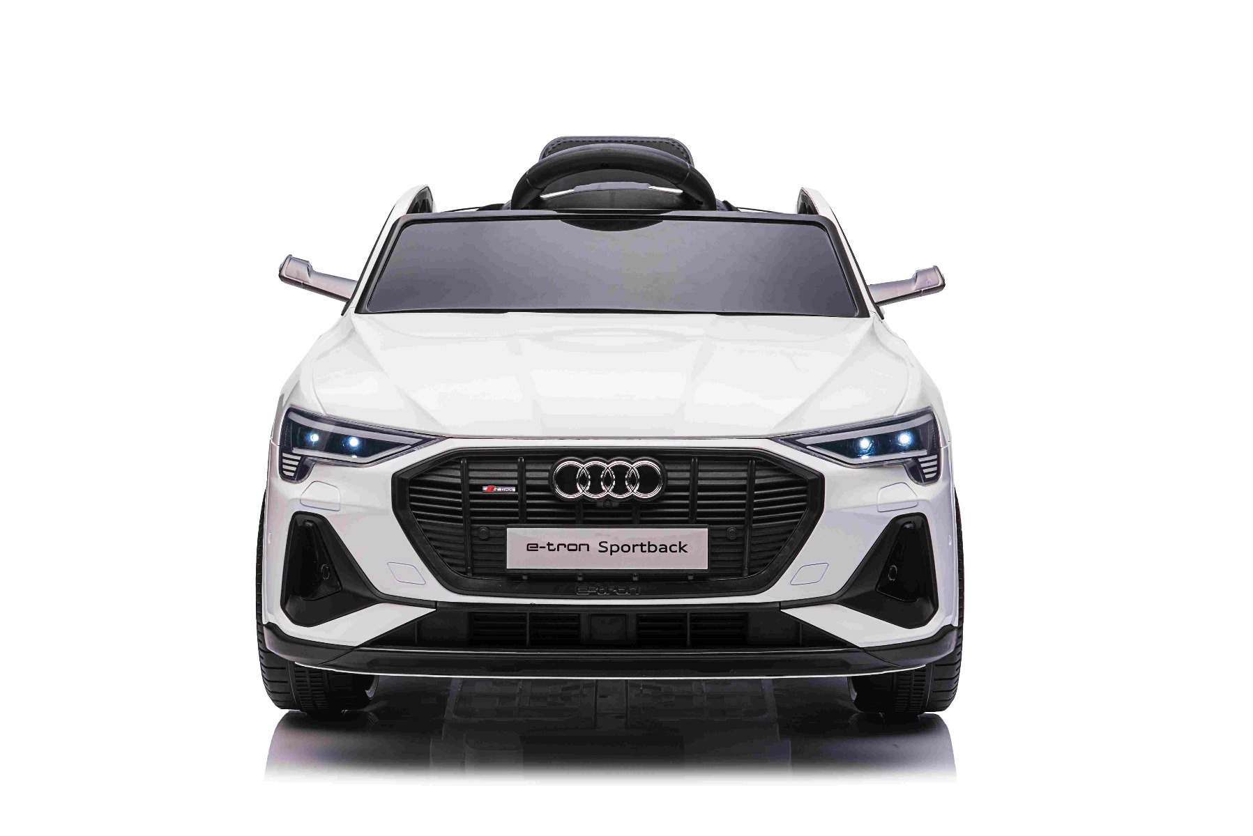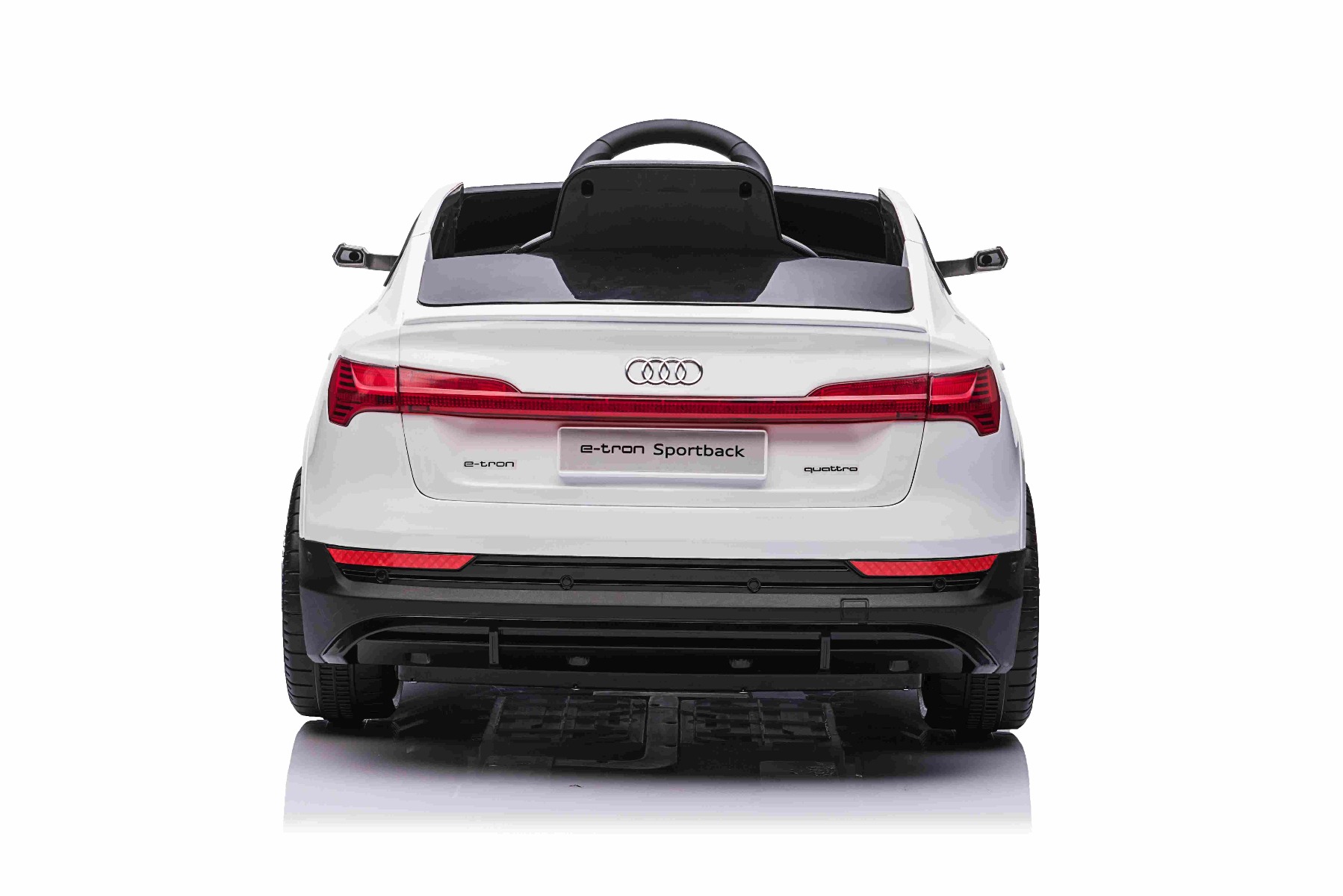 Maşinuţa electrica copii Audi E-tron Sportback 12V, alb, scaun lat cu un singur loc și centură de siguranță cu prindere în trei puncte, telecomandă 2.4 GHz, intrare USB/AUX, suspensie, baterie litiu, lumini LED, motor 2 x 25W, licență ORIGINALĂ