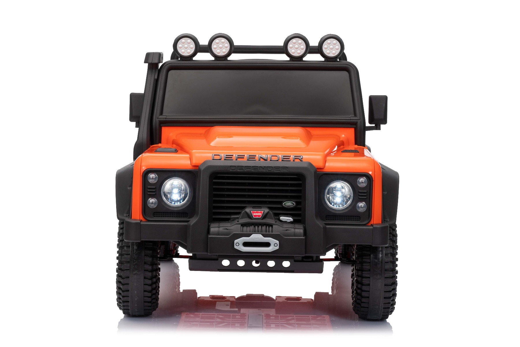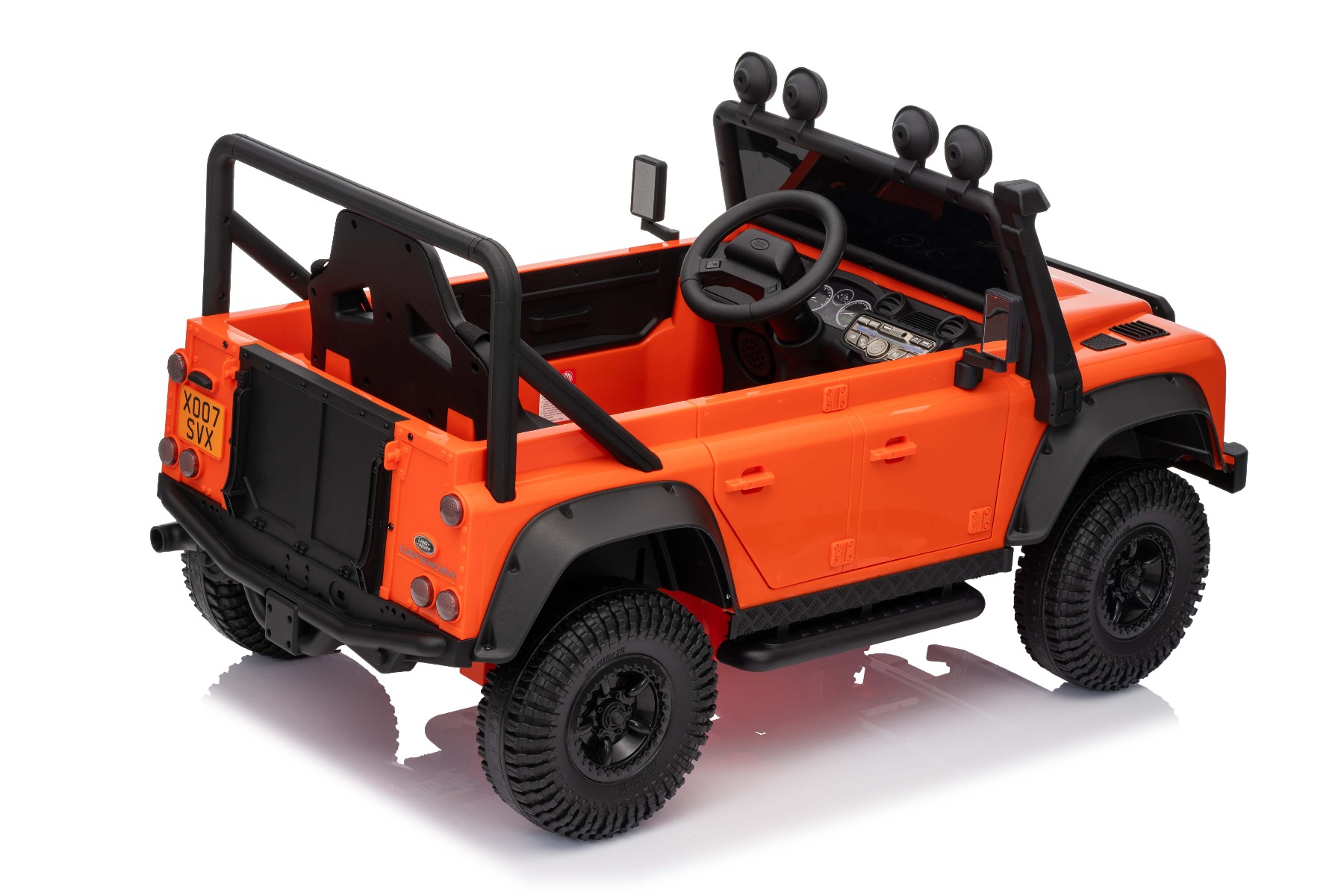 Maşinuţa electrica copii Land Rover Defender 110 SVX 12V, portocaliu, tracțiune 4X4, lumini LED, suspensii față și spate, telecomandă 2.4 GHz, intrare USB/Aux, Bluetooth, baterie litiu, motor 4 X 25W, licență ORIGINALĂ