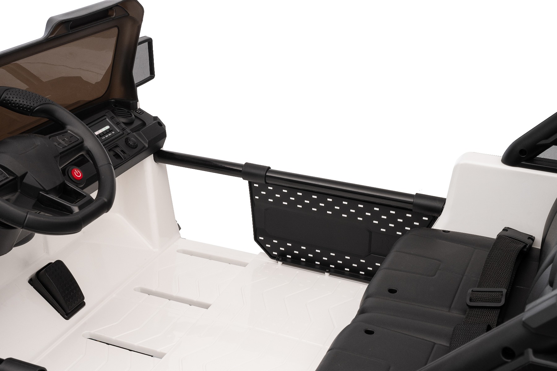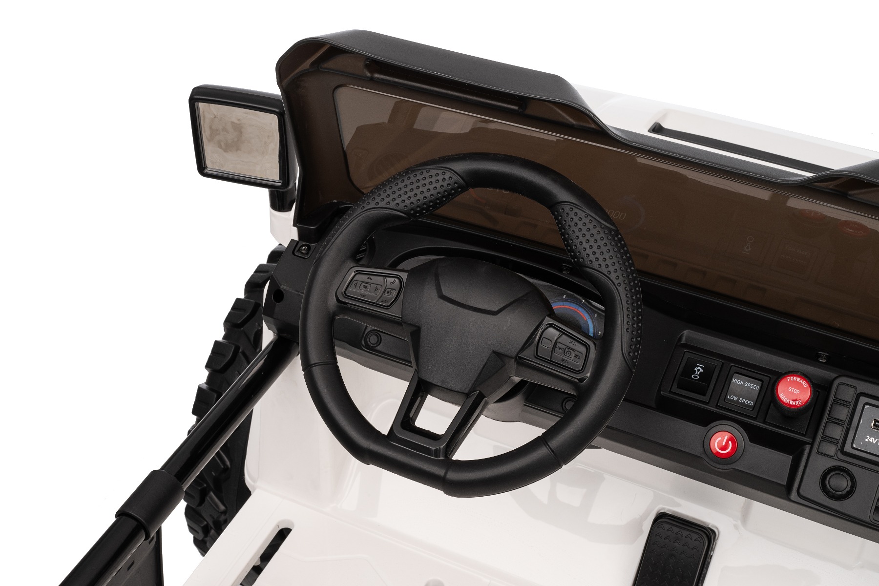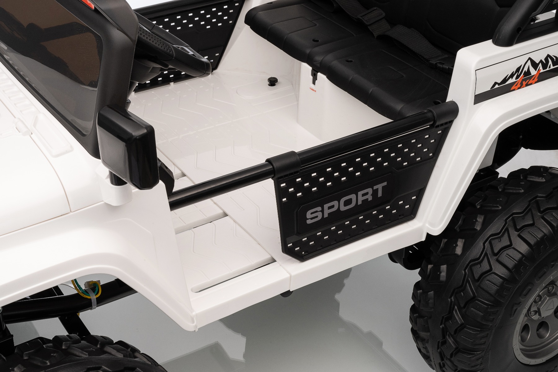Mașină electrică de jucărie Offride 24V Tracțiune 4X4 NOU: Baterie litiu (21,6 V/5 Ah), Cadru reglabil Mașina electrică Offride de înaltă performanță, cu o capacitate de încărcare de până la 60 kg, pentru condus real, fără restricții în comparație cu mașinile clasice off-road. Datorită șasiului înalt și a roților gigantice cu diametrul de 40 cm și a construcției metalice, acest model este foarte durabil! Această mașinuță electrică de jucărie va impresiona nu doar prin designul său, ci și prin echipamentul bogat. Este echipată cu lumini LED în față și în spate, care nu numai că sporesc vizibilitatea, dar completează și aspectul autentic al unui vehicul real. Volanul multifuncțional conține butoane pentru un claxon elegant, cântece pentru copii și muzică modernă. Playerul MP3 încorporat este echipat cu intrări USB și AUX și oferă posibilitatea de a controla volumul și de a schimba melodiile, datorită cărora micul șofer se poate bucura și mai mult de călătorie. Confortul și siguranța sunt asigurate de o centură de siguranță reglabilă pe scaun, care va menține copilul stabil și în siguranță pe tot parcursul călătoriei. Mașinuța are o capotă care se deschide, ceea ce sporește experiența de joc. Pe bord există un indicator de stare a bateriei, care vă va alerta la timp când bateria trebuie reîncărcată. Offride oferă opțiunea de ajustare a lungimii caroseriei, ceea ce facilitează adaptarea vehiculului la dimensiunea copilului – asigurând o acces confortabil la pedale și o poziție optimă la volan. Offride are patru motoare puternice de 55 W care acționează toate cele patru roți. Datorită tracțiunii 4×4 și posibilității de a alege între două viteze de mers înainte și una de mers înapoi, mașina poate face față și conducerii off-road. Performanța ridicată, calitatea superioară a manoperei și echipamentele extinse fac din acest model vehiculul ideal pentru micii aventurieri – nu numai pe suprafețe plane, ci și pentru condusul off-road. Frână electrică amplasată pe motoare – se activează atunci când pedala de accelerație este eliberată și mașina se oprește mai repede decât la alte modele Baterie cu litiu (21.6V5AH): Durată lungă de viață – Pot rezista la mai multe cicluri de încărcare. Capacitate mare – Sunt ușoare și puternice. Încărcare rapidă – Se încarcă rapid și se descarcă lent. Accelerare lină – După apăsarea pedalei de accelerație, mașina începe să se miște, iar pornirea este controlată electronic pentru a fi lină datorită accelerației line integrate. Datorită acestui fapt, nu există smucituri neplăcute la apăsarea pedalei. Telecomandă de 2,4 GHz cu asociere cu o anumită mașină: FRÂNĂ DE URGENȚĂ PE TELECOMANDĂ – dezactivează toate funcțiile de condus ale mașinii. Apăsarea din nou a frânei de urgență reactivează funcțiile de condus. Această inovație oferă control parental maxim asupra vehiculului și utilizare în siguranță. Posibilitatea de a seta viteza de condus pe telecomandă – telecomanda inovatoare permite părinților să seteze viteza de condus chiar și în timp ce conduc. Setarea indicatorului de viteză pe telecomandă Acest model este conceput pentru utilizare corectă indiferent de suprafața terenului, datorită următoarelor dotări: Roți speciale mari din EVA moale, cu un diametru de 40 cm Construcție masivă pentru siguranță sporită Centură de siguranță Design sport/offroad Conținutul pachetului: 1 x Mașină de jucărie 1 x Baterie litiu 1 x Încărcător 24V 1 x Manual de utilizare Caracteristici 4×4 2 locuri Frână Roți EVA Pornire cu cheie Lumini LED MP3 player Port USB Capotă care se deschide Telecomandă Volan multifunctional Suspensii Centură de siguranță Selector viteză Buton pornire Baterie litiu-ion Caracteristici speciale Capotă deschisă, lumini LED Roți mari EVA cu șasiu înalt Volan multifuncȚional, player MP3 cu intrare USB/AUX Specificații tehnice / Dimensiunile produsului Dimensiuni: 130,4 x 90 x 90 cm Dimensiuni pachet: 118 x 72 x 49 cm Potrivit pentru doi copii Motor cu pornire lină Roți din polimer EVA moale Axe cu suspensii Telecomandă 2,4 GHz Centuri de siguranță Uși cu deschidere Cadru reglabil Lumini LED Intrare AUX/USB pentru player MP3 Greutate vehicul: 37 kg Capacitate de încărcare: 60 kg, testată până la 80 kg (Parametrii enumerați în manual se referă la echipamentul de bază) Viteză: 3 – 7 km/h. Propulsie: 4 motoare de 55 W, 24 V Baterie: Litiu (21.6V/5Ah) Încărcare: de la 4 la 5 ore Durata călătoriei: 2 până la 3,5 ore, în funcție de greutate și teren Categorie de vârstă: 3 până la 8 ani