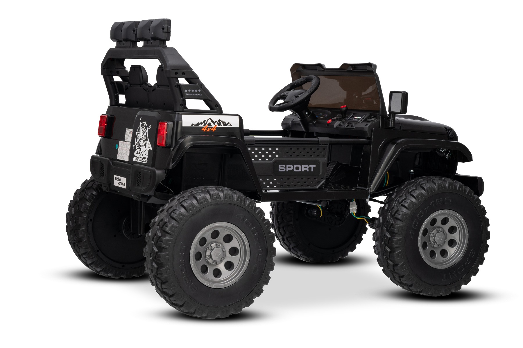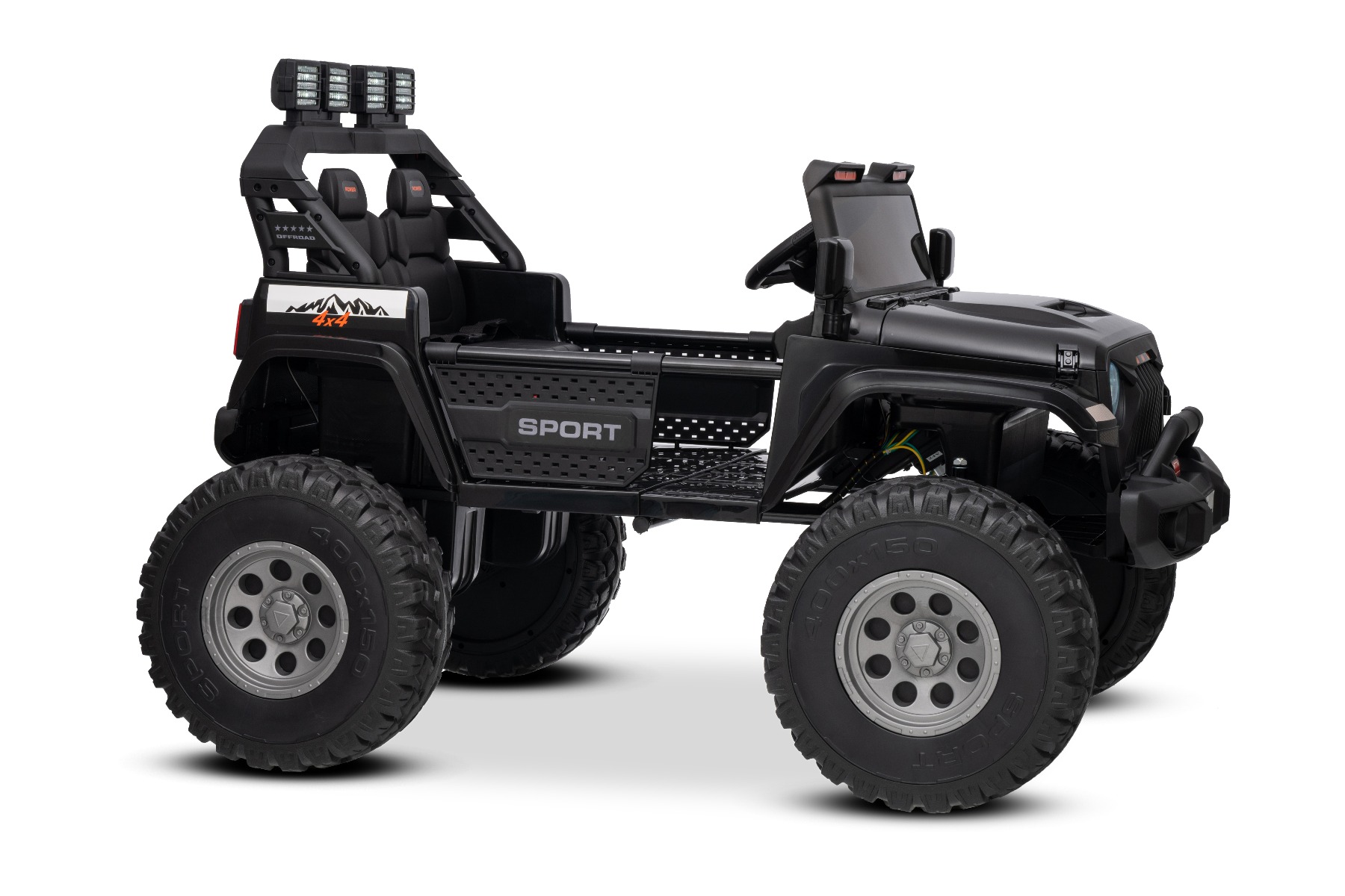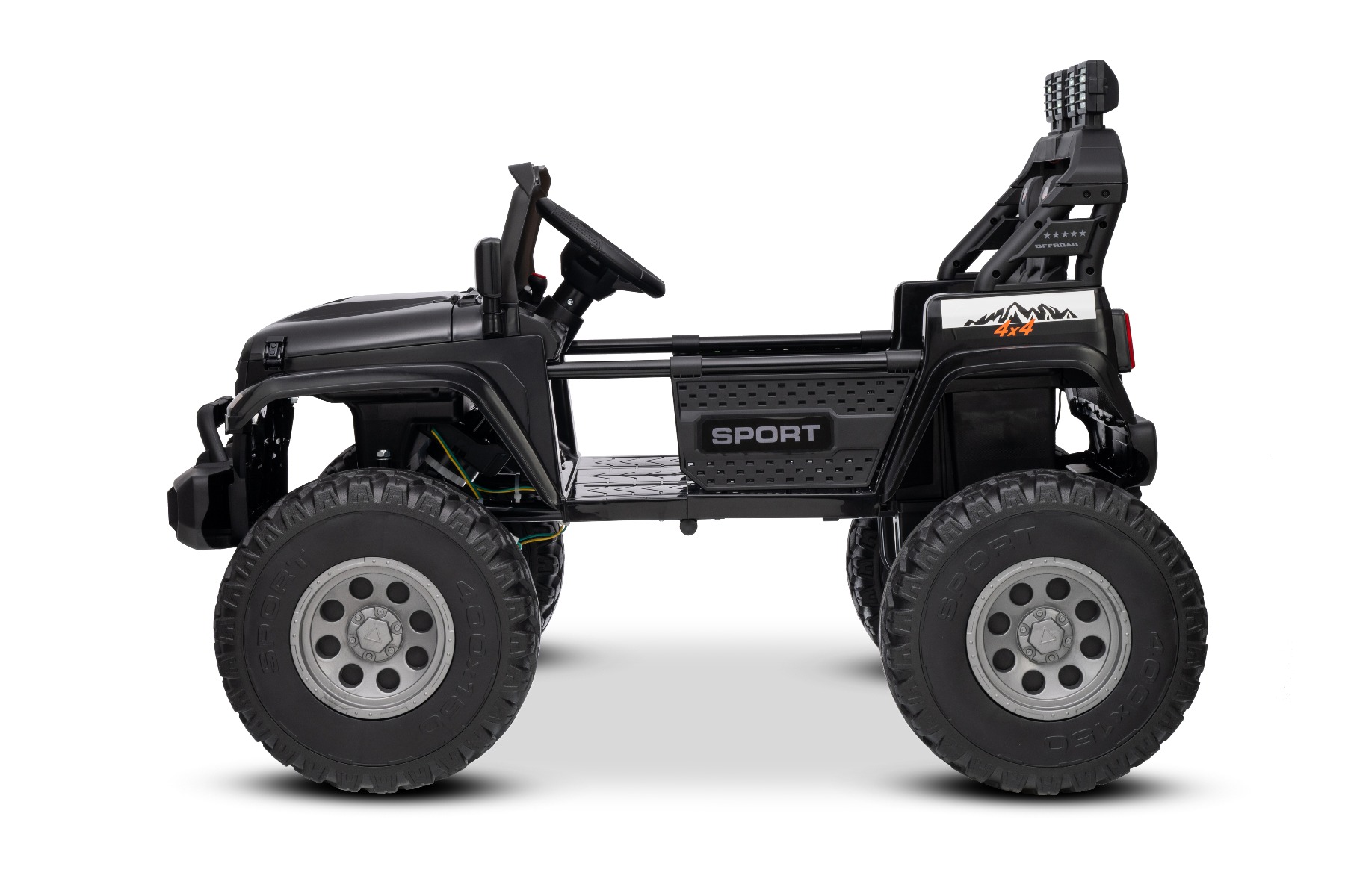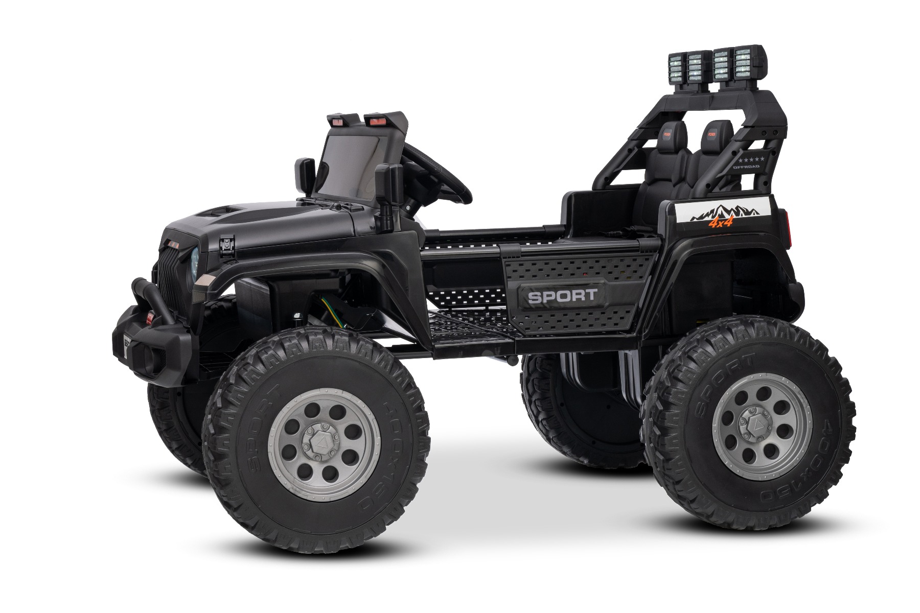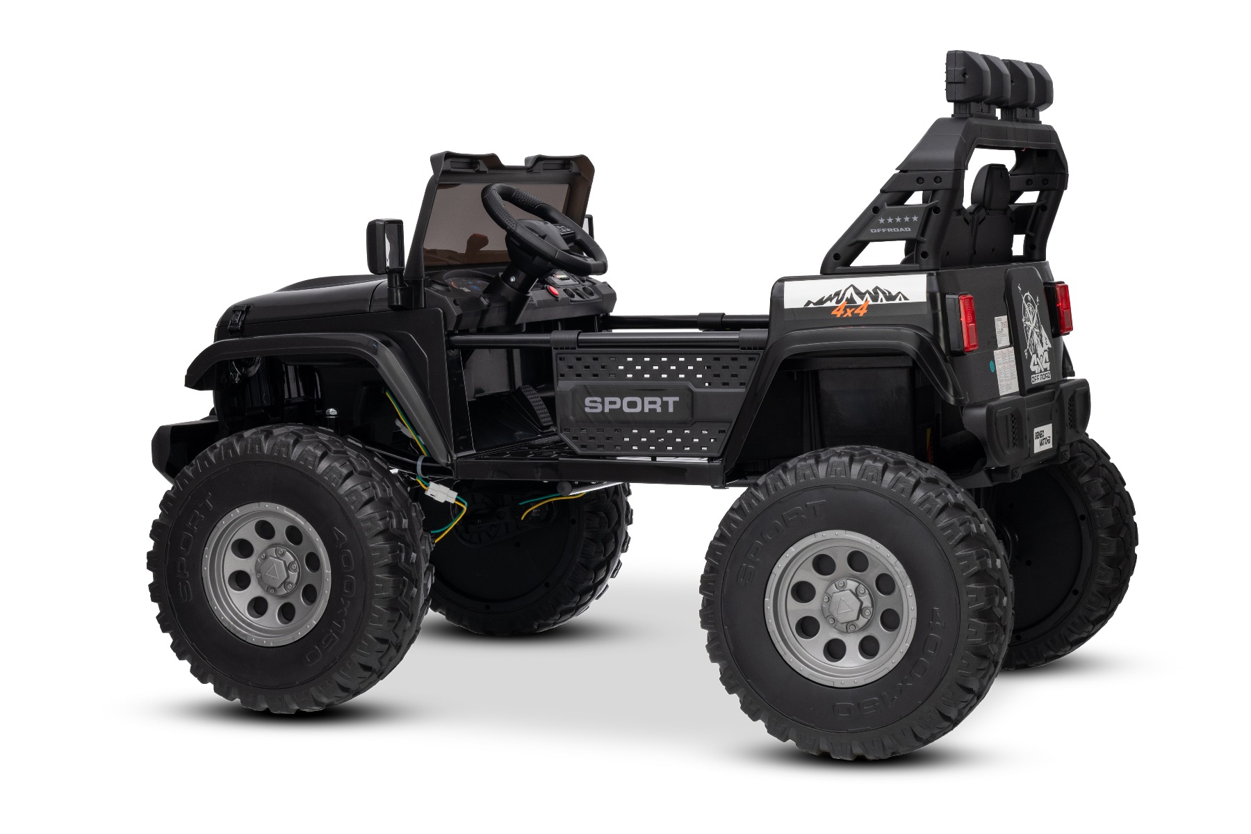 Maşinuţa electrica copii OFFRIDE 4×4² cu două locuri, 24V, negru, player MP3 cu intrare USB/AUX, transmisie 4×4, baterie litiu, roți EVA cu suspensie, telecomandă, lumini LED