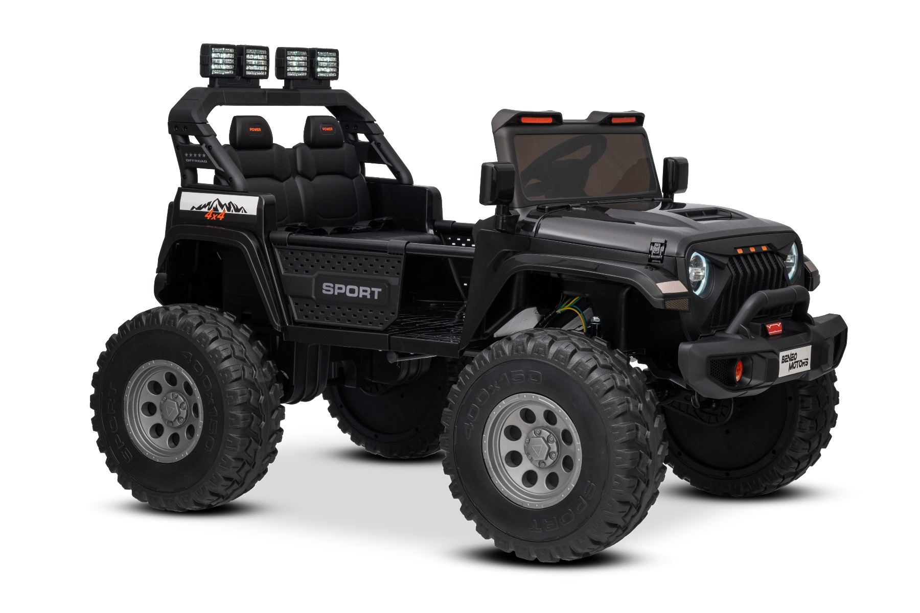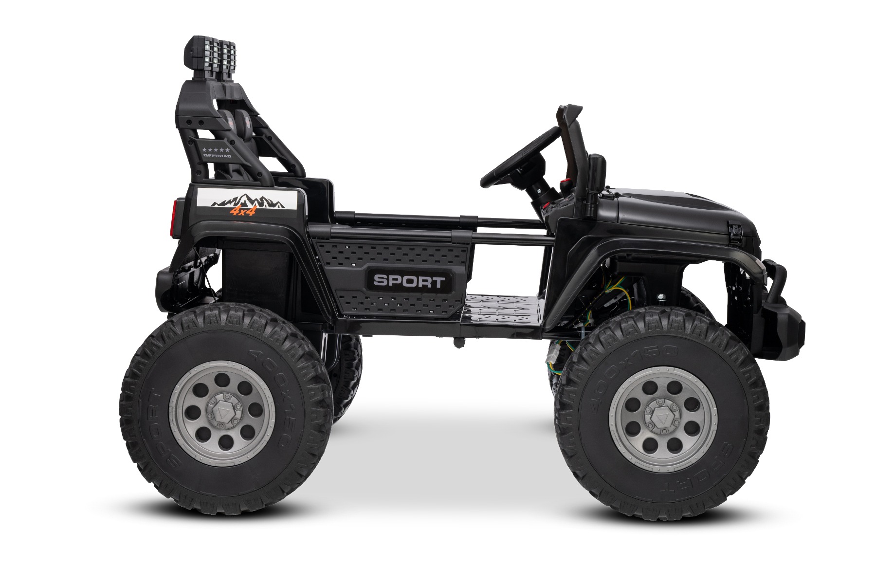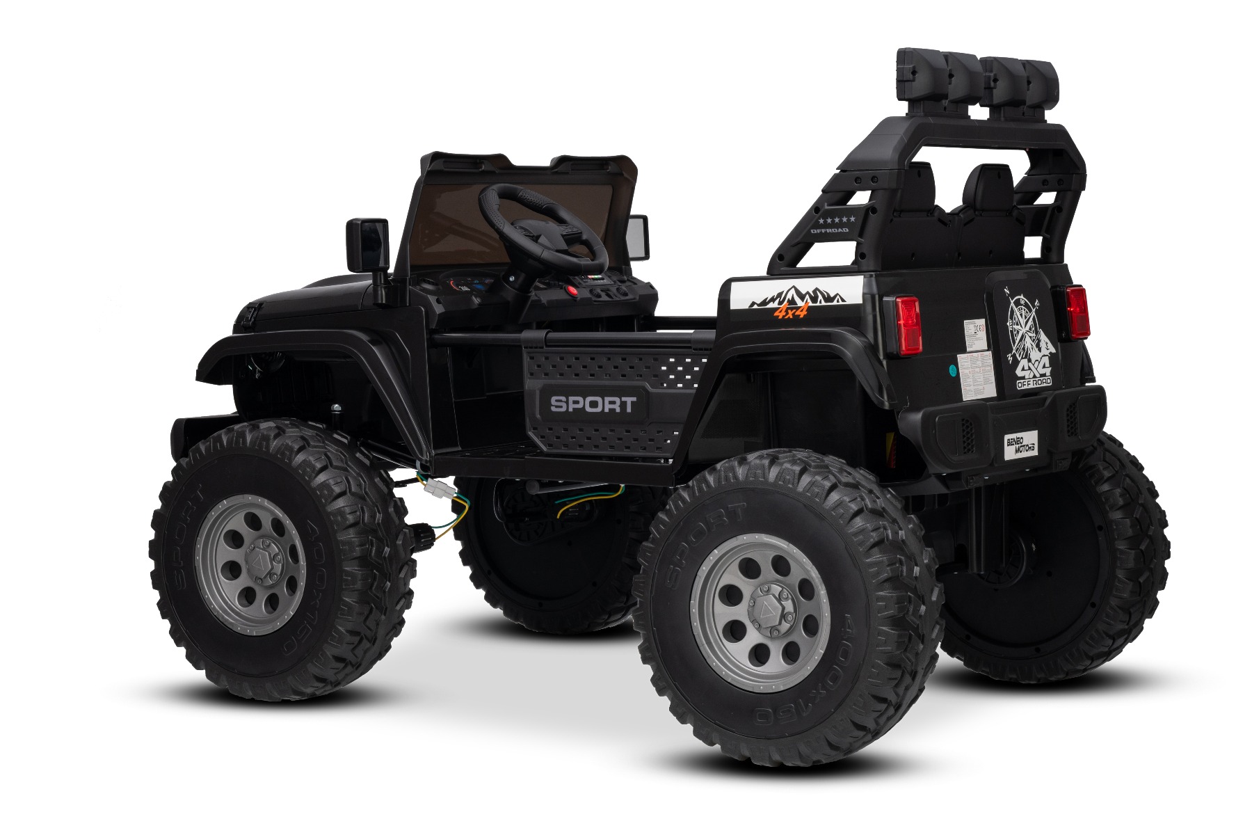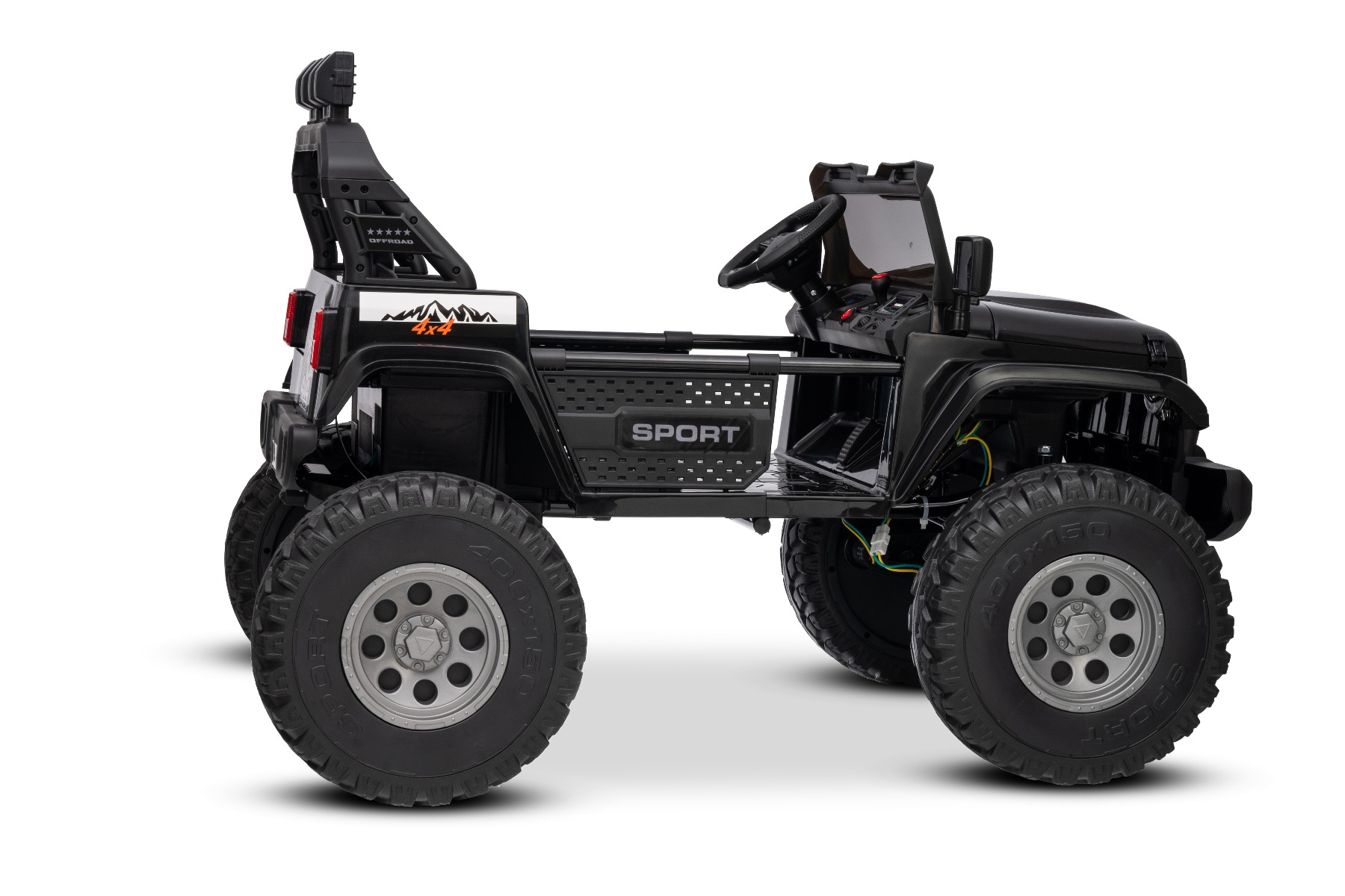 Maşinuţa electrica copii OFFRIDE 4×4² cu două locuri, 24V, negru, player MP3 cu intrare USB/AUX, transmisie 4×4, baterie litiu, roți EVA cu suspensie, telecomandă, lumini LED