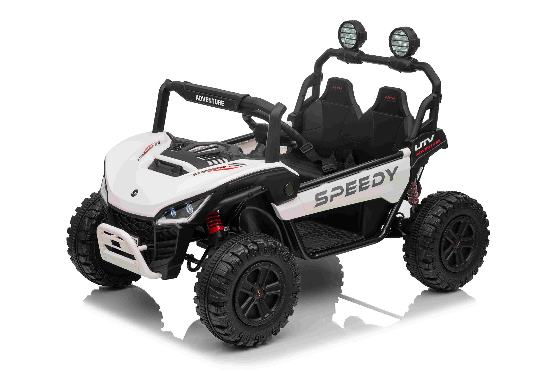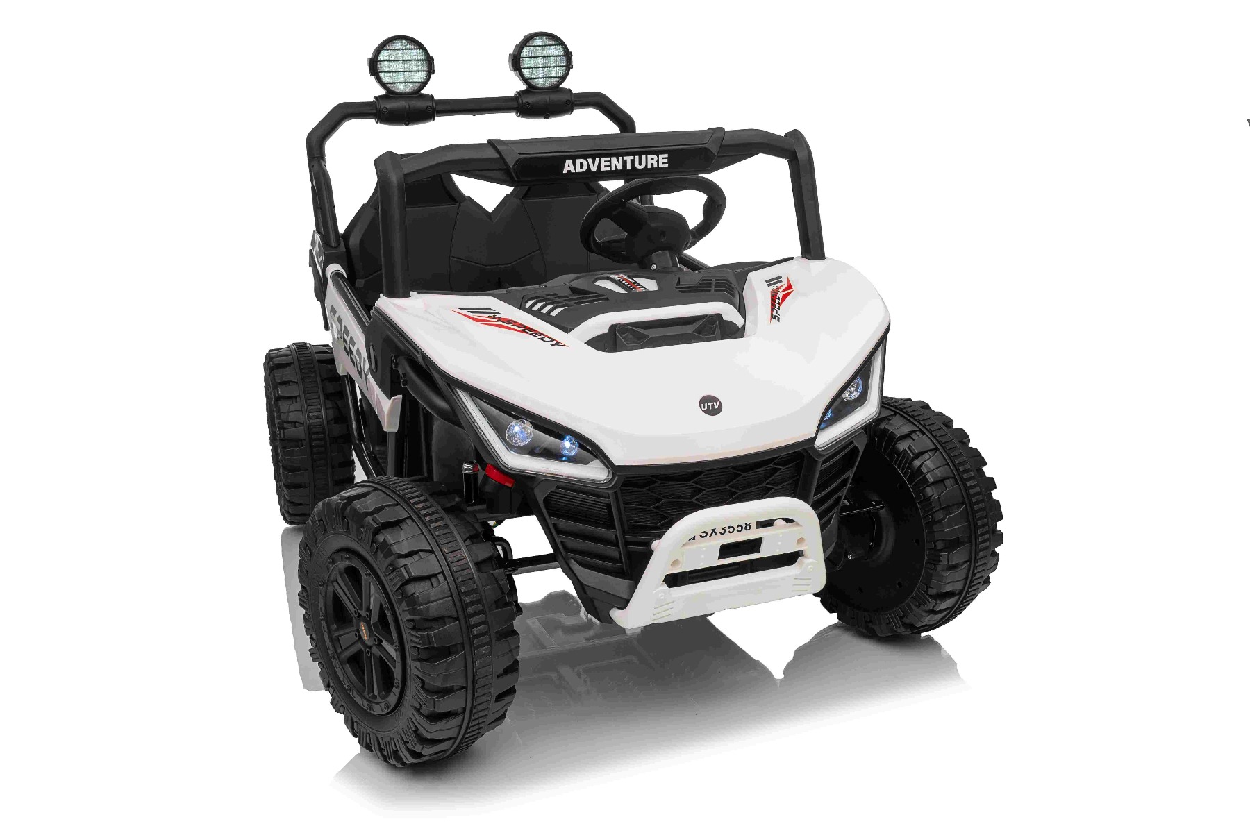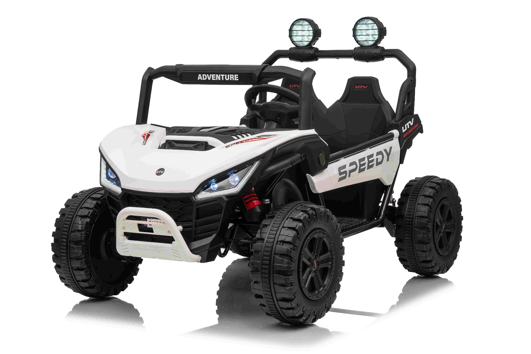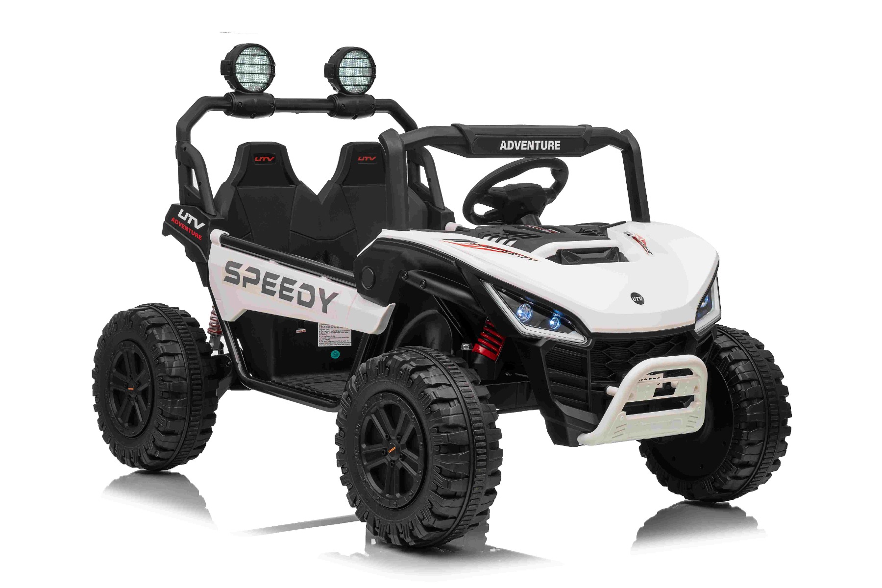 • Construcție solidă din metal • Design sportiv off-road • Lumini LED pe capotă • Compartiment de depozitare spate • Suspensii