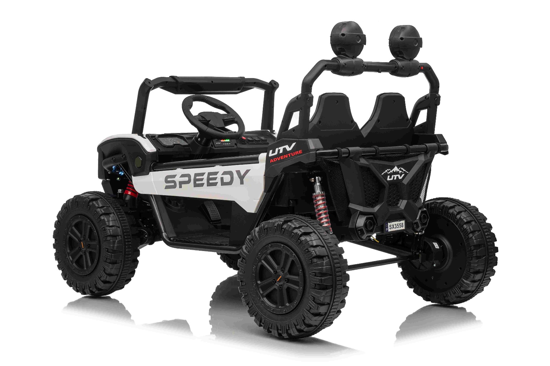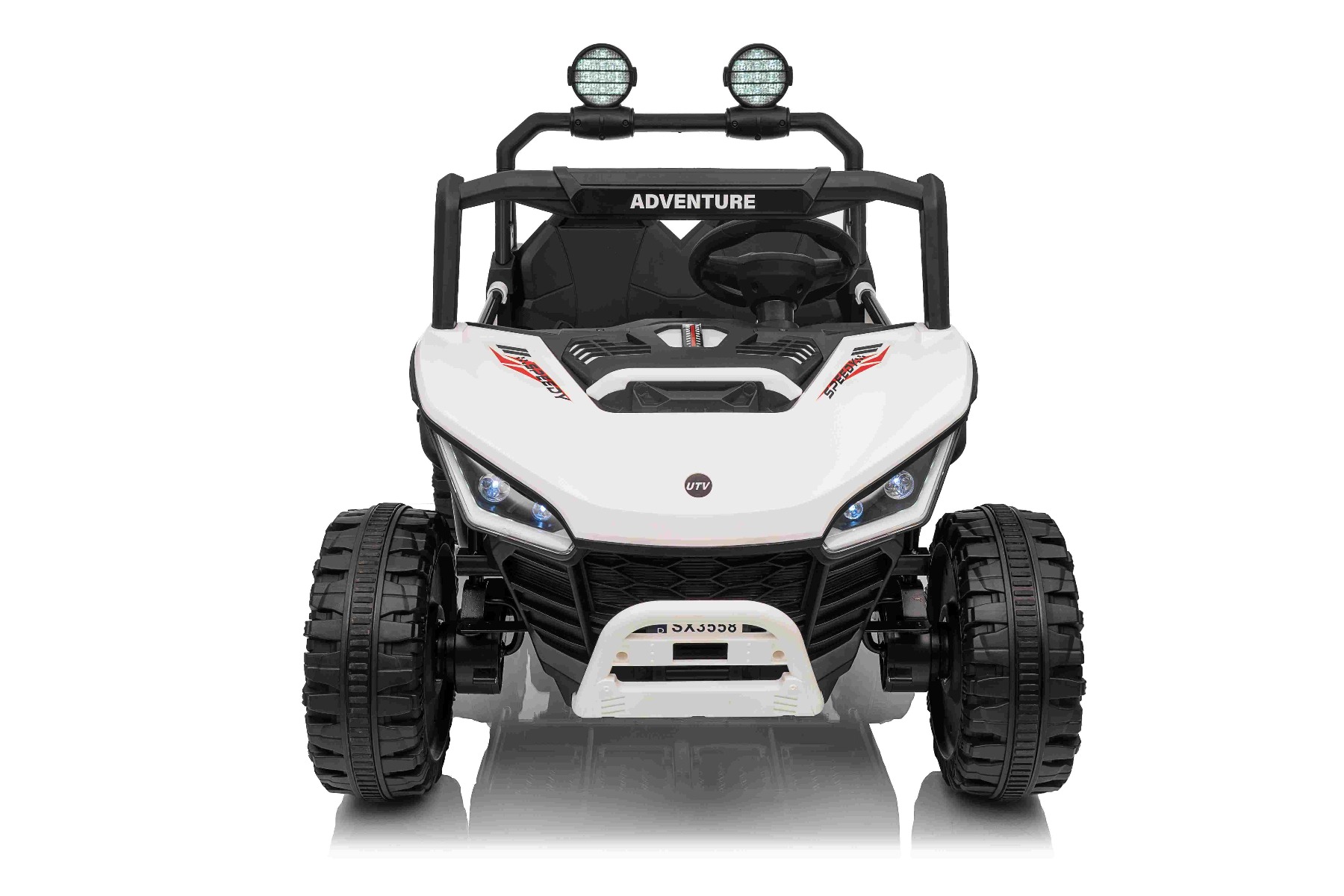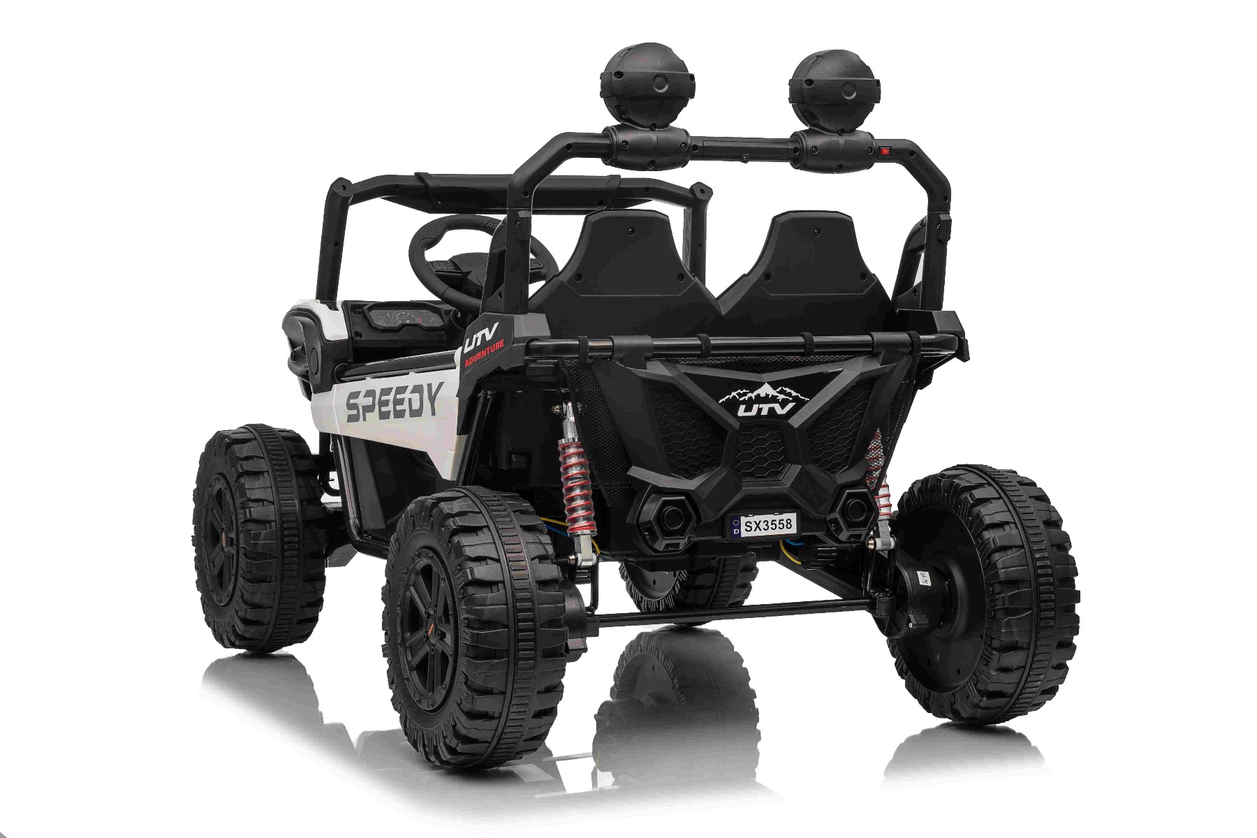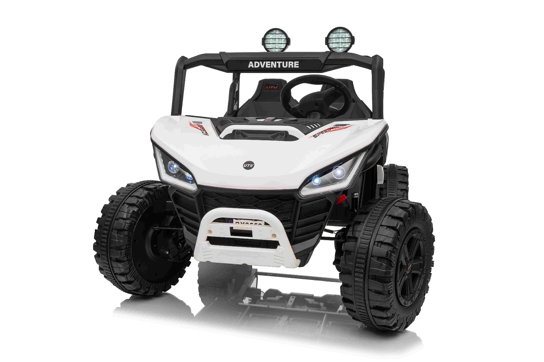 • Construcție solidă din metal • Design sportiv off-road • Lumini LED pe capotă • Compartiment de depozitare spate • Suspensii