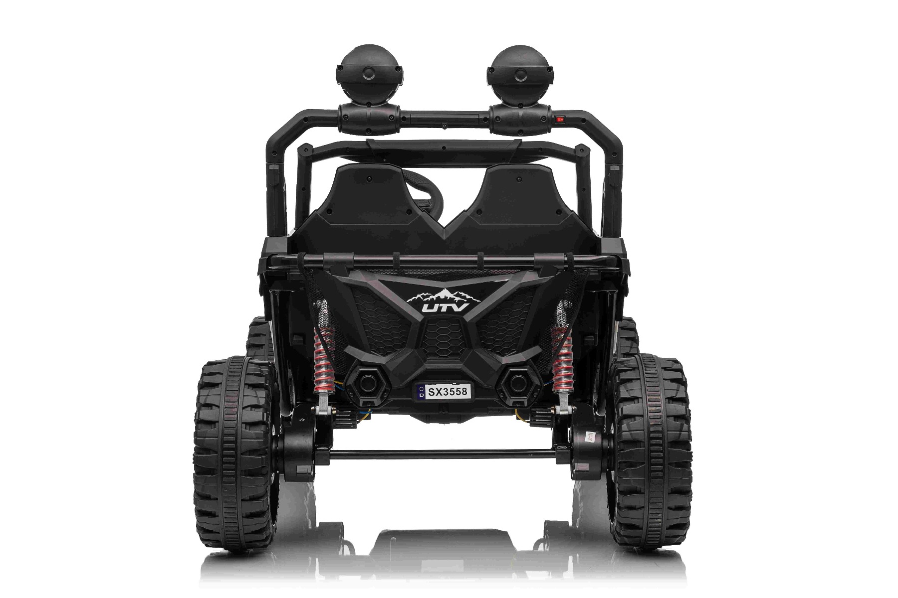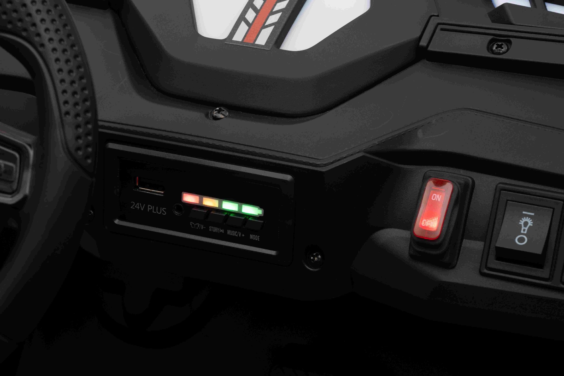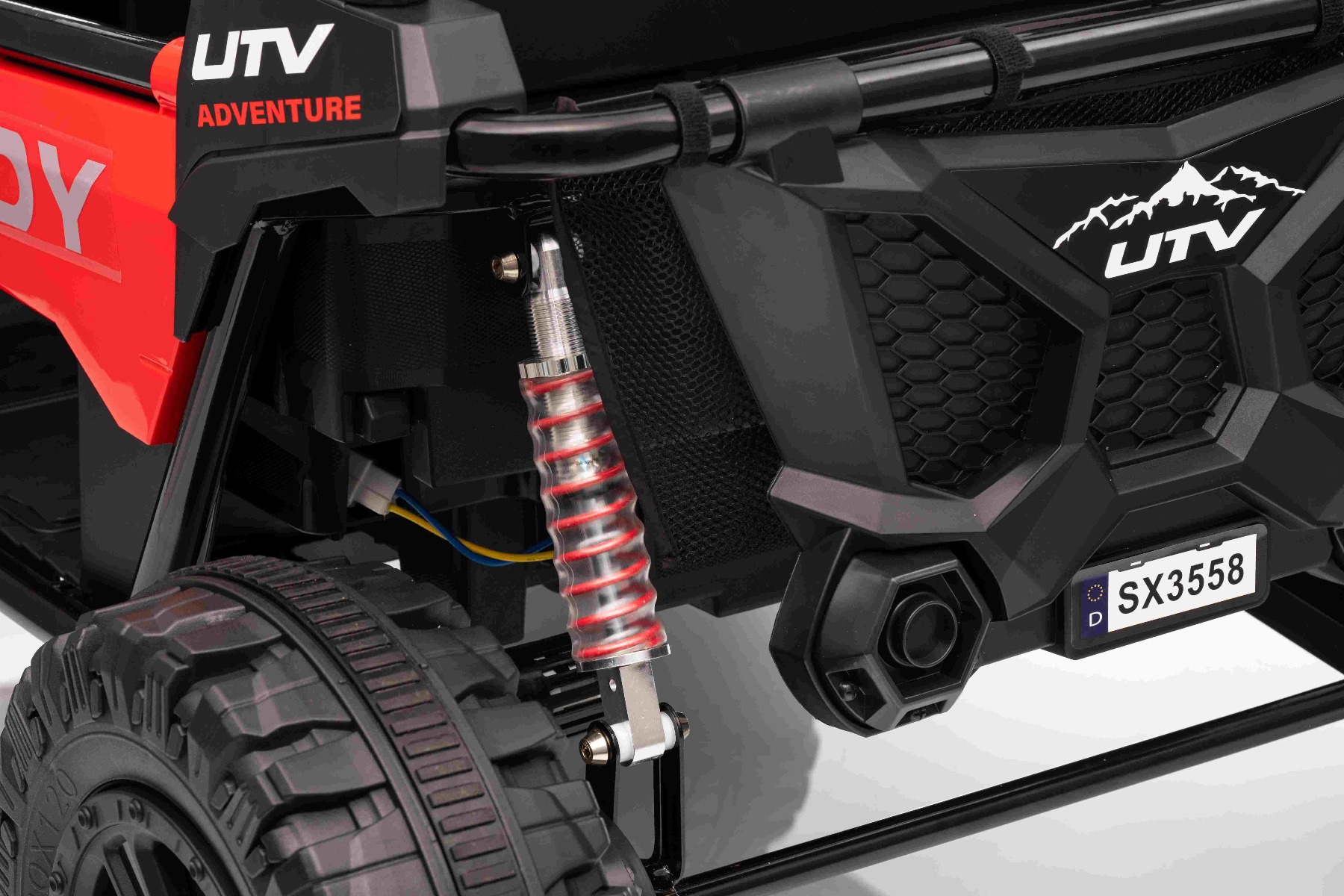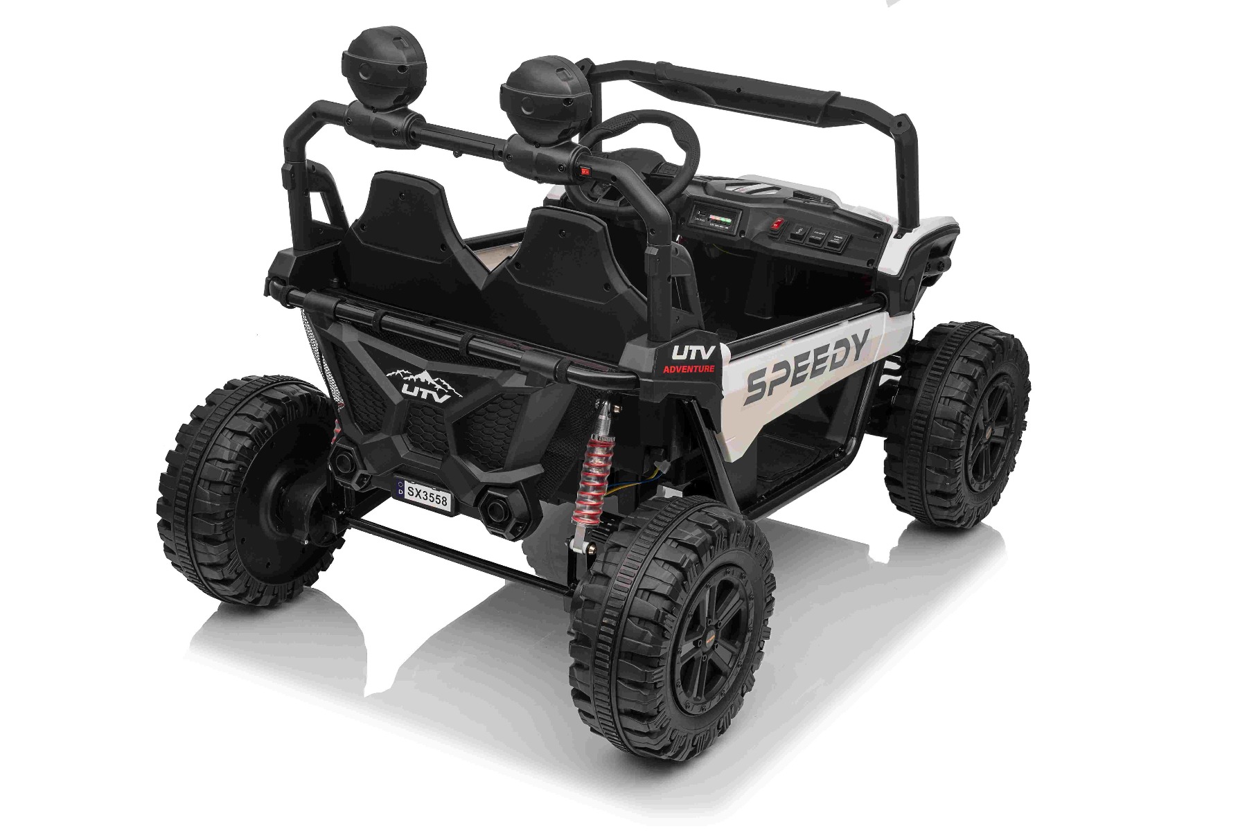 • Construcție solidă din metal • Design sportiv off-road • Lumini LED pe capotă • Compartiment de depozitare spate • Suspensii