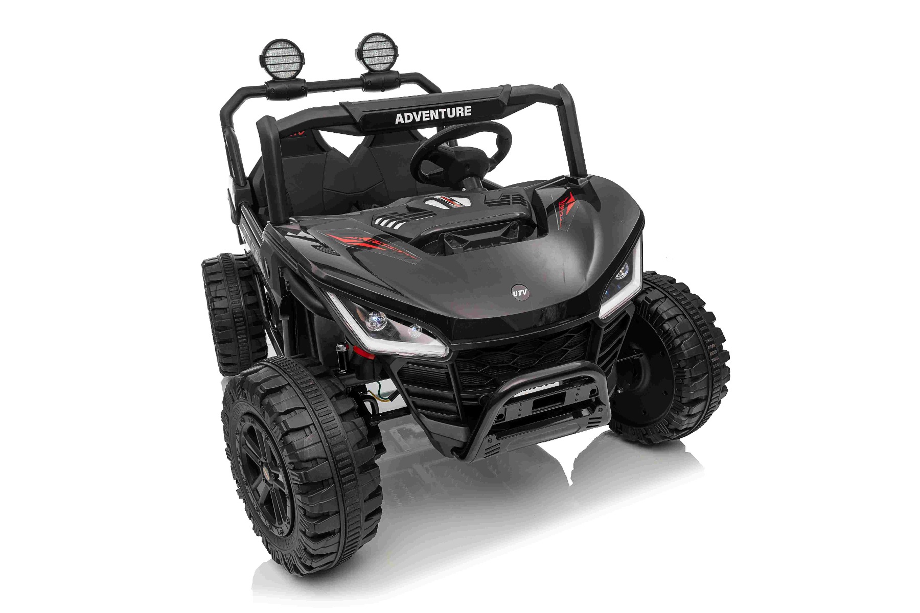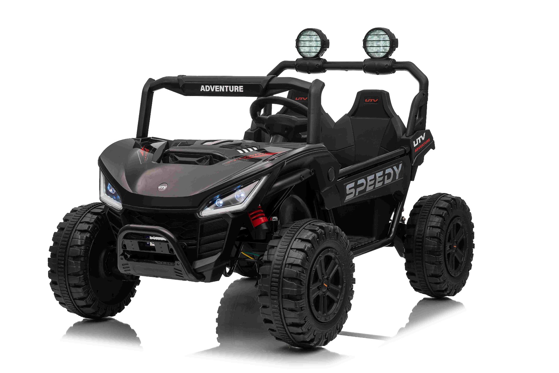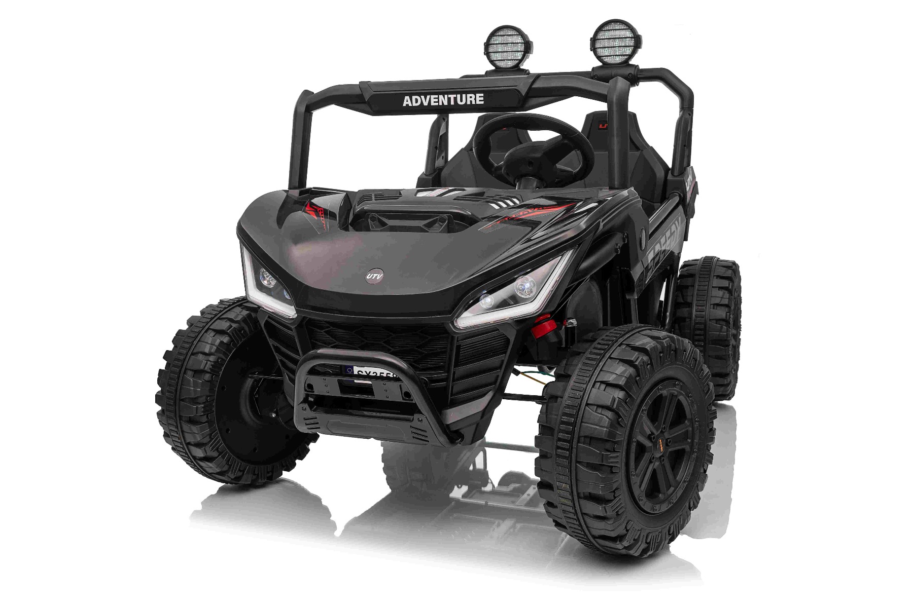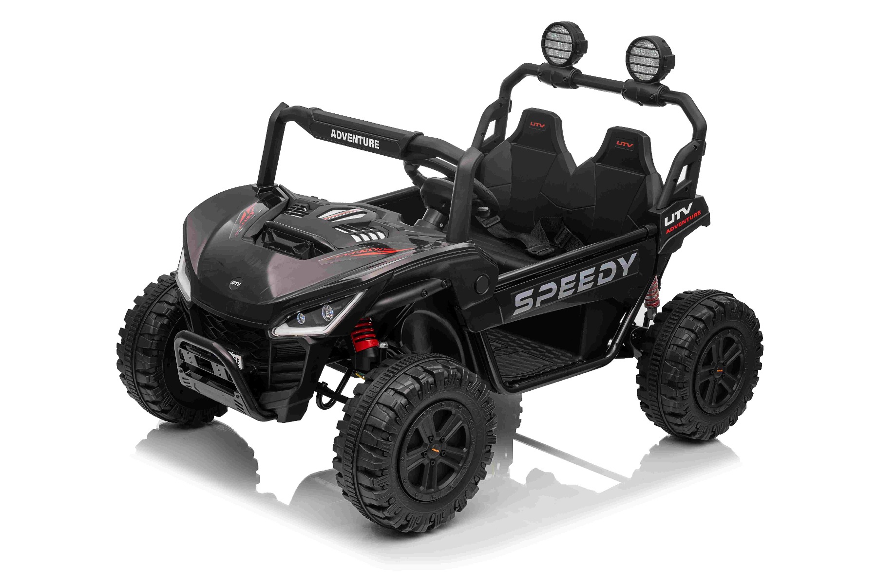 • Construcție solidă din metal • Design sportiv off-road • Lumini LED pe capotă • Compartiment de depozitare spate • Suspensii