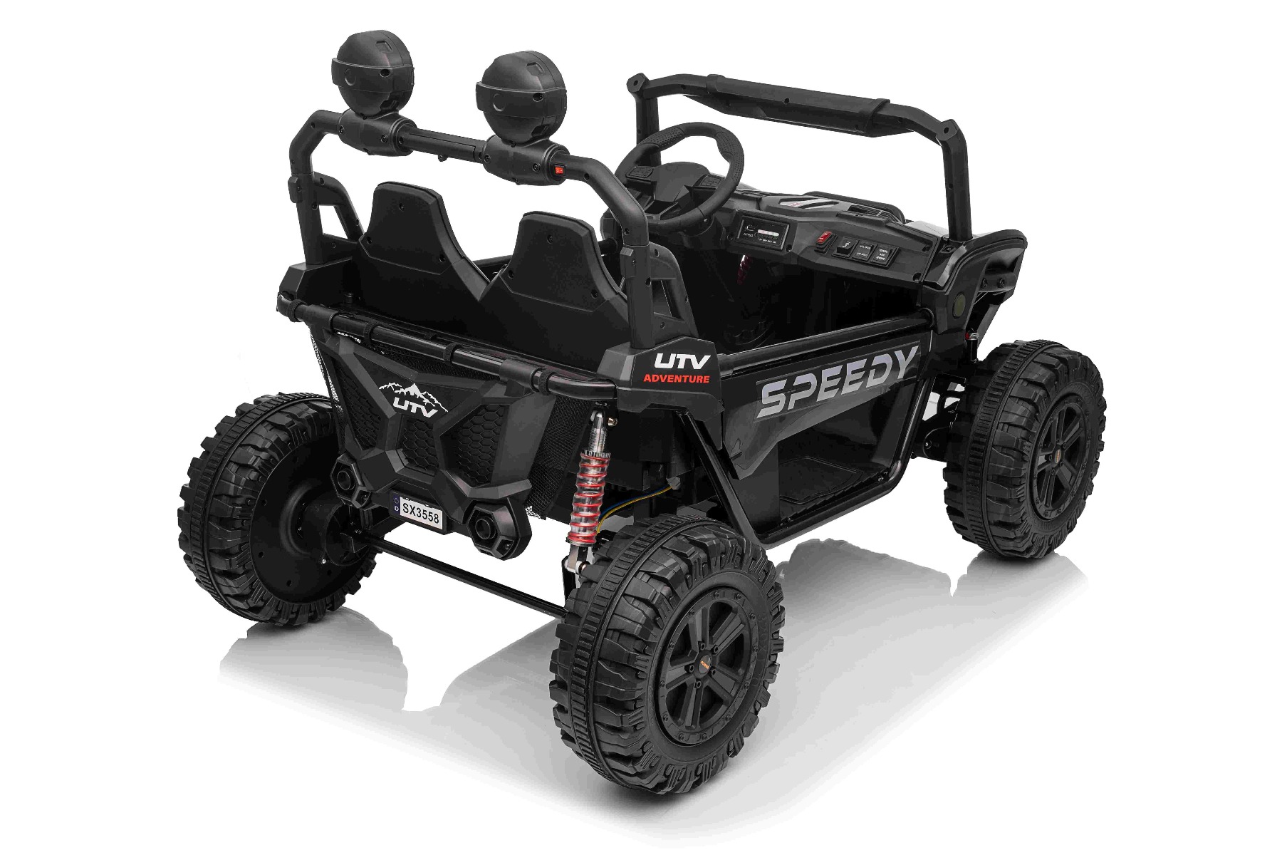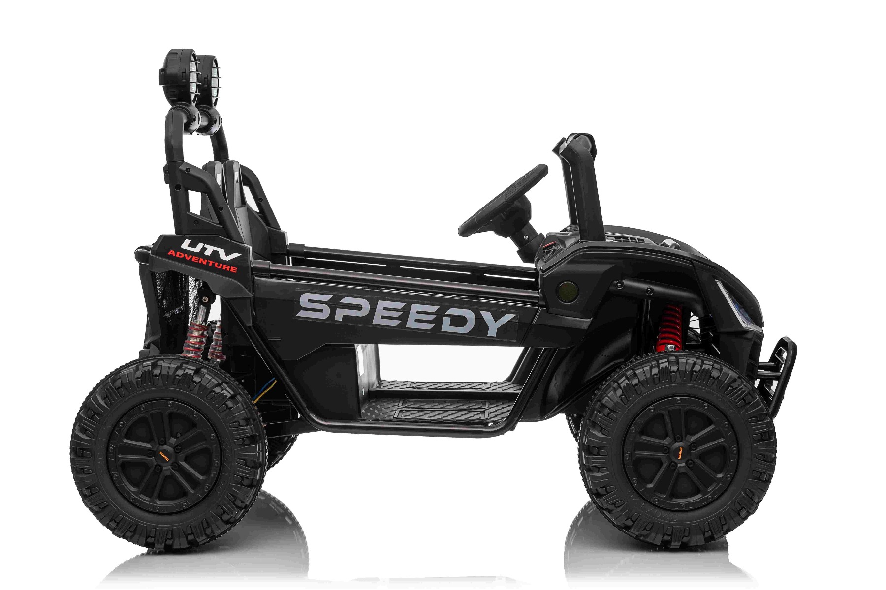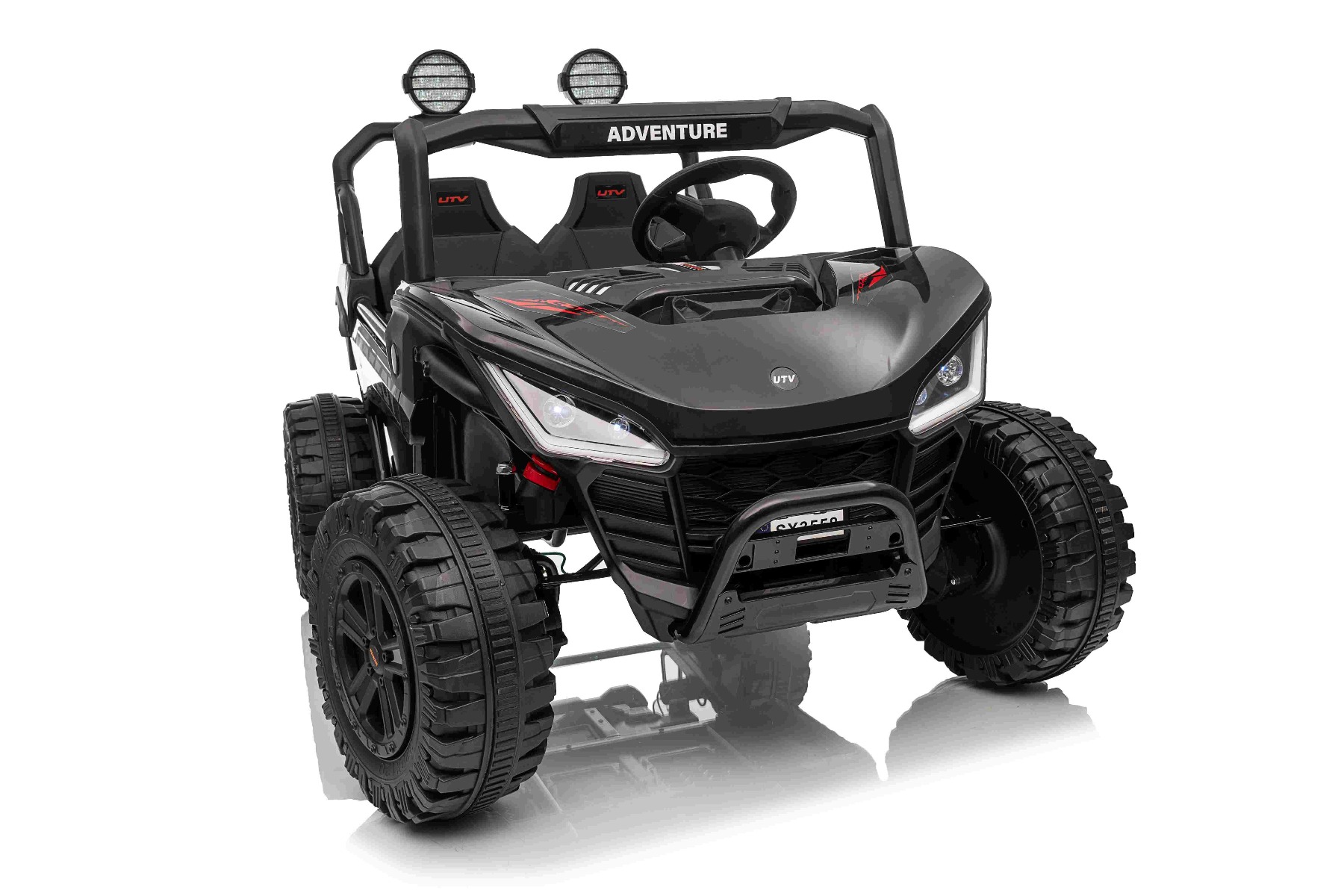• Construcție solidă din metal • Design sportiv off-road • Lumini LED pe capotă • Compartiment de depozitare spate • Suspensii