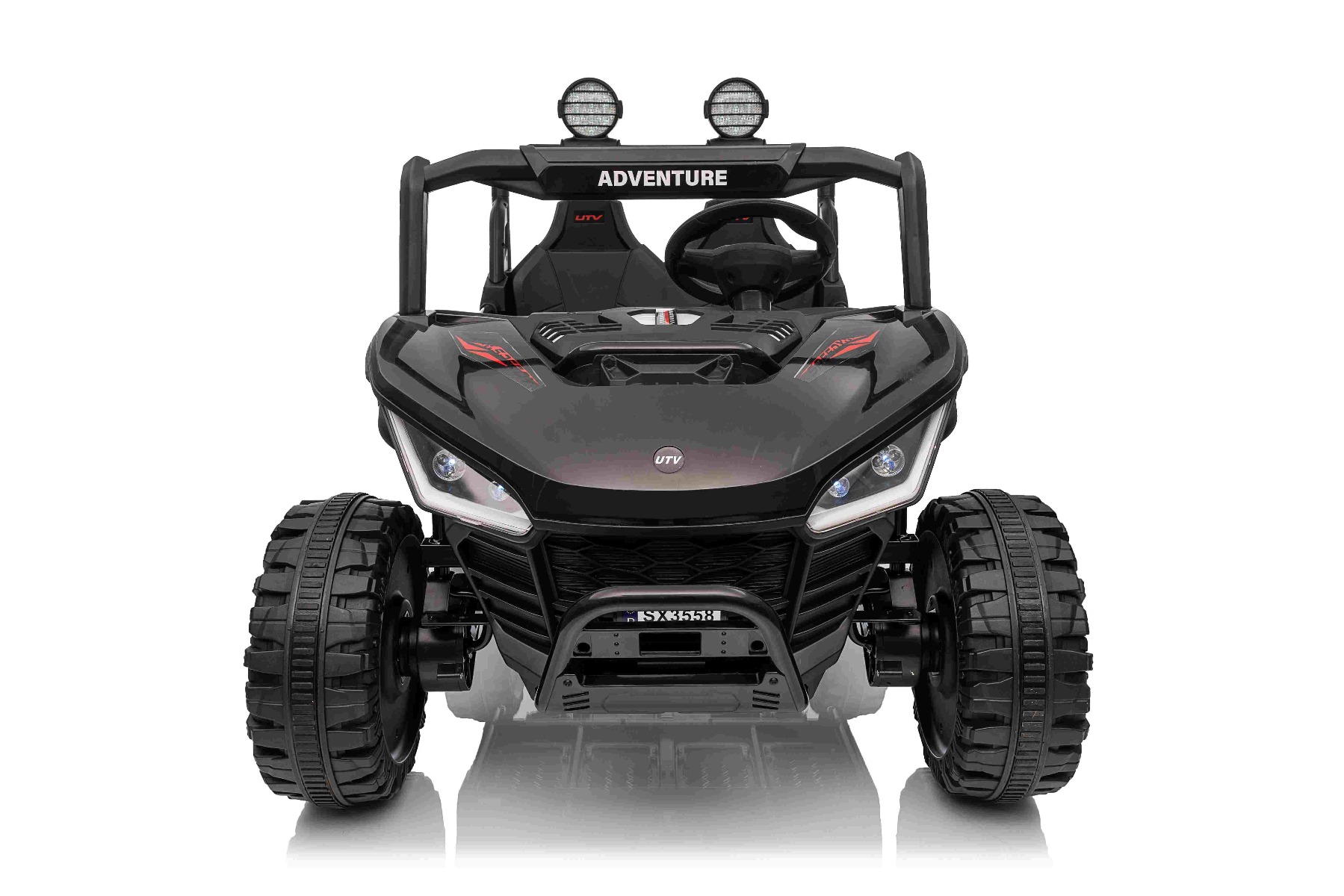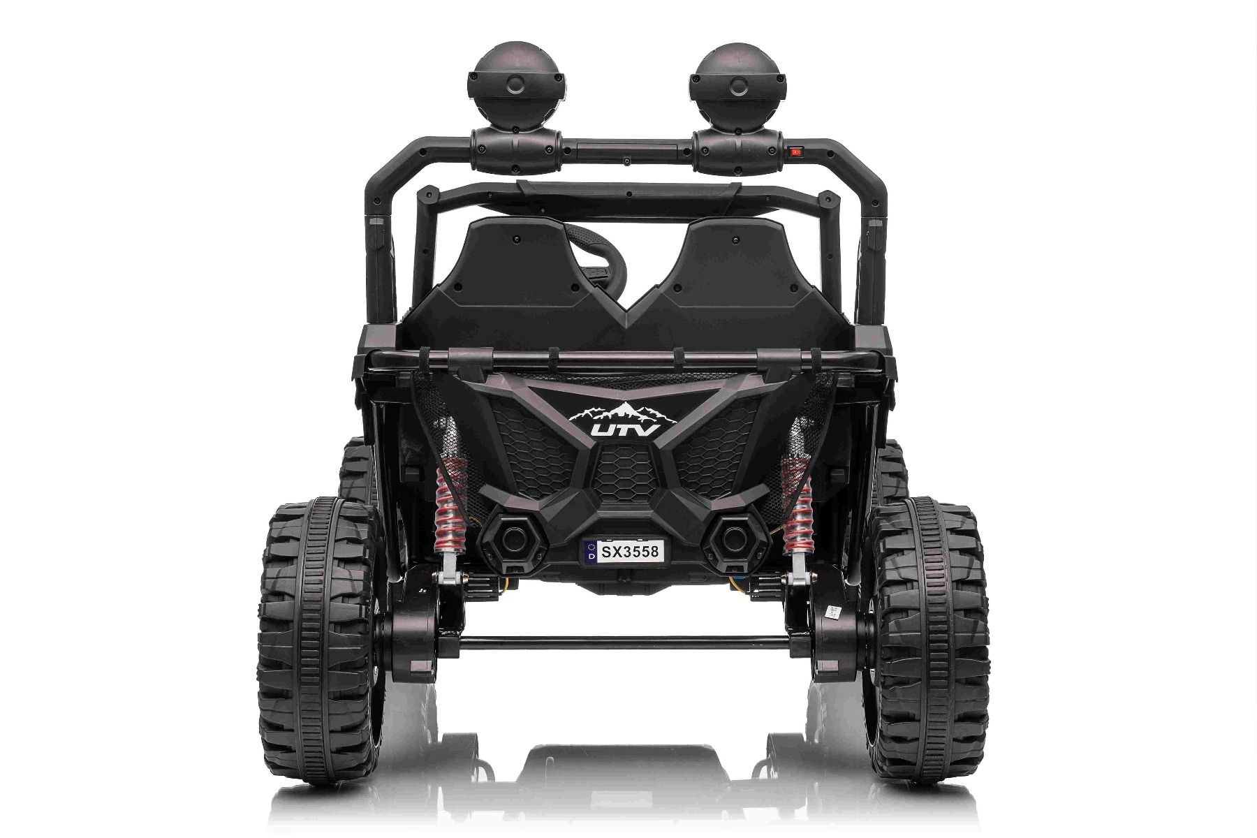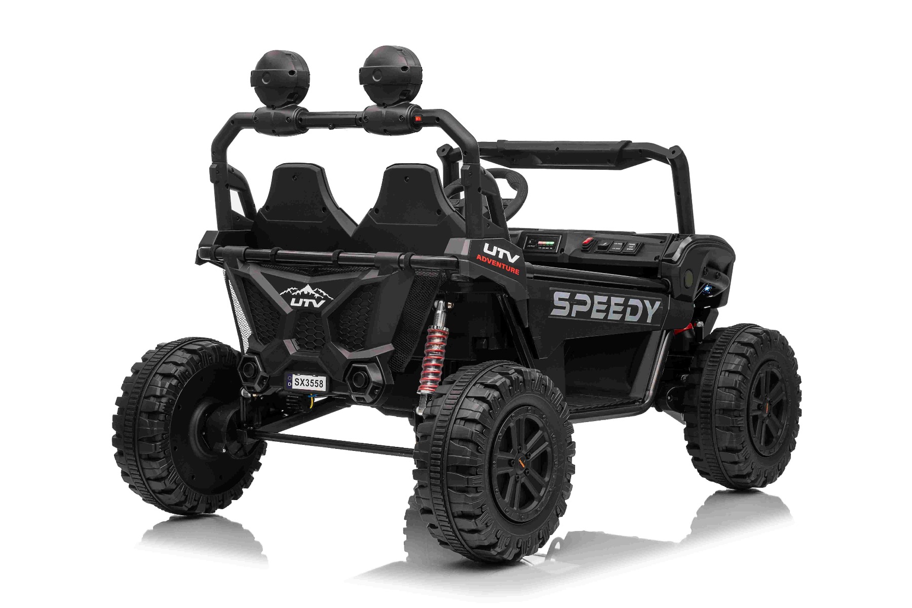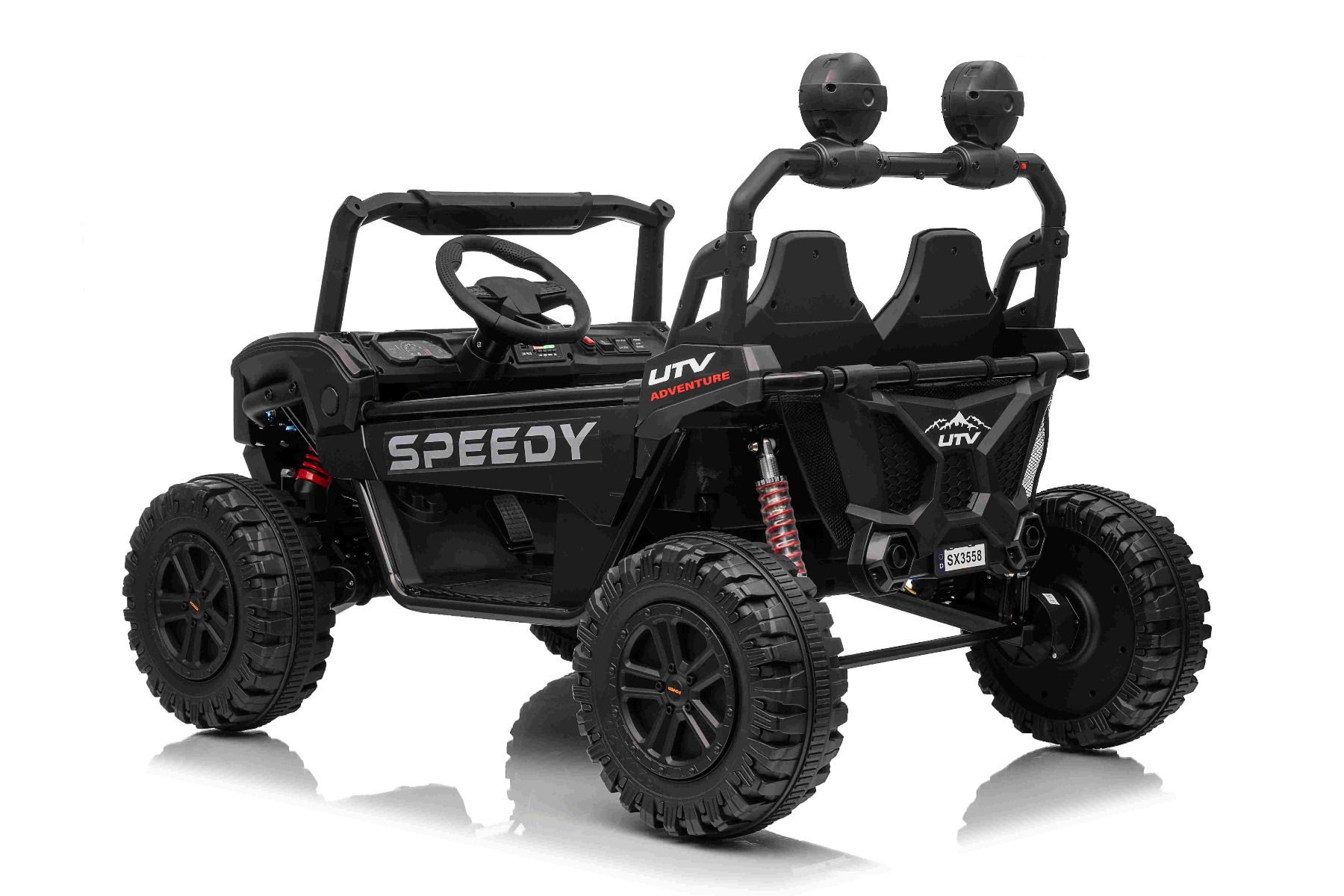 • Construcție solidă din metal • Design sportiv off-road • Lumini LED pe capotă • Compartiment de depozitare spate • Suspensii