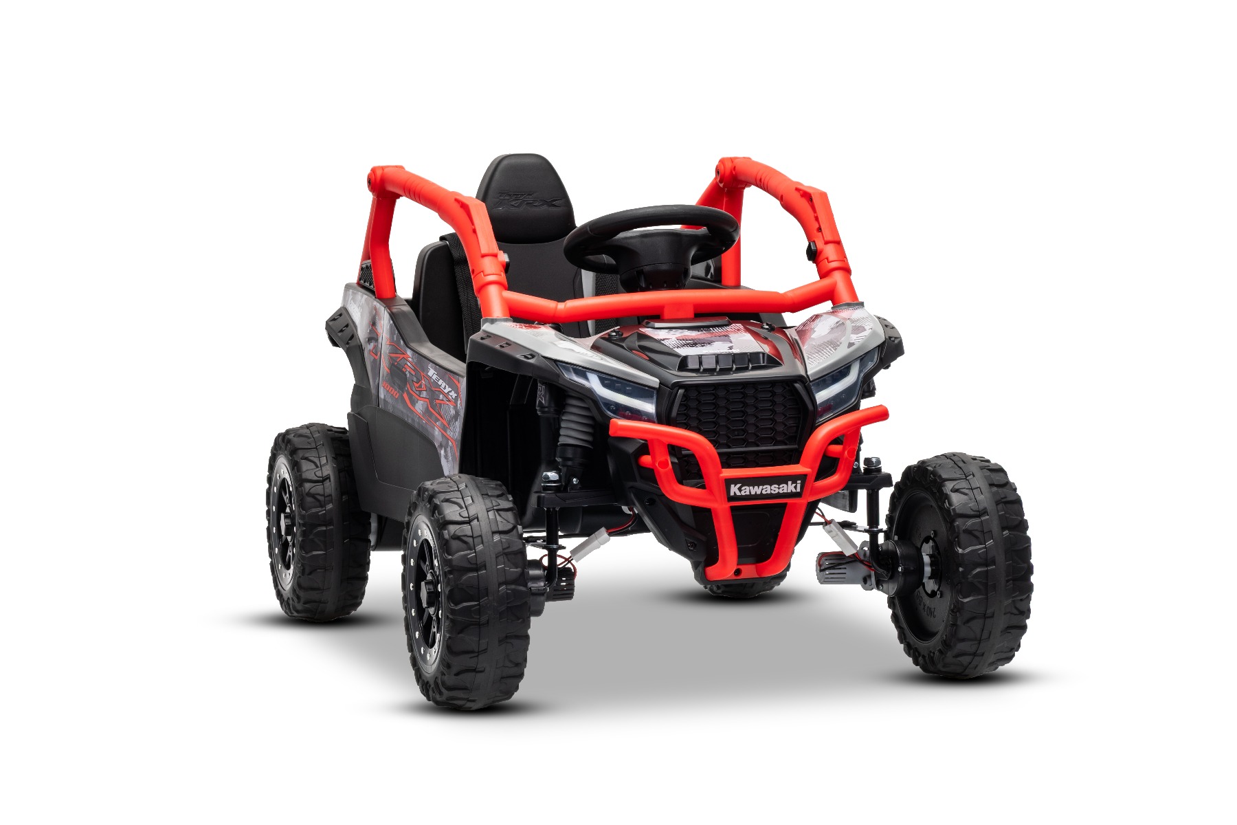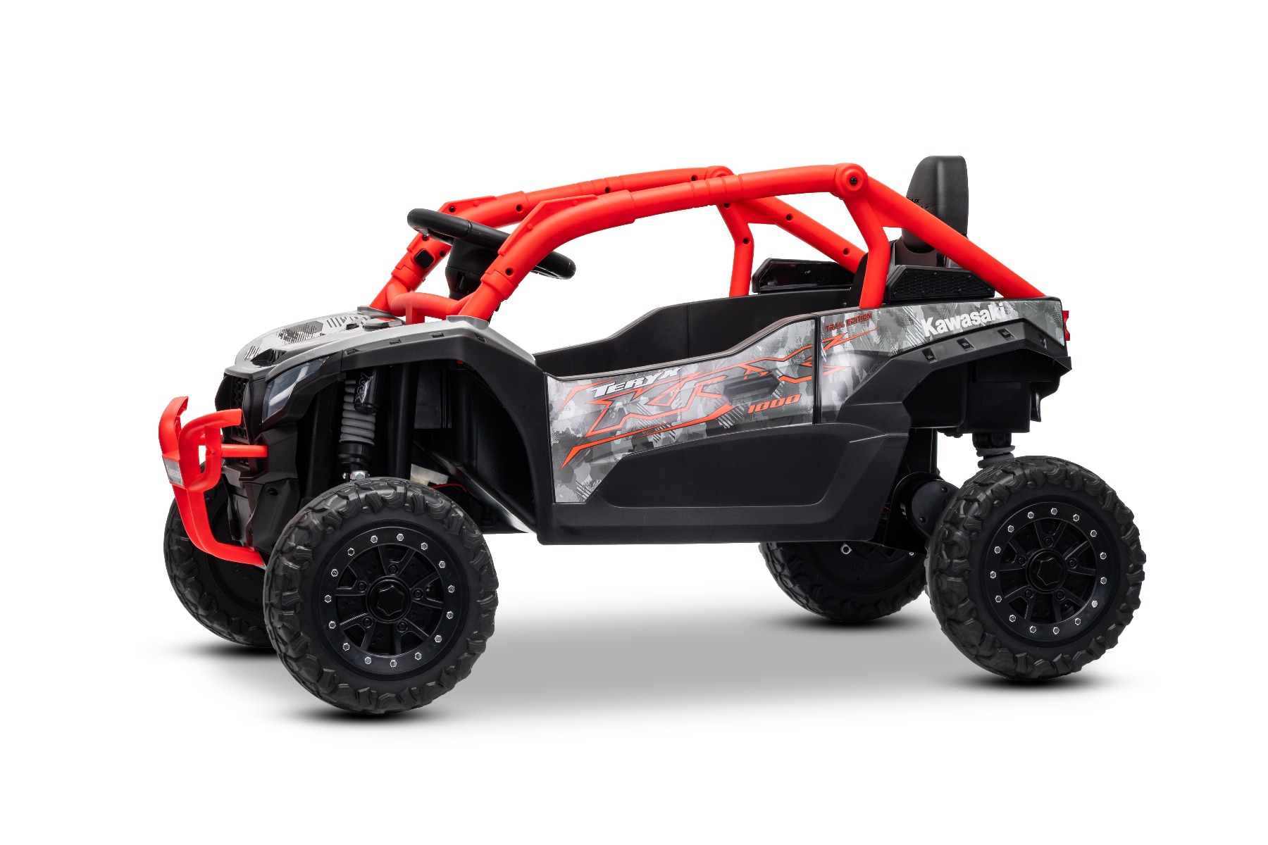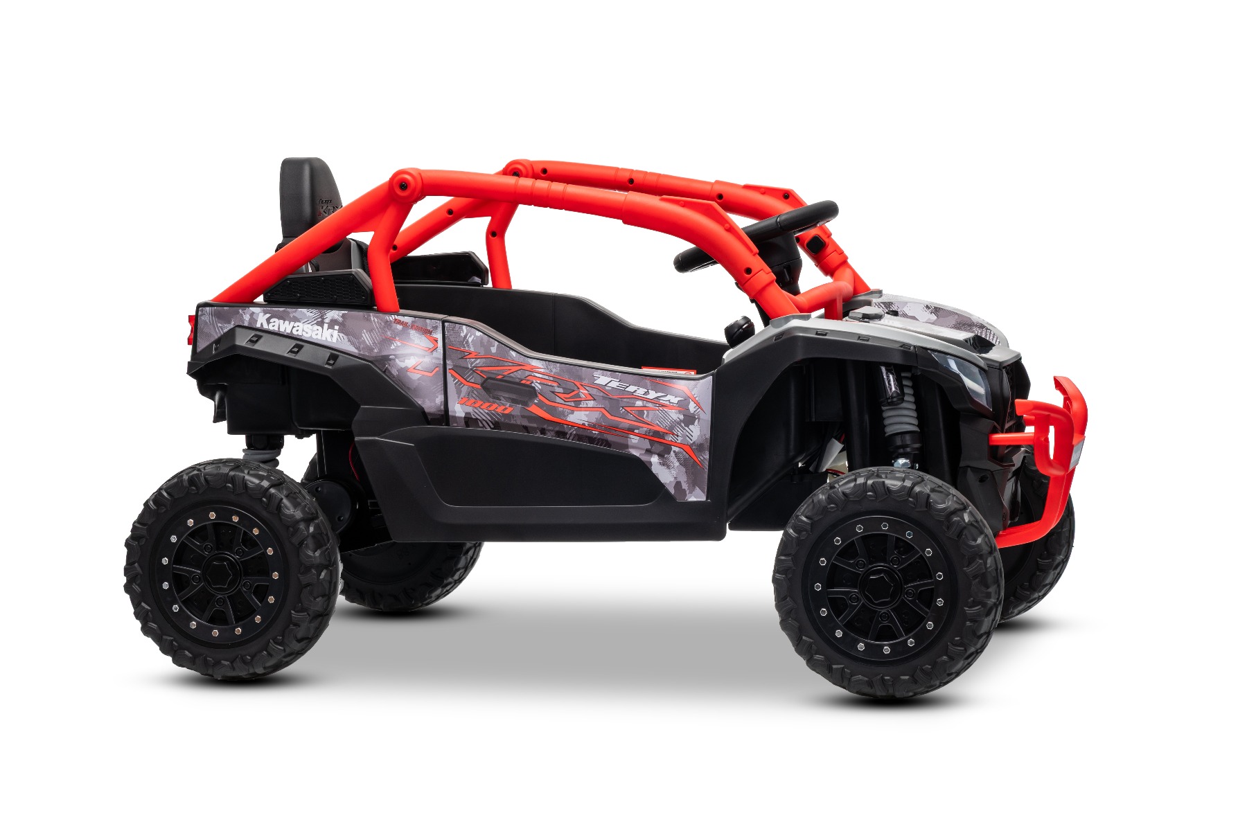 Mașinuță electrică de jucărie Kawasaki TERYX KRX 1000 12V, roșu, un scaun, suspensie punte spate, telecomandă 2.4 Ghz, baterie litiu, 2 motoare x 25W, rame de protecție care se deschid, player MP3 cu intrare USB/AUX, model cu licență