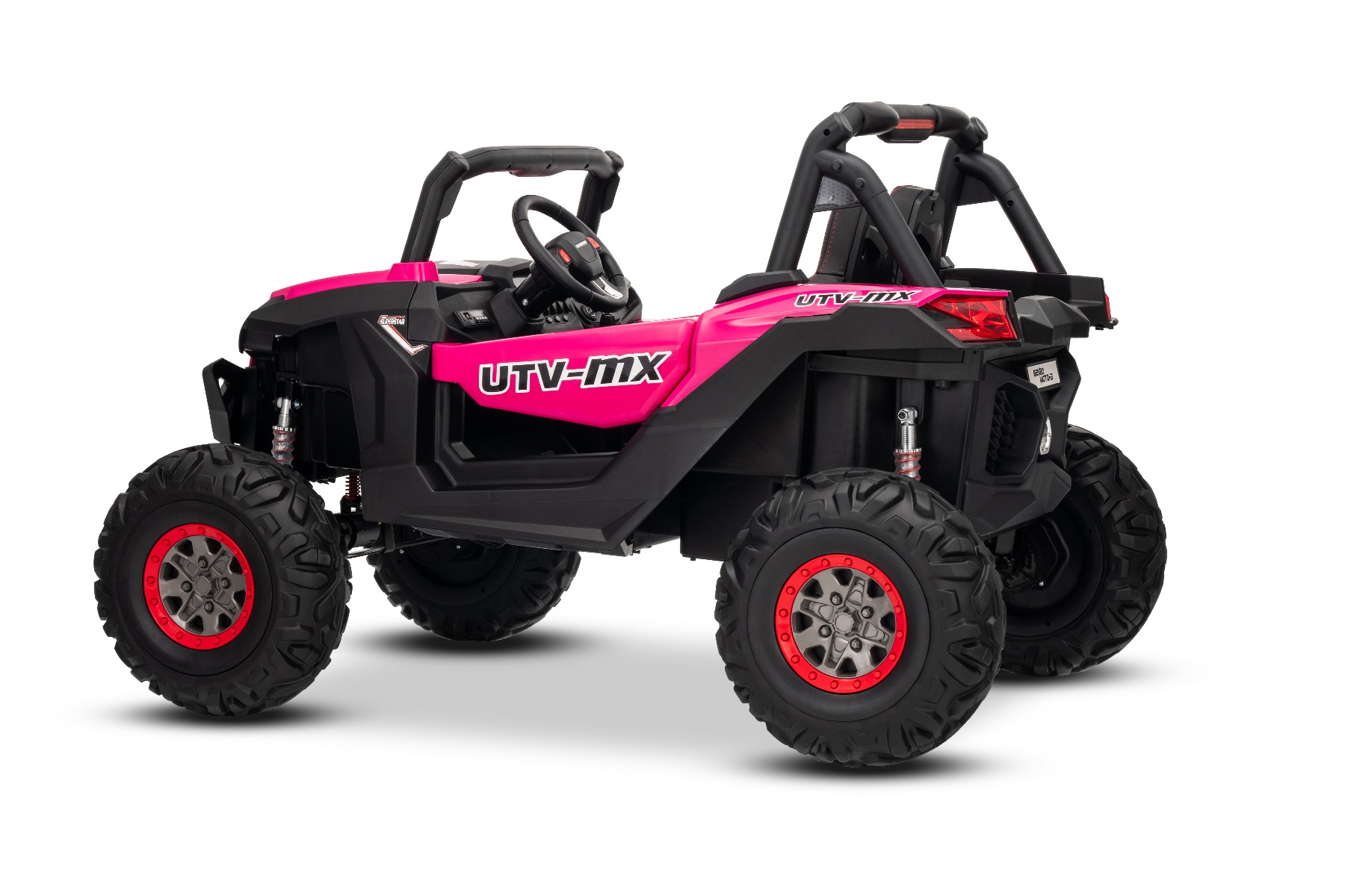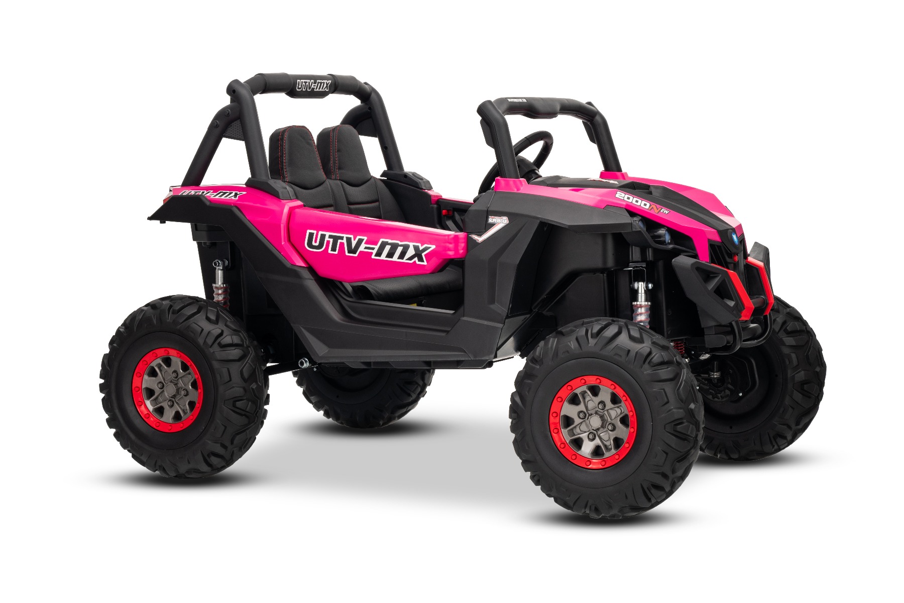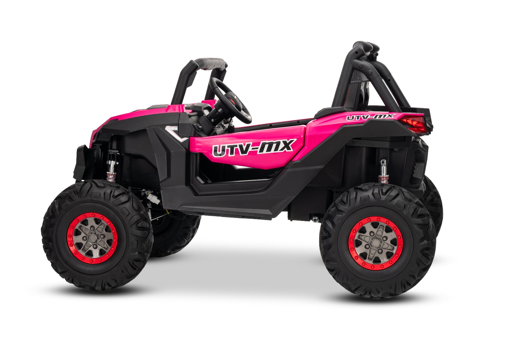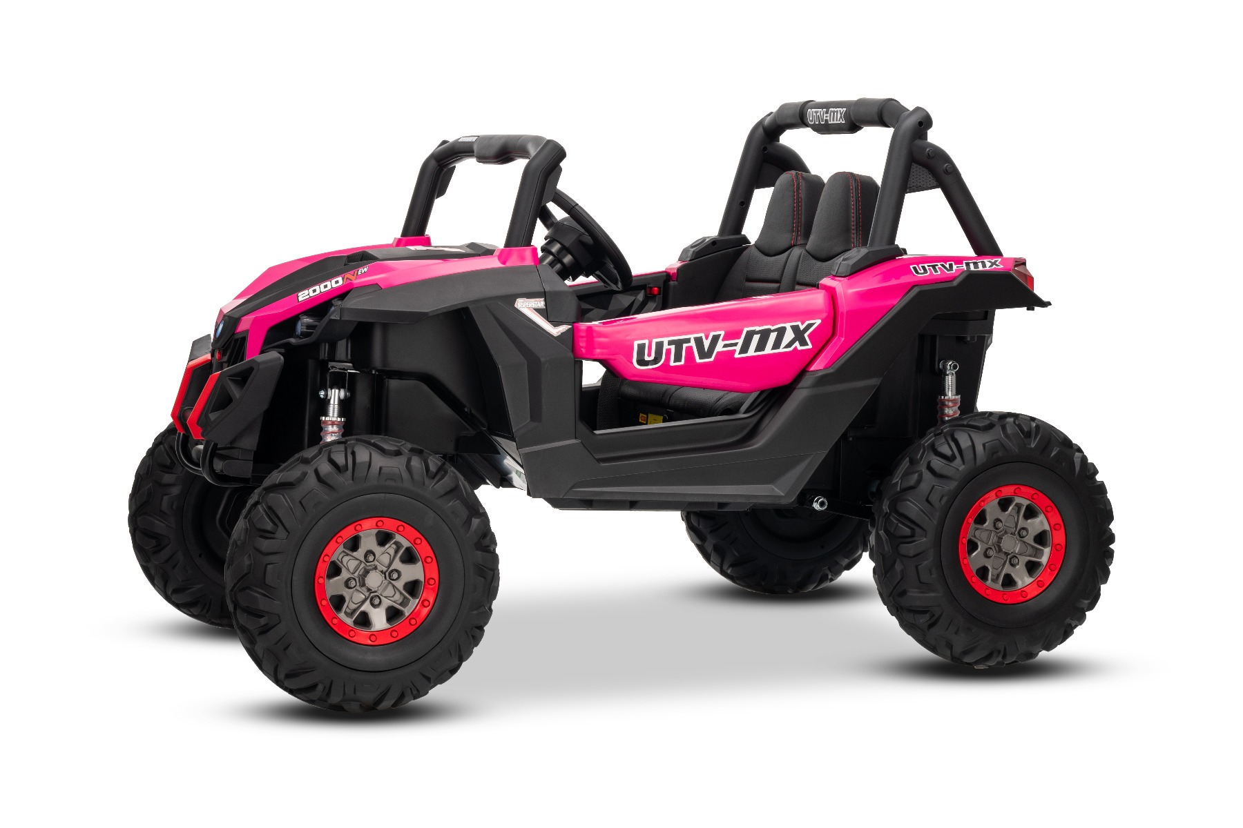 Mașinuță electrică de jucărie NEW RSX 24V, roz, tracțiune 4×4, baterie litiu, roți EVA, suspensii, scaun din piele artificială cu două locuri, telecomandă, player MP3 cu intrare USB/AUX