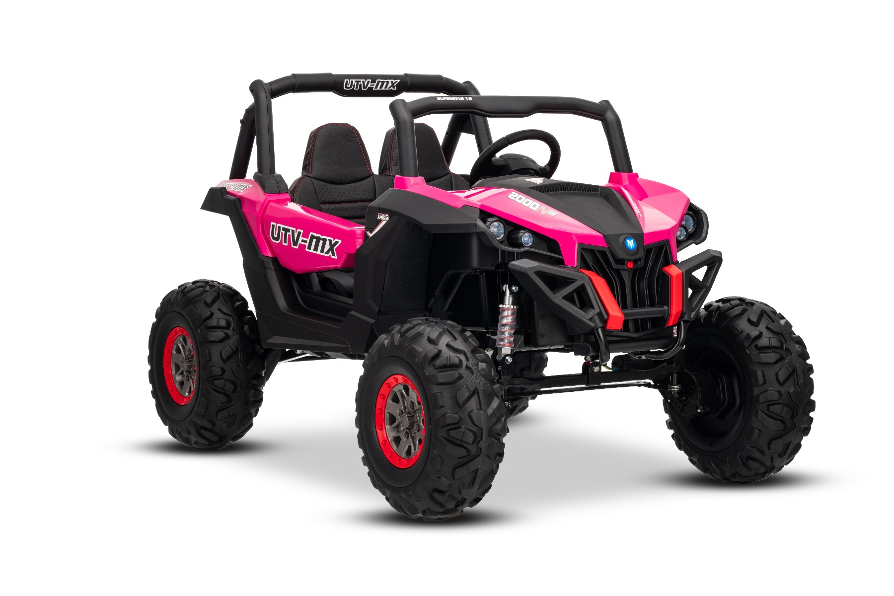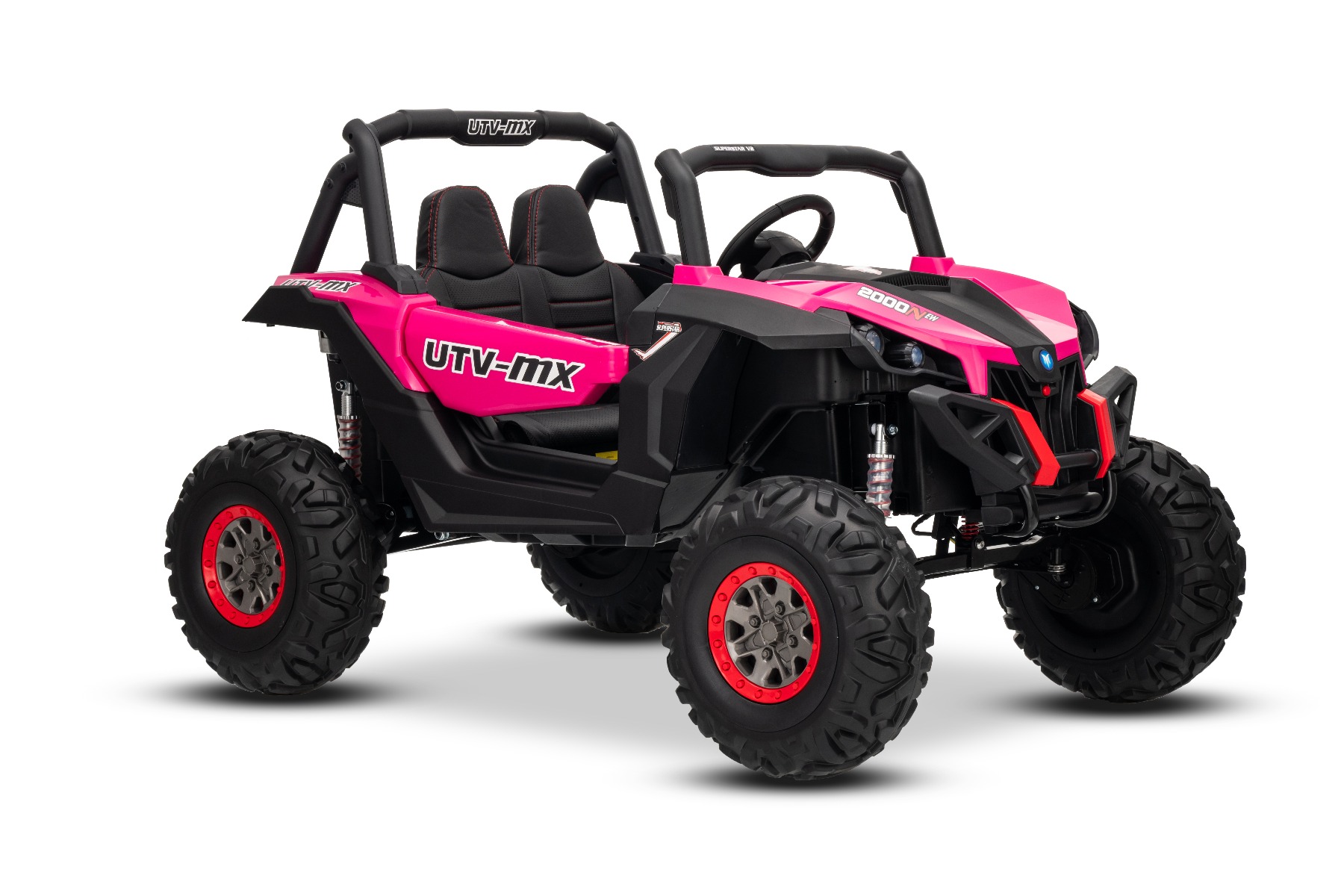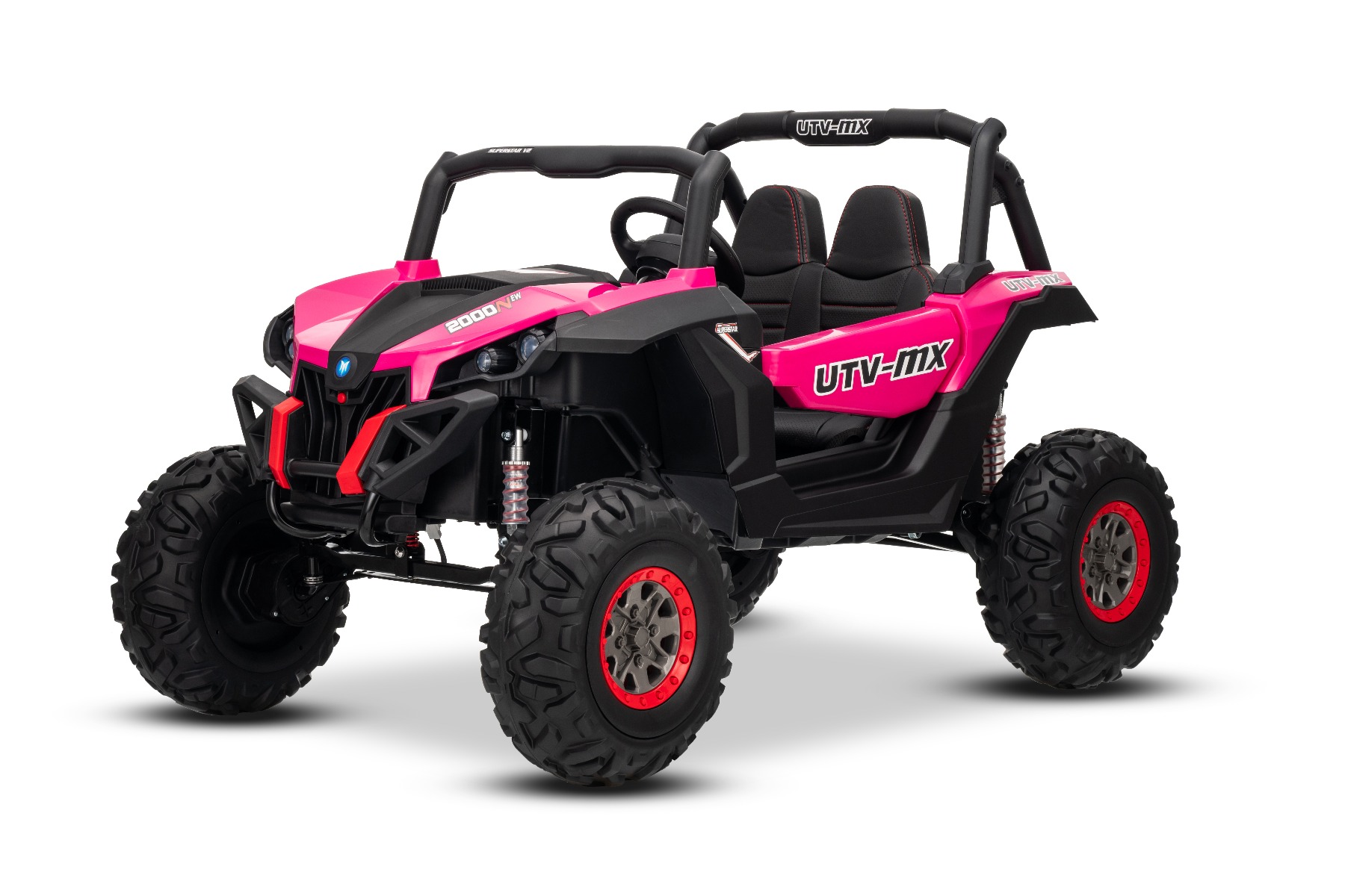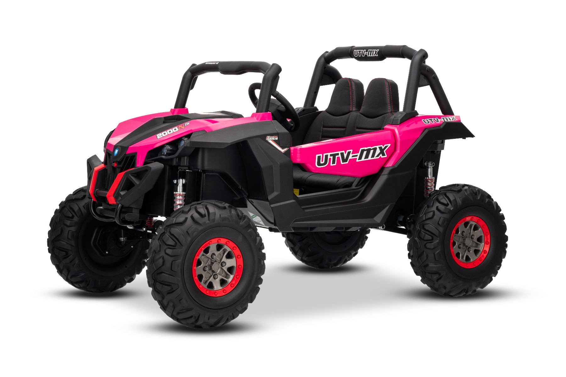 Mașinuță electrică de jucărie NEW RSX 24V, roz, tracțiune 4×4, baterie litiu, roți EVA, suspensii, scaun din piele artificială cu două locuri, telecomandă, player MP3 cu intrare USB/AUX