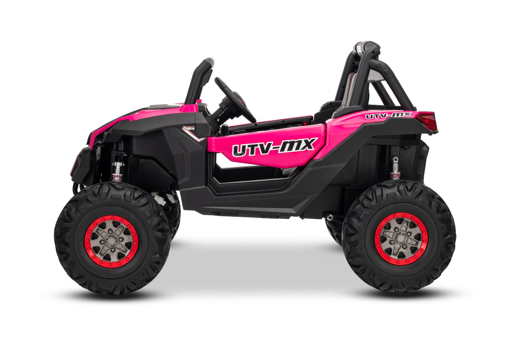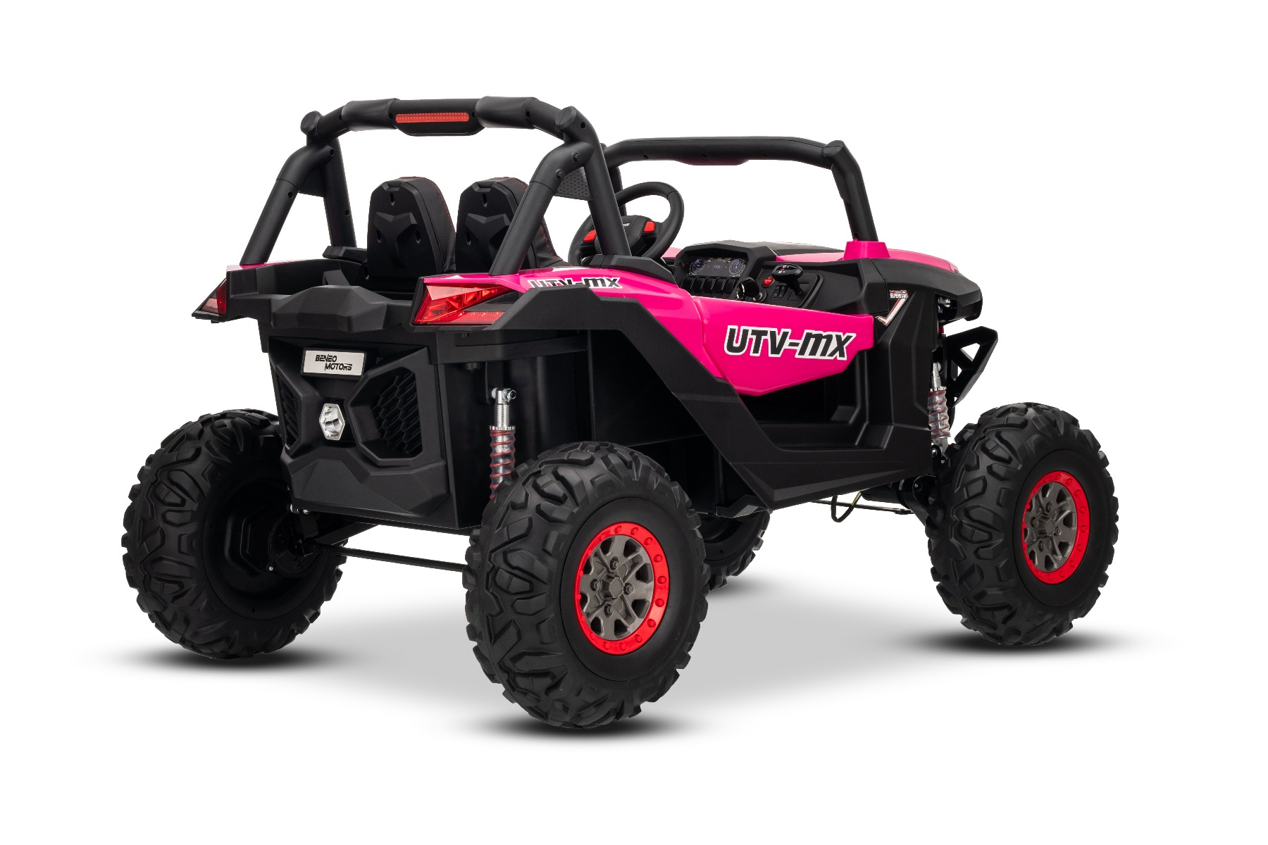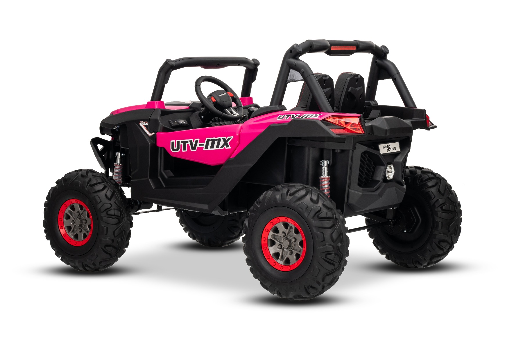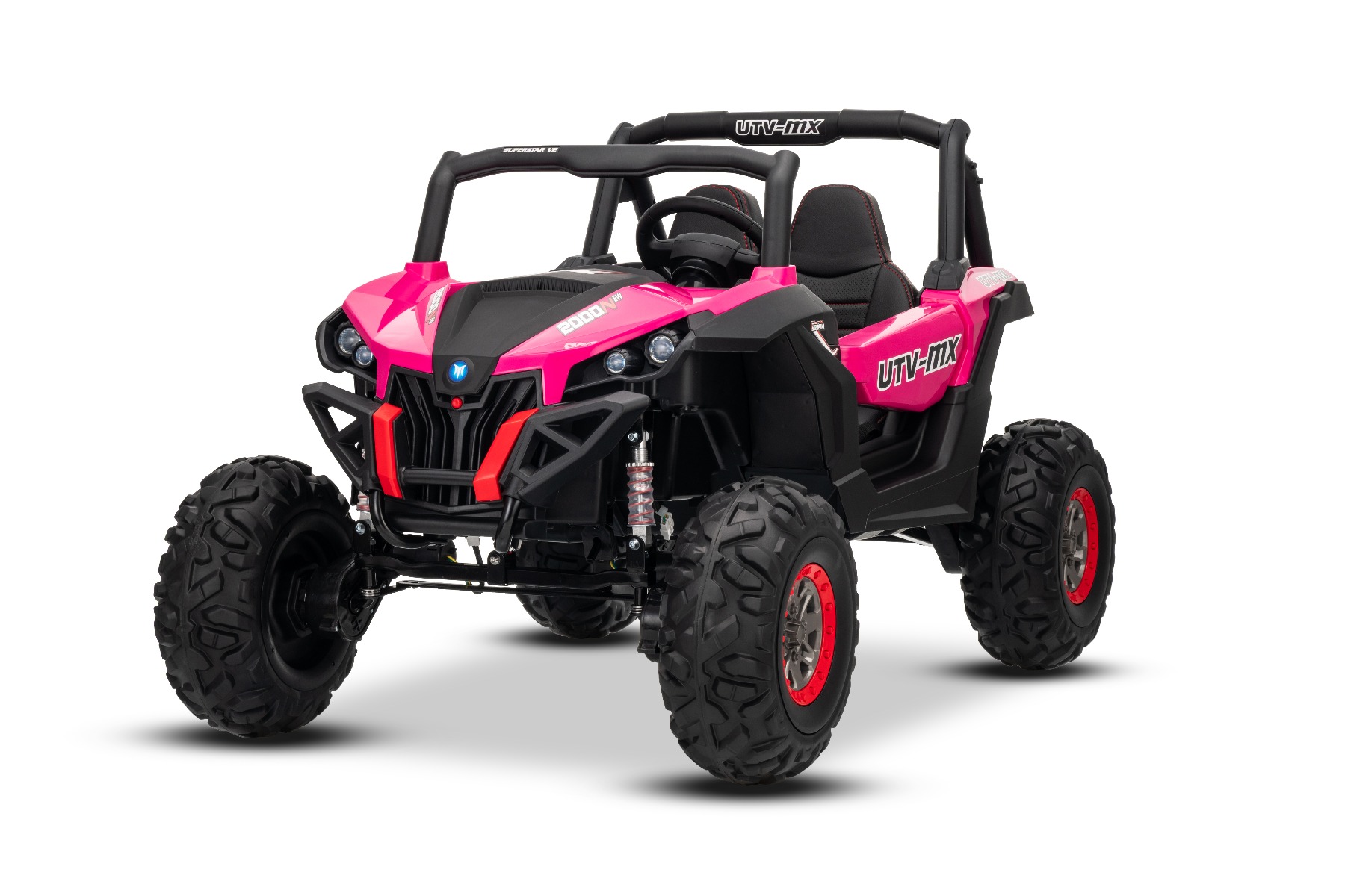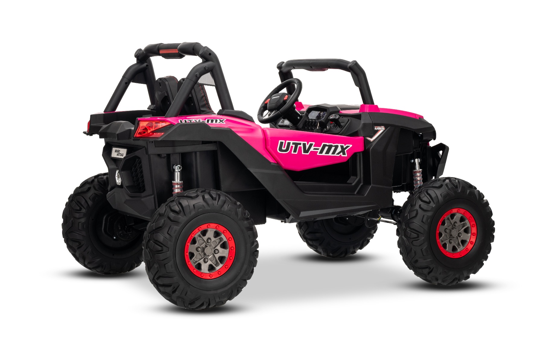 Mașinuță electrică de jucărie NEW RSX 24V, roz, tracțiune 4×4, baterie litiu, roți EVA, suspensii, scaun din piele artificială cu două locuri, telecomandă, player MP3 cu intrare USB/AUX