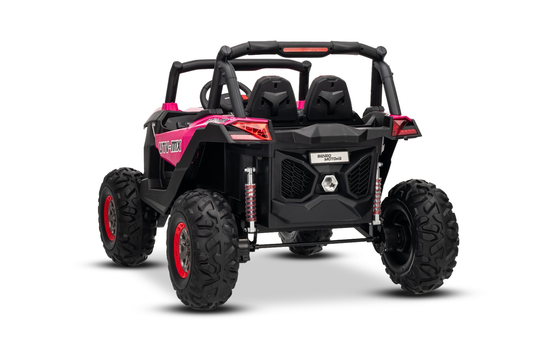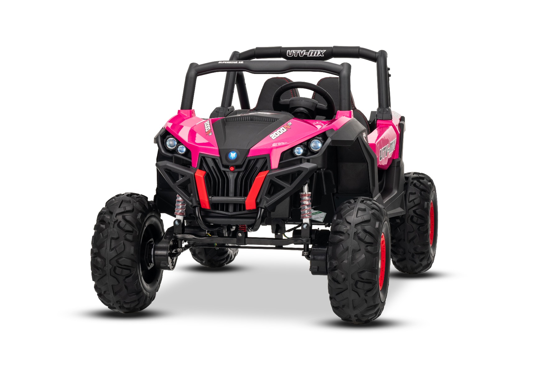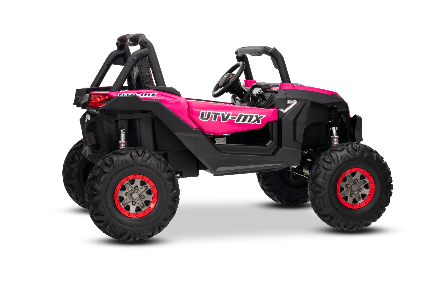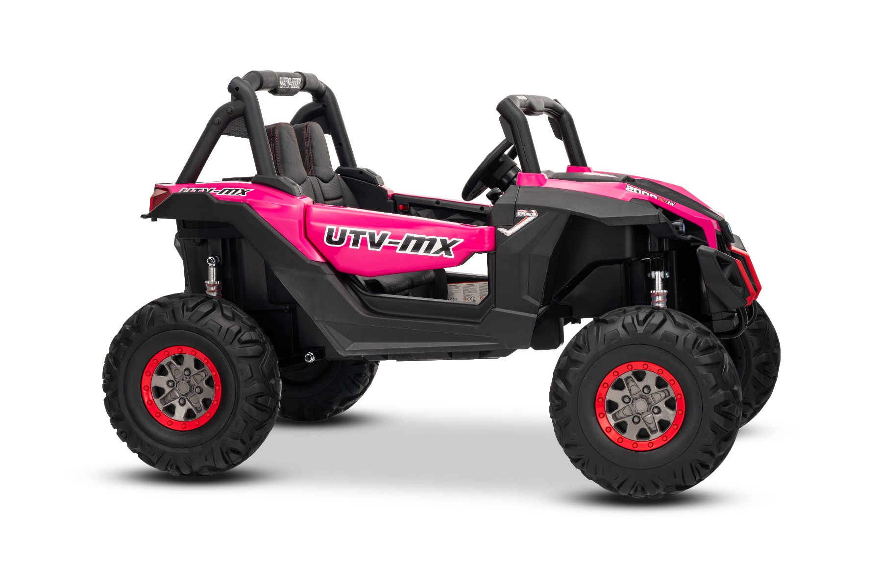 Mașinuță electrică de jucărie NEW RSX 24V, roz, tracțiune 4×4, baterie litiu, roți EVA, suspensii, scaun din piele artificială cu două locuri, telecomandă, player MP3 cu intrare USB/AUX