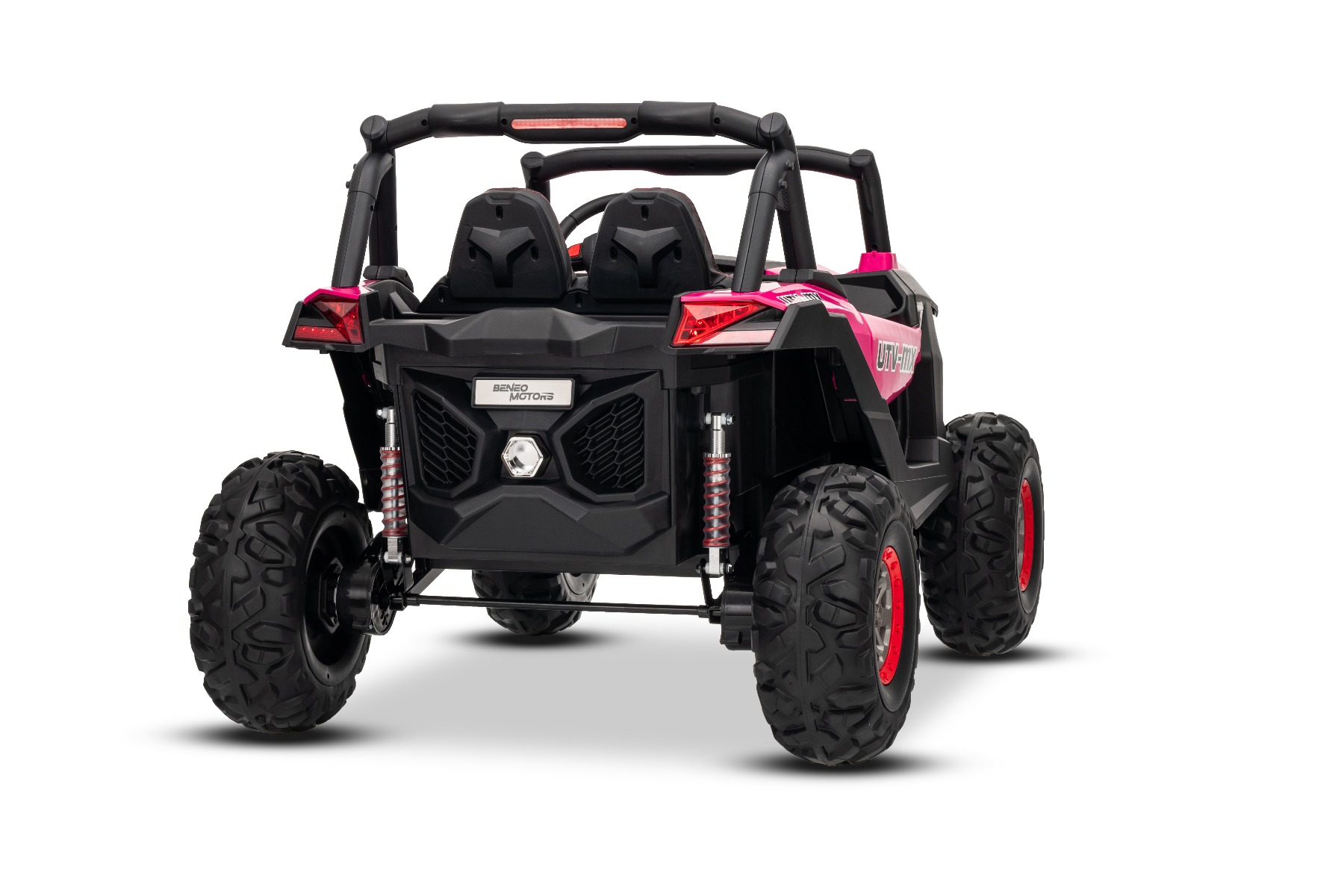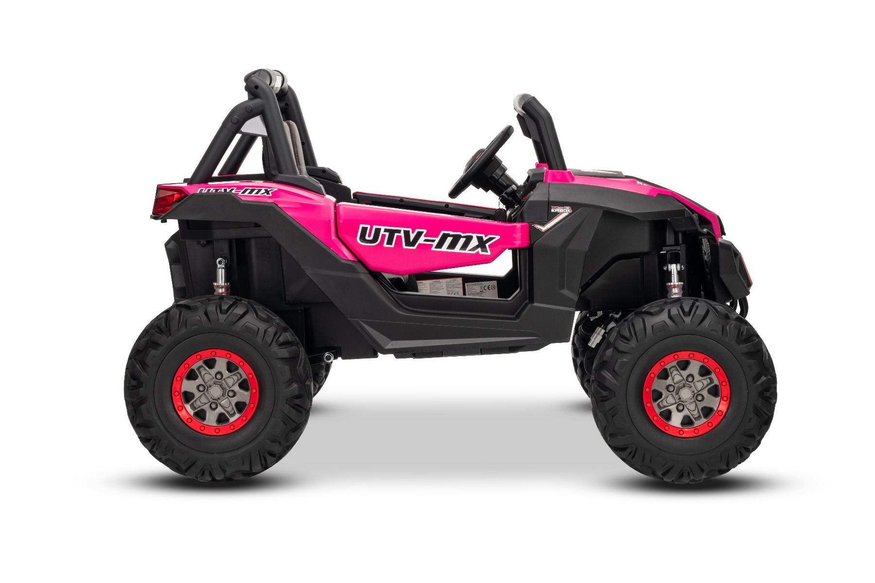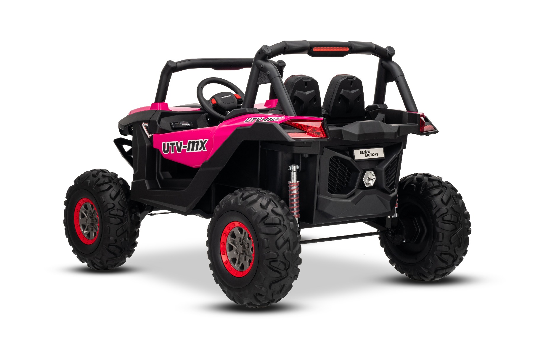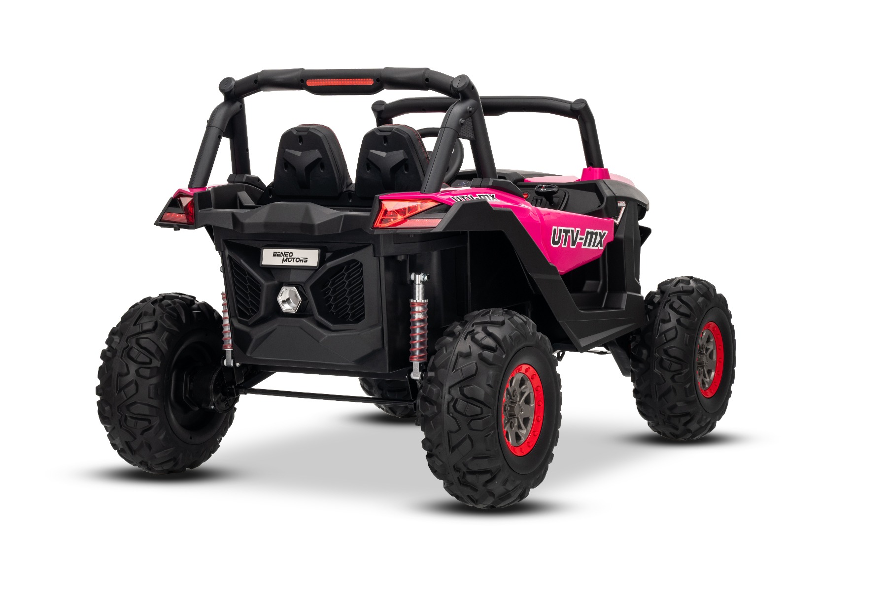 Mașinuță electrică de jucărie NEW RSX 24V, roz, tracțiune 4×4, baterie litiu, roți EVA, suspensii, scaun din piele artificială cu două locuri, telecomandă, player MP3 cu intrare USB/AUX