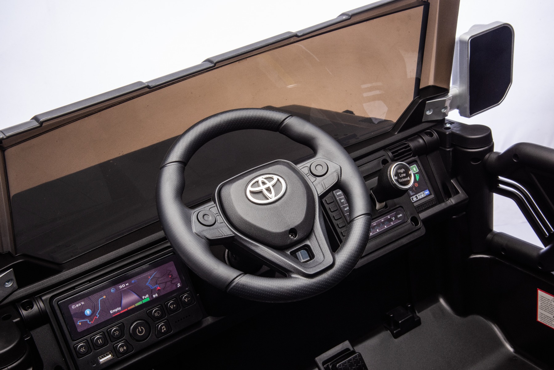 Mașină electrică de jucărie licențiată Toyota FJ Cruiser XXL (cu două locuri) cu tracțiune 4X4 NOU: Baterie litiu 22.2V4.5AH Mașinuța Toyota FJ Cruiser XXL este confortabilă pentru doi copii, având o lățime a scaunului de 58 cm. Datorită șasiului înalt, cu punte spate cu suspensii și scaun dublu, oferă o călătorie confortabilă chiar și pe teren accidentat. Mașinuța este echipată cu lumini LED și o unitate audio inovatoare, cu muzică modernă, intrare USB/AUX și conexiune BLUETOOTH. Pentru siguranța copilului, există o centură de siguranță reglabilă pentru doi copii pe scaun. Lumini LED și pe rampa de iluminare pentru o vizibilitate mai mare în întuneric. Telecomandă de 2,4 GHz cu conectare la o anumită mașinuță. Permite controlul deplin asupra vehiculului, setând viteza mică, medie și mare și activând frâna de urgență. Tracțiune 4×4 cu șasiu înalt – Tracțiunea este asigurată de patru motoare de 55 W pe toate roțile, ceea ce face ca mașinuța să fie potrivită pentru utilizare off-road. Puntea spate este cu arcuri, ceea ce crește confortul la volan. Baterie litiu (22.2V4.5AH): Durata lungă de viață – Pot rezista la mai multe cicluri de încărcare. Capacitate mare – Sunt ușoare și puternice. Încărcare rapidă – Se încarcă rapid și se descarcă lent. Accelerare lină – După apăsarea pedalei de accelerație, mașina începe să se miște lin. Pornirea este controlată electronic pentru a fi cât mai lină posibil, datorită sistemului integrat de accelerare lină. Datorită acestui fapt, nu există smucituri neplăcute la pornire atunci când se apasă pedala. Potrivit și pentru copiii mai mici – datorită posibilității de a seta o viteză mai mică, centurilor de siguranță și pornirii line. Pachetul include: adaptor cu indicator (nu supraîncarcă bateria), baterie reîncărcabilă și telecomandă. Caracteristici 4×4 Lumini LED MP3 player Port USB Card SD Telecomandă Volan multifunctional Suspensii Uși care se deschid Centură de siguranță Bluetooth Selector viteză Buton pornire Baterie litiu-ion Caracteristici speciale Uși care se deschid Volan multifuncțional Lumini LED și pe rampă Specificații tehnice / Dimensiunile produsului Dimensiuni: 122 x 86 x 90 cm Dimensiuni pachet: 107 x 71 x 33 cm Potrivit pentru doi copii Pornire lină a motorului – fără zdruncinări la accelerare Telecomandă de 2,4 GHz cu frână de urgență Opțiune de reglare a vitezei de deplasare de pe telecomandă Lumini LED funcționale, inclusiv pe bara luminoasă Indicator de viteză setat pe telecomandă Roți mari cu șasiu ridicat! Punte spate cu suspensii Centuri de siguranță Două scaune cu o lățime totală de 58 cm Conexiune USB, AUX, Bluetooth Greutate: 30,0 kg. Capacitate de încărcare: 50 kg Viteză: 3 – 7 km/h. Tracțiune: 4 x Motor 24V 55W Baterie: litiu 22,2V/4.5AH Adaptor: de la 220V la 24V / 1000mA. Încărcare: de la 4 la 5 ore Autonomie: 2,5 până la 3 ore, în funcție de greutatea copilului și teren Categorie de vârstă: 3 până la 6 ani