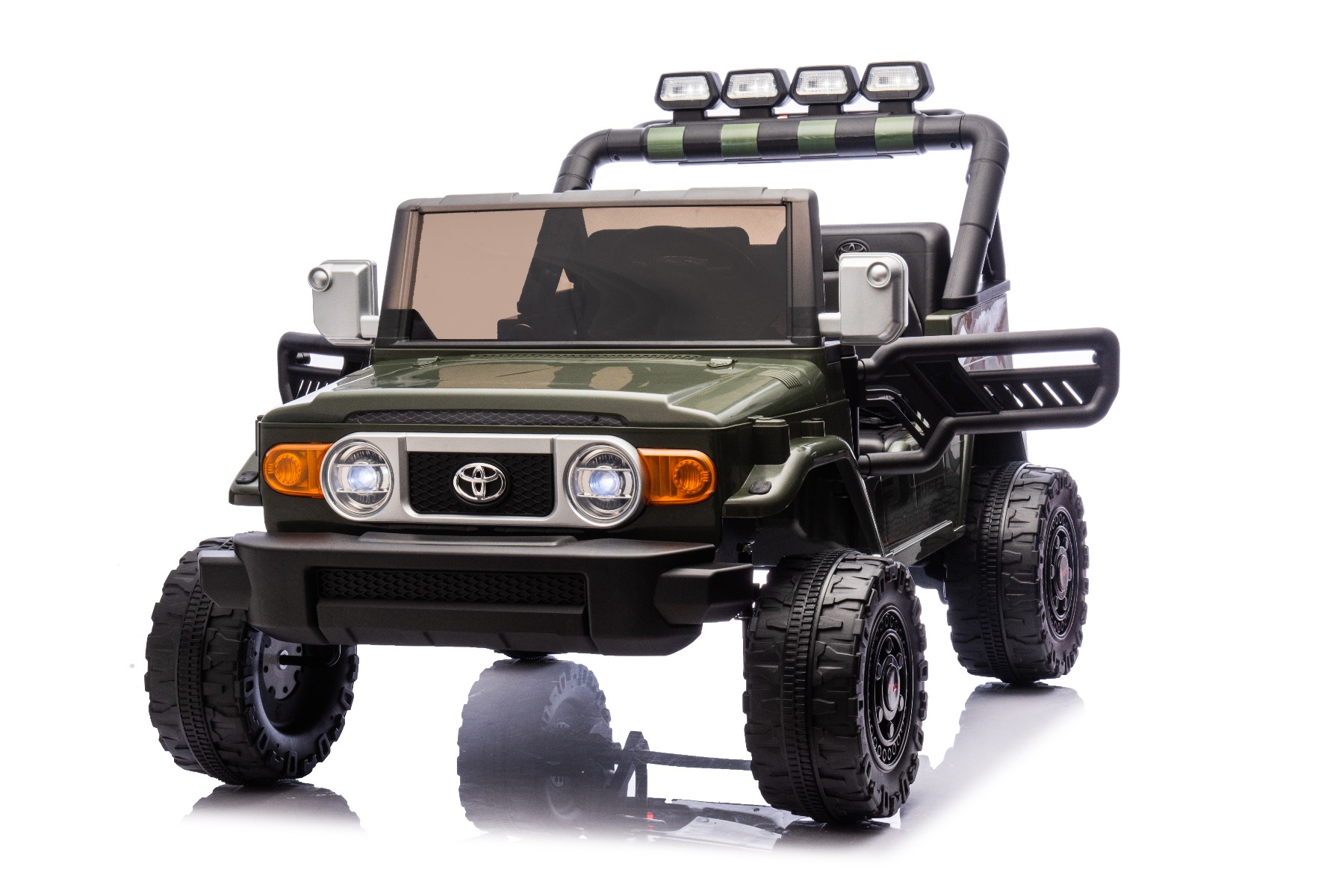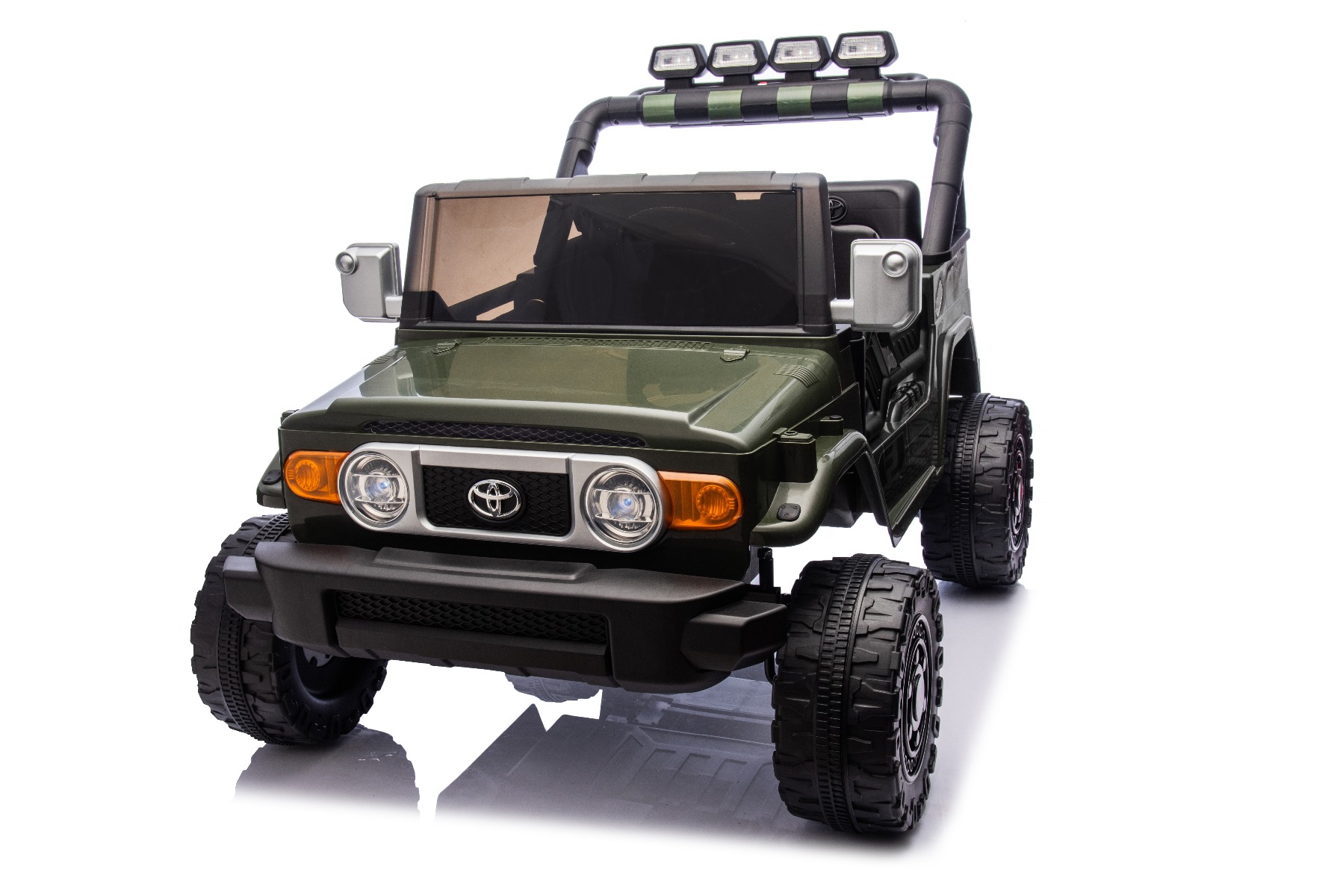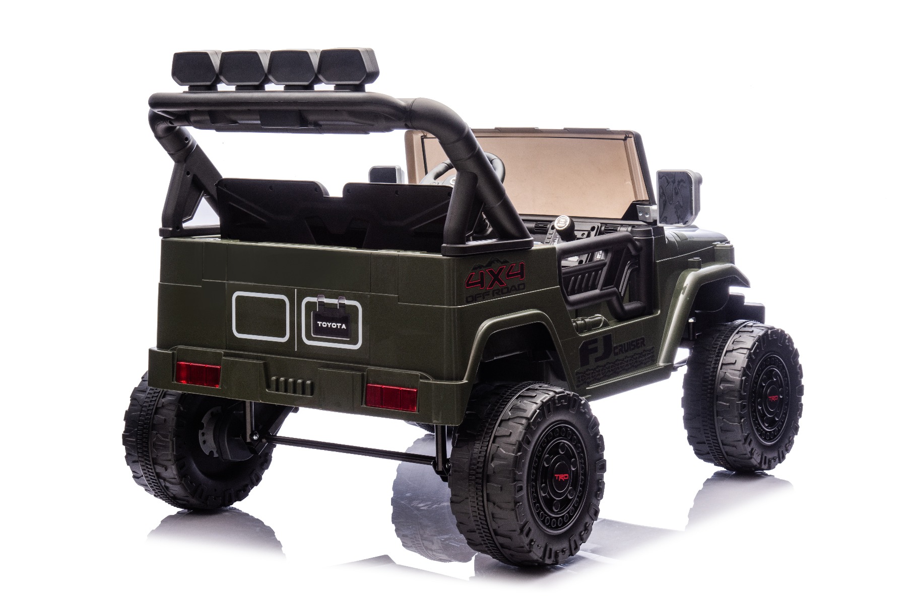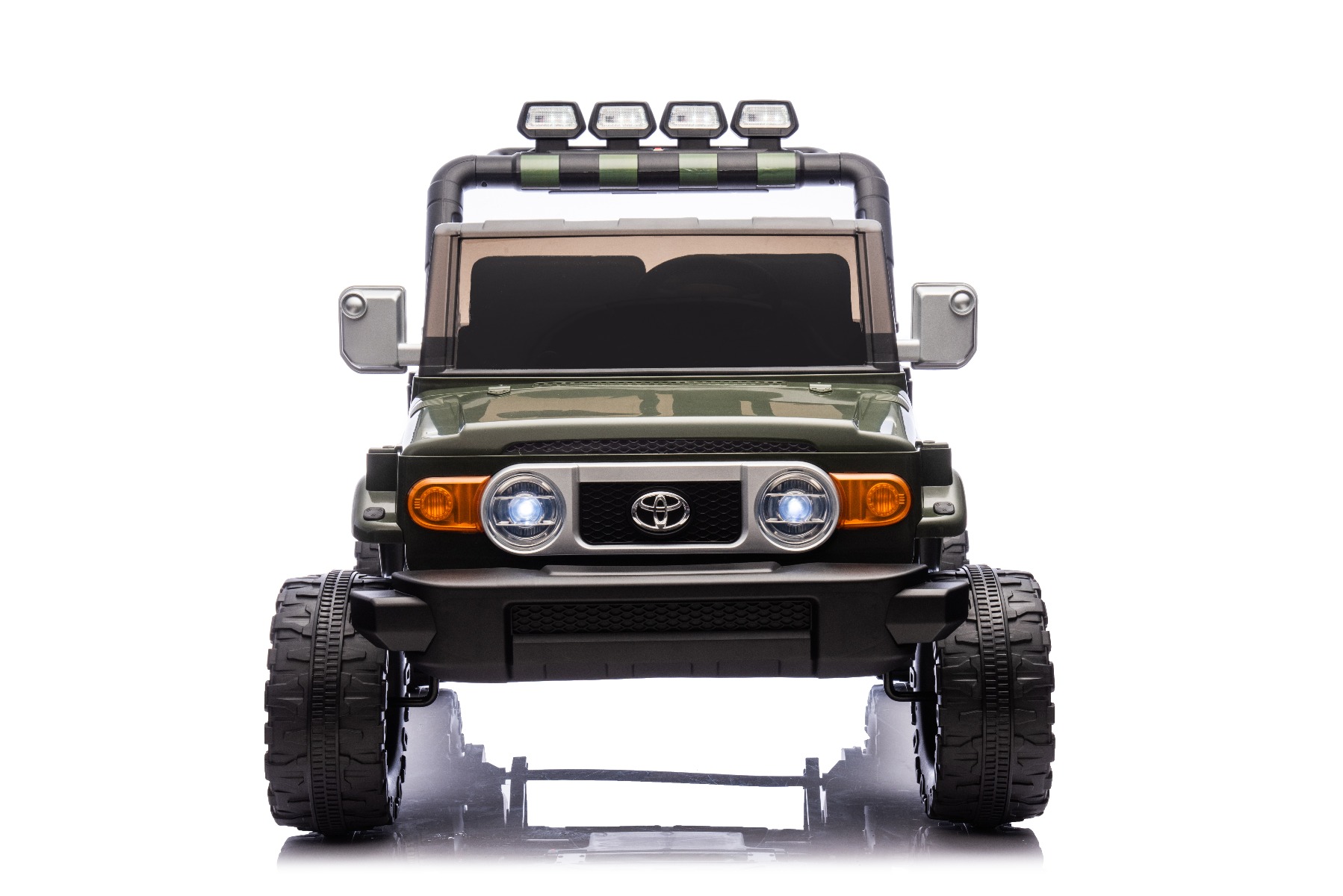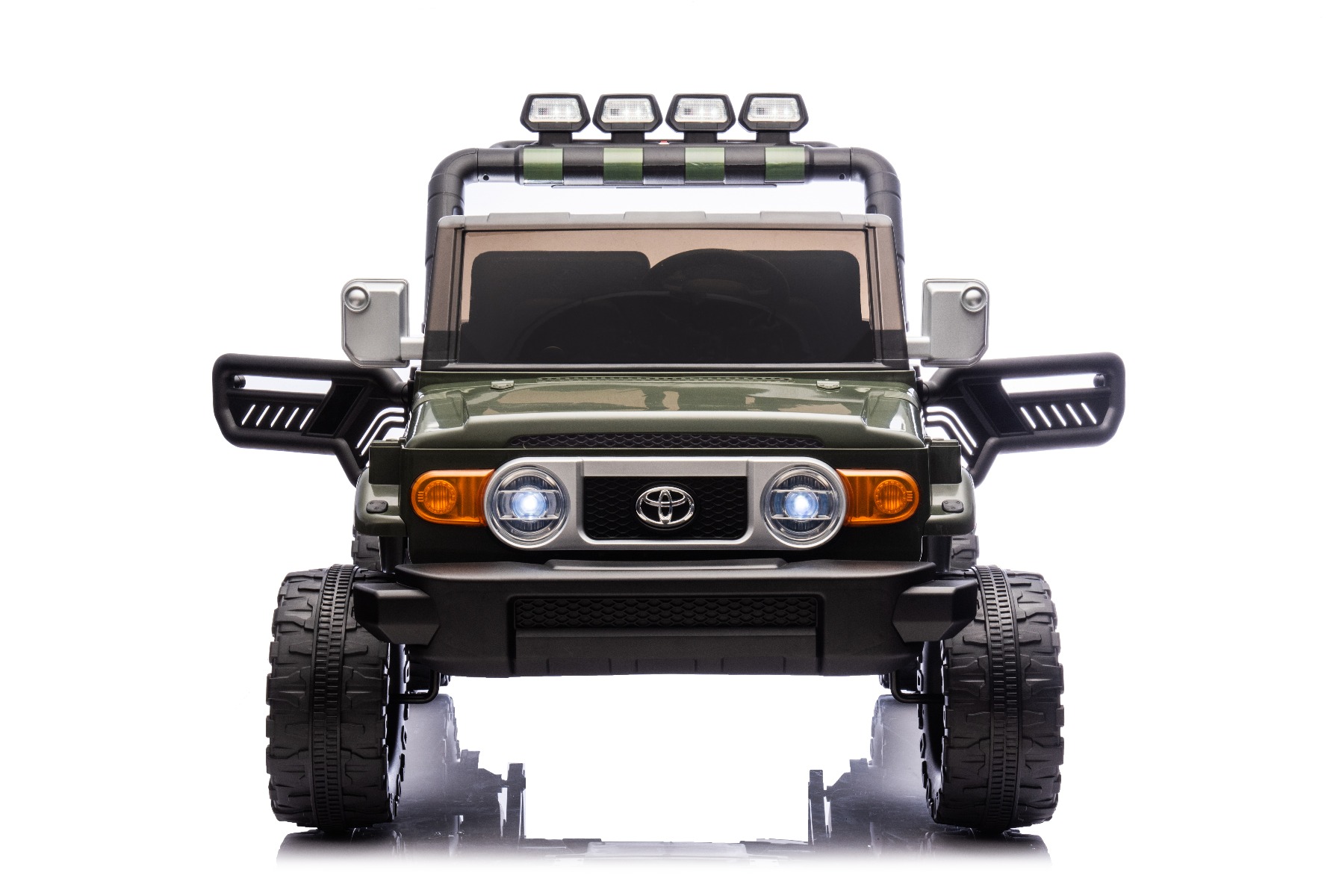Mașinuță electrică de jucărie Toyota FJ Cruiser XXL cu tracțiune 4×4, autorizată (cu două locuri), verde, baterie litiu portabilă, șasiu înalt, două locuri, punte spate cu suspensie, telecomandă 2,4 GHz, player MP3 cu Bluetooth, lumini LED