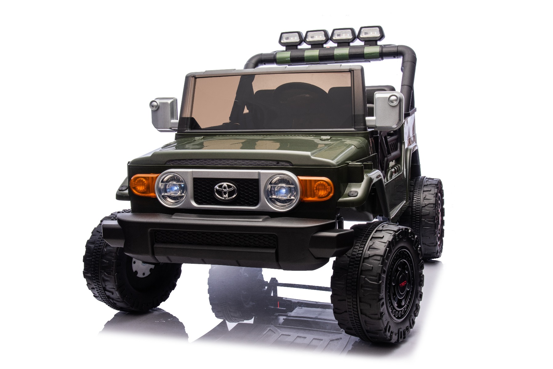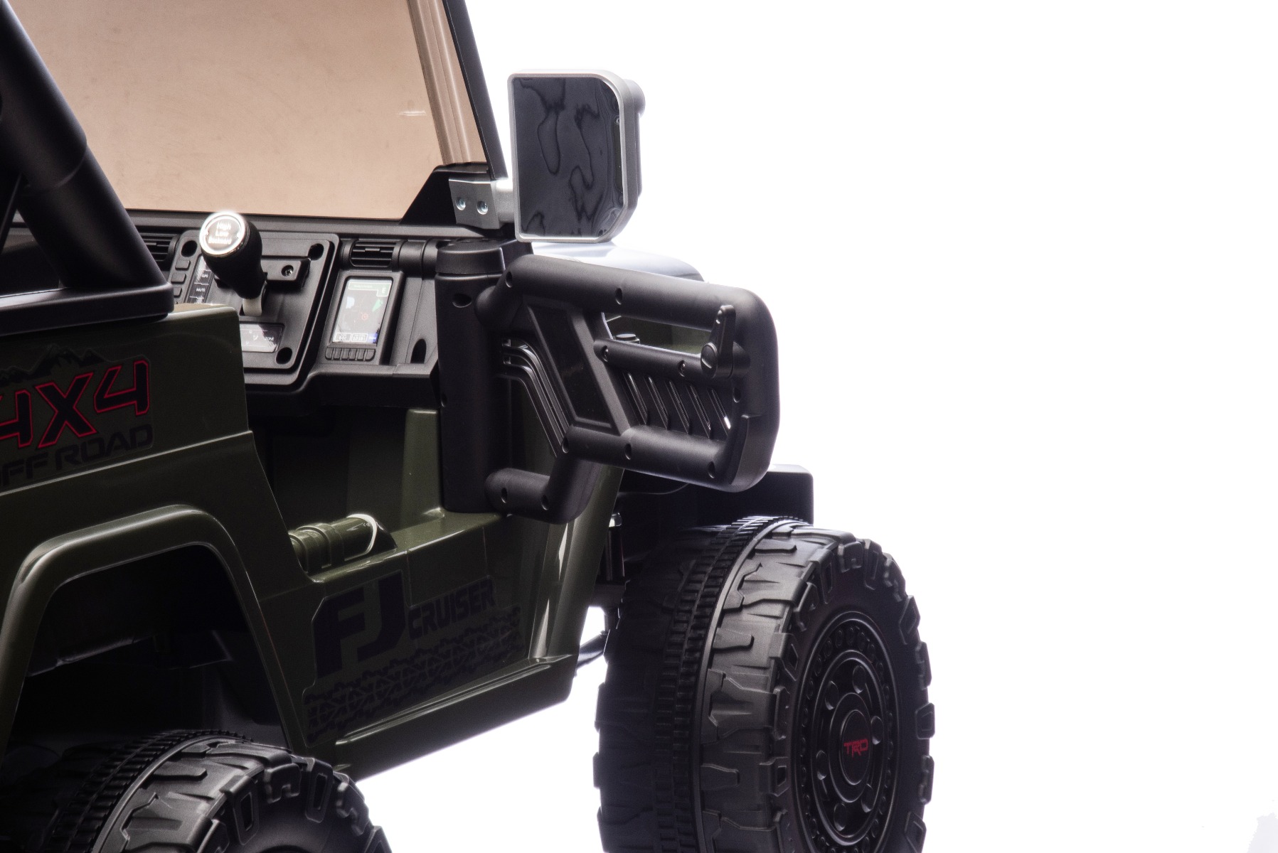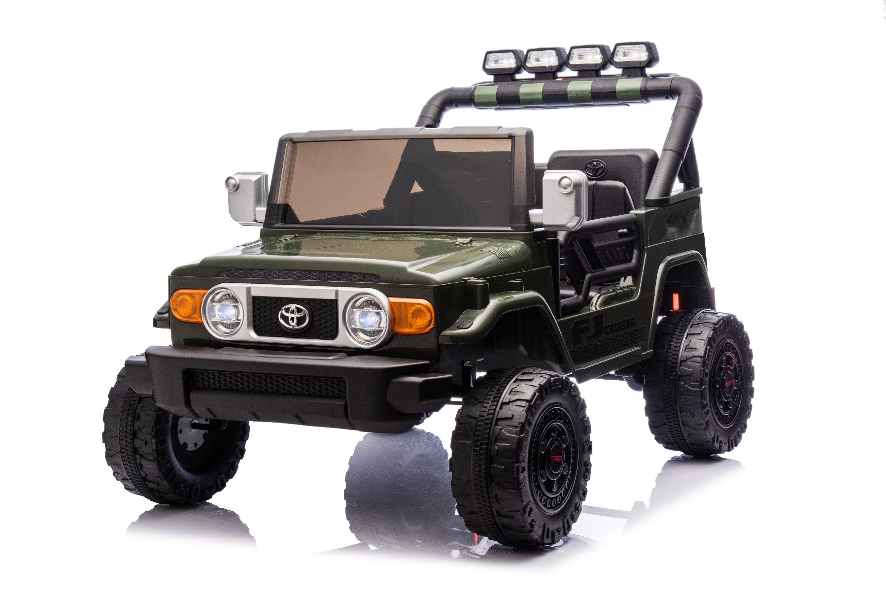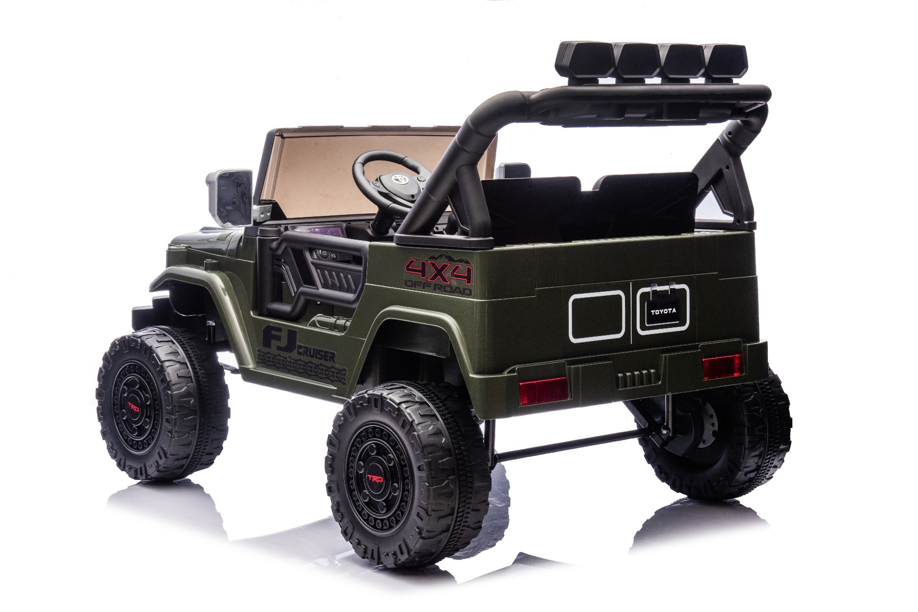 Mașinuță electrică de jucărie Toyota FJ Cruiser XXL cu tracțiune 4×4, autorizată (cu două locuri), verde, baterie litiu portabilă, șasiu înalt, două locuri, punte spate cu suspensie, telecomandă 2,4 GHz, player MP3 cu Bluetooth, lumini LED