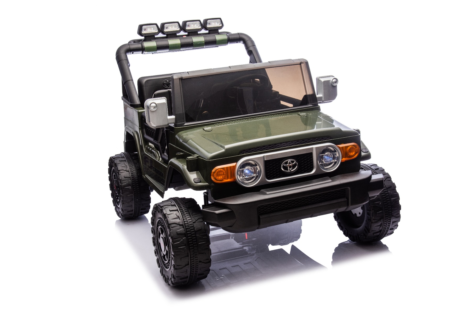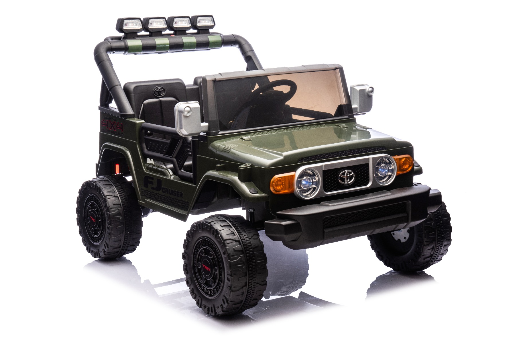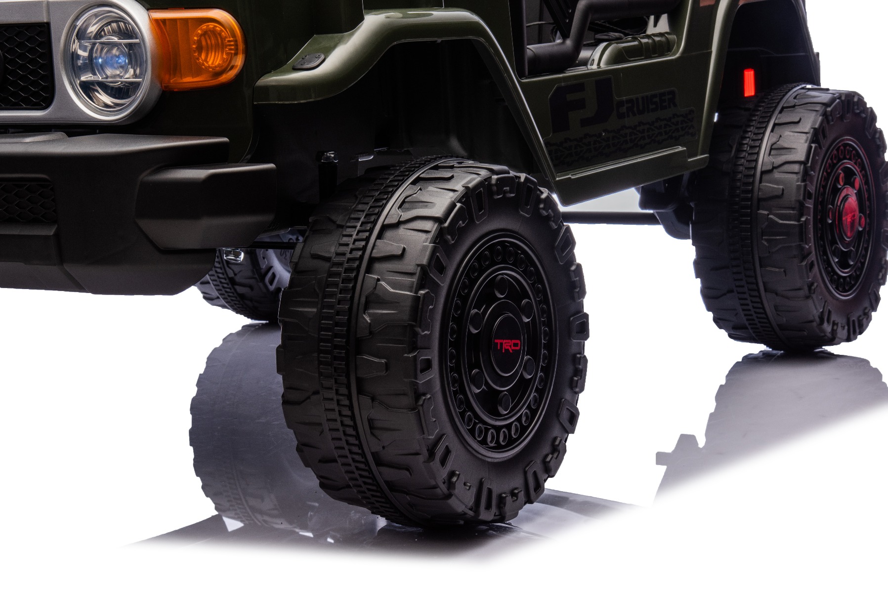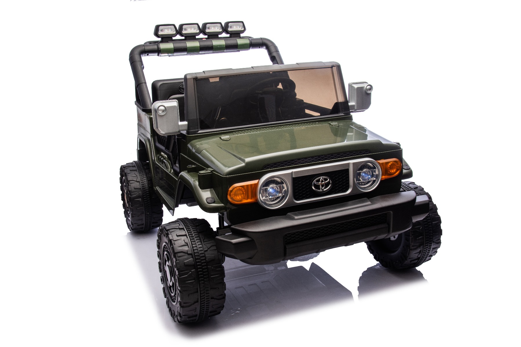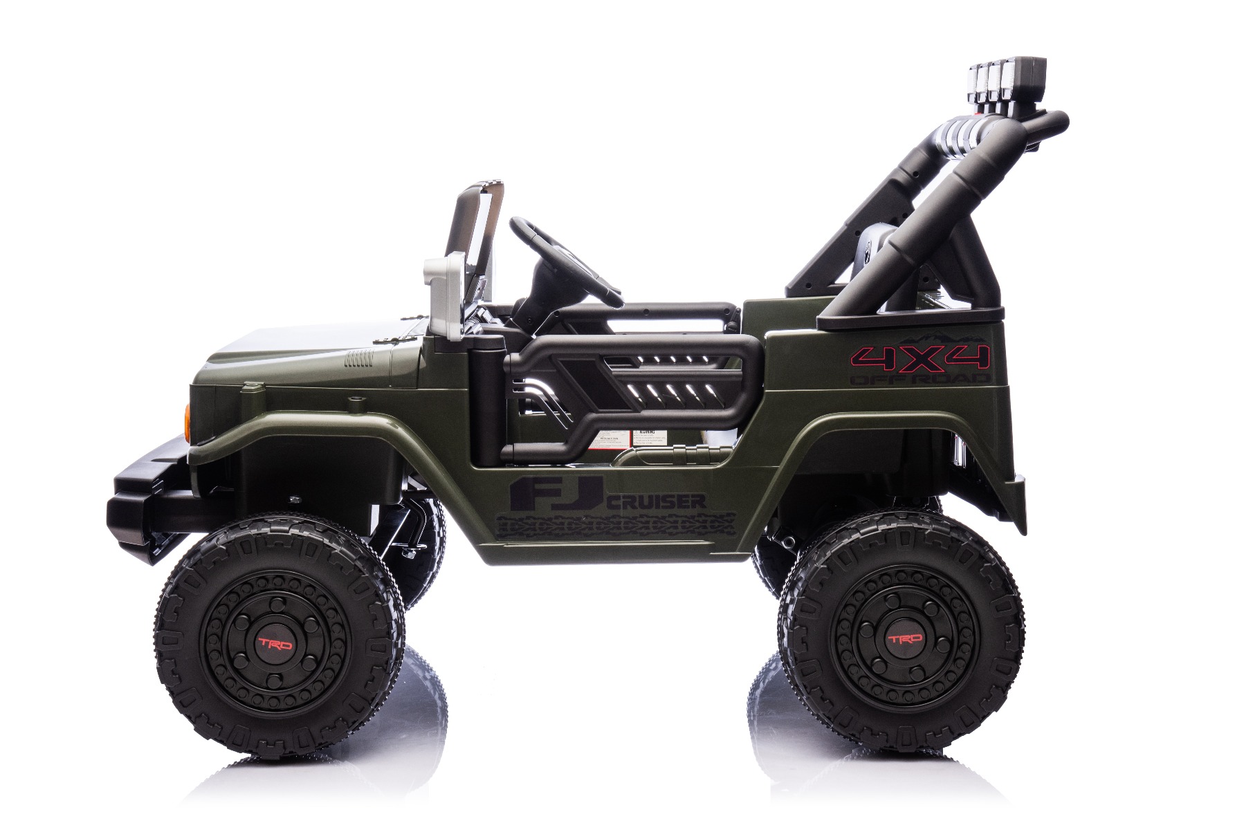 Mașinuță electrică de jucărie Toyota FJ Cruiser XXL cu tracțiune 4×4, autorizată (cu două locuri), verde, baterie litiu portabilă, șasiu înalt, două locuri, punte spate cu suspensie, telecomandă 2,4 GHz, player MP3 cu Bluetooth, lumini LED