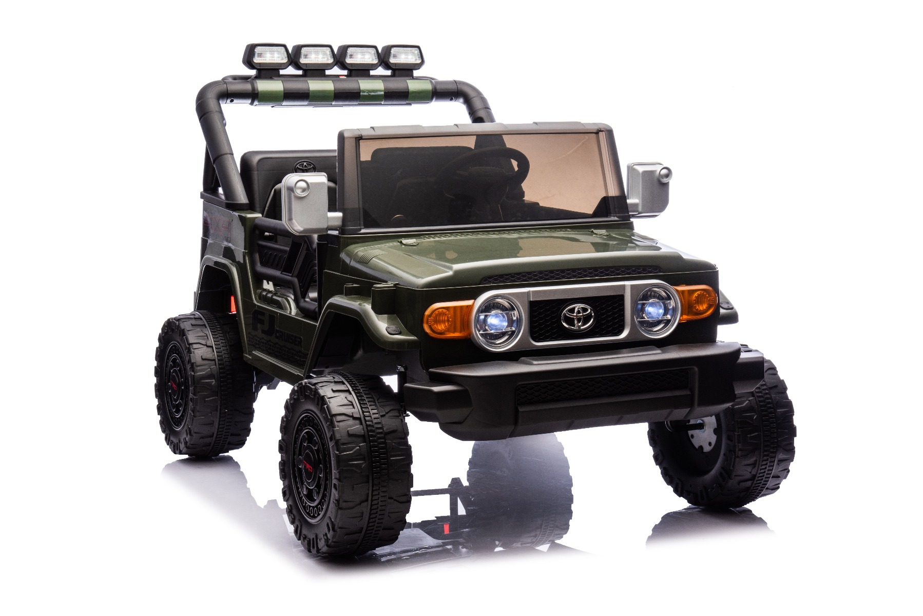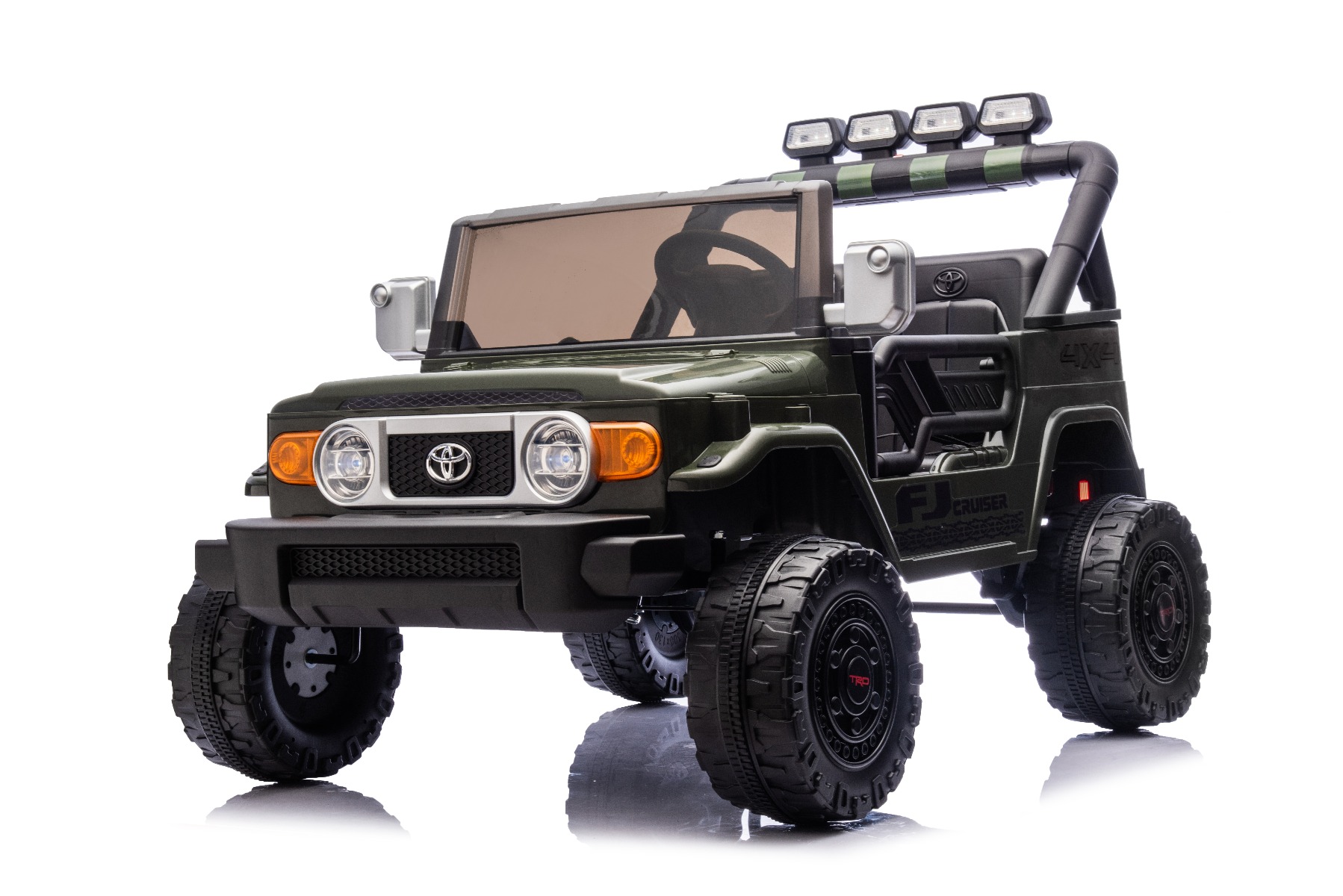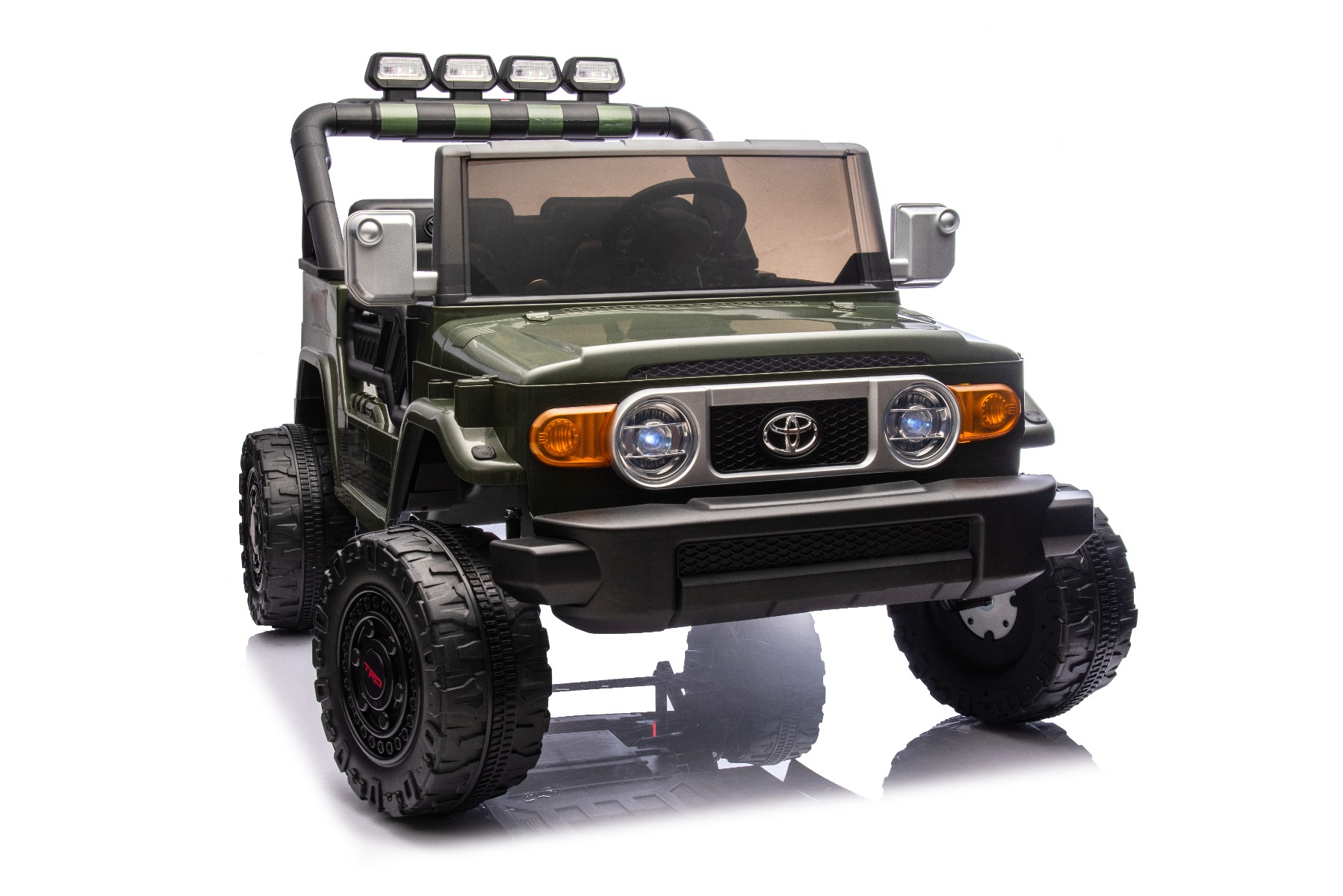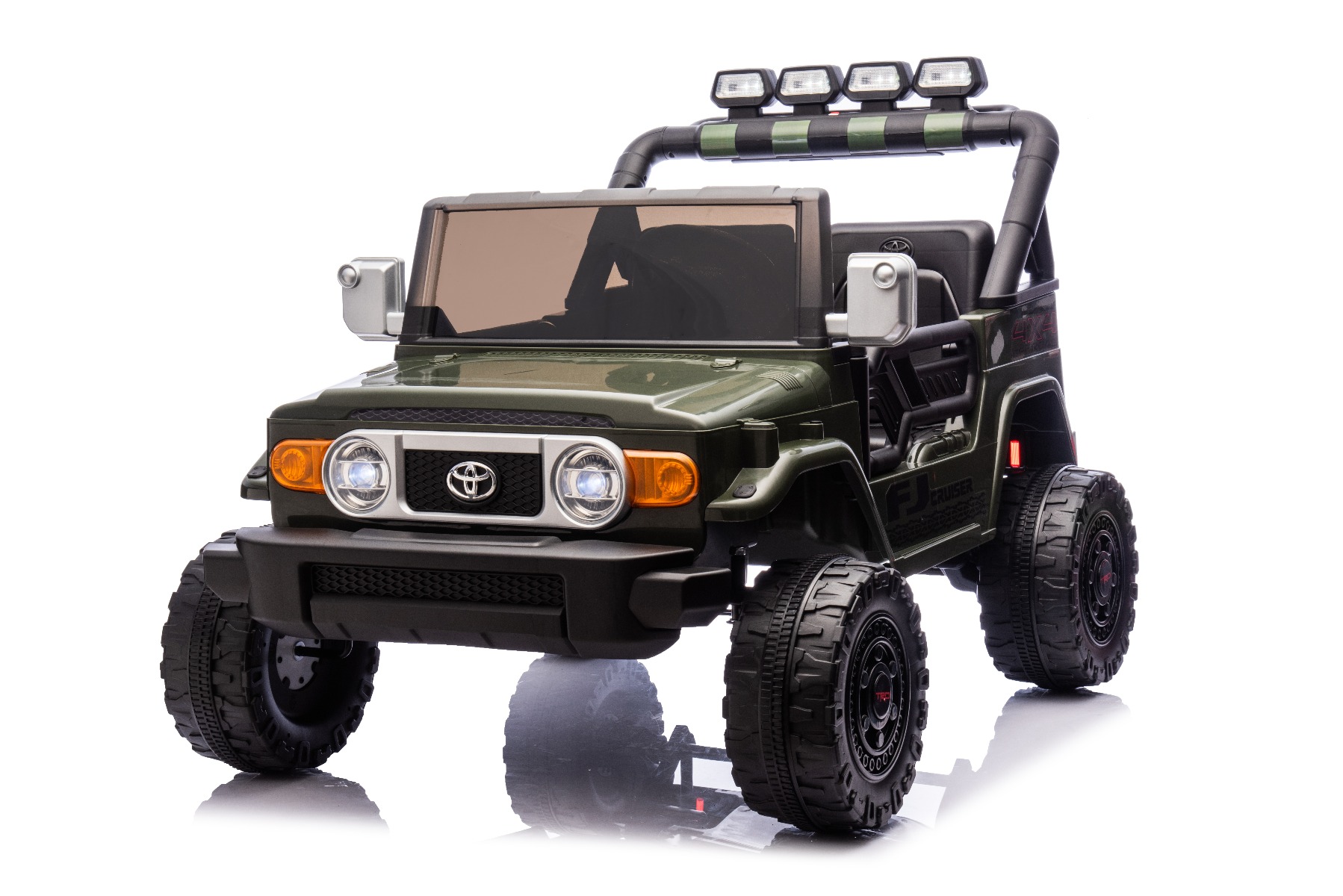 Mașinuță electrică de jucărie Toyota FJ Cruiser XXL cu tracțiune 4×4, autorizată (cu două locuri), verde, baterie litiu portabilă, șasiu înalt, două locuri, punte spate cu suspensie, telecomandă 2,4 GHz, player MP3 cu Bluetooth, lumini LED