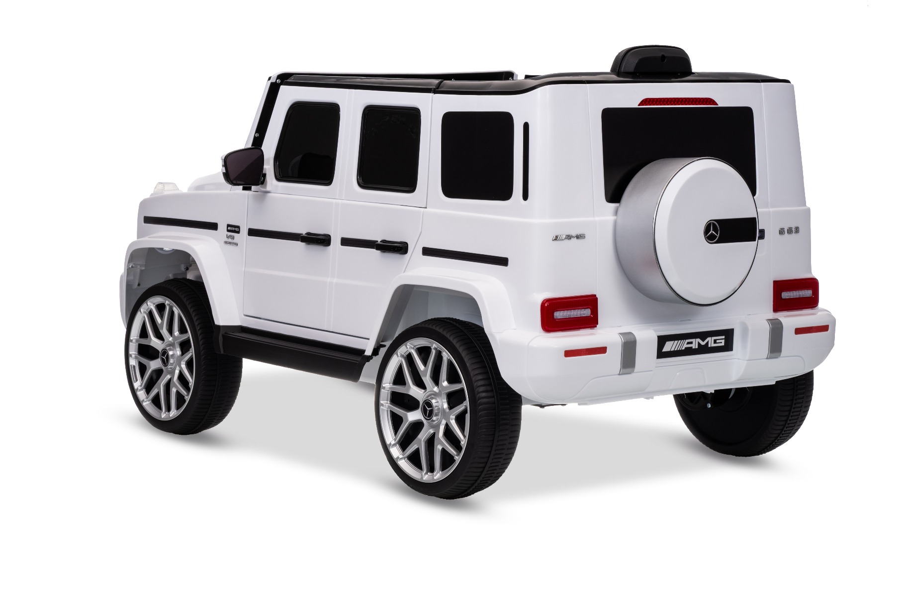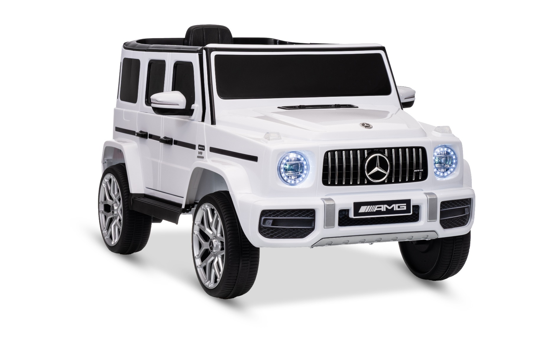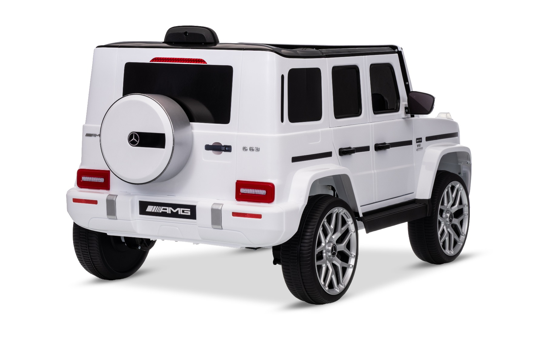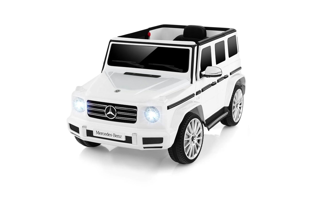Mașinuță electrică Mercedes G63 12V, alb, scaun individual, suspensii față/spate, baterie litiu, telecomandă 2.4 GHz, 2XMOTOR, USB, Bluetooth, licență ORIGINALĂ