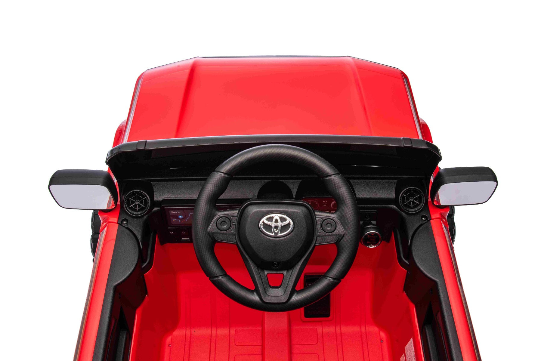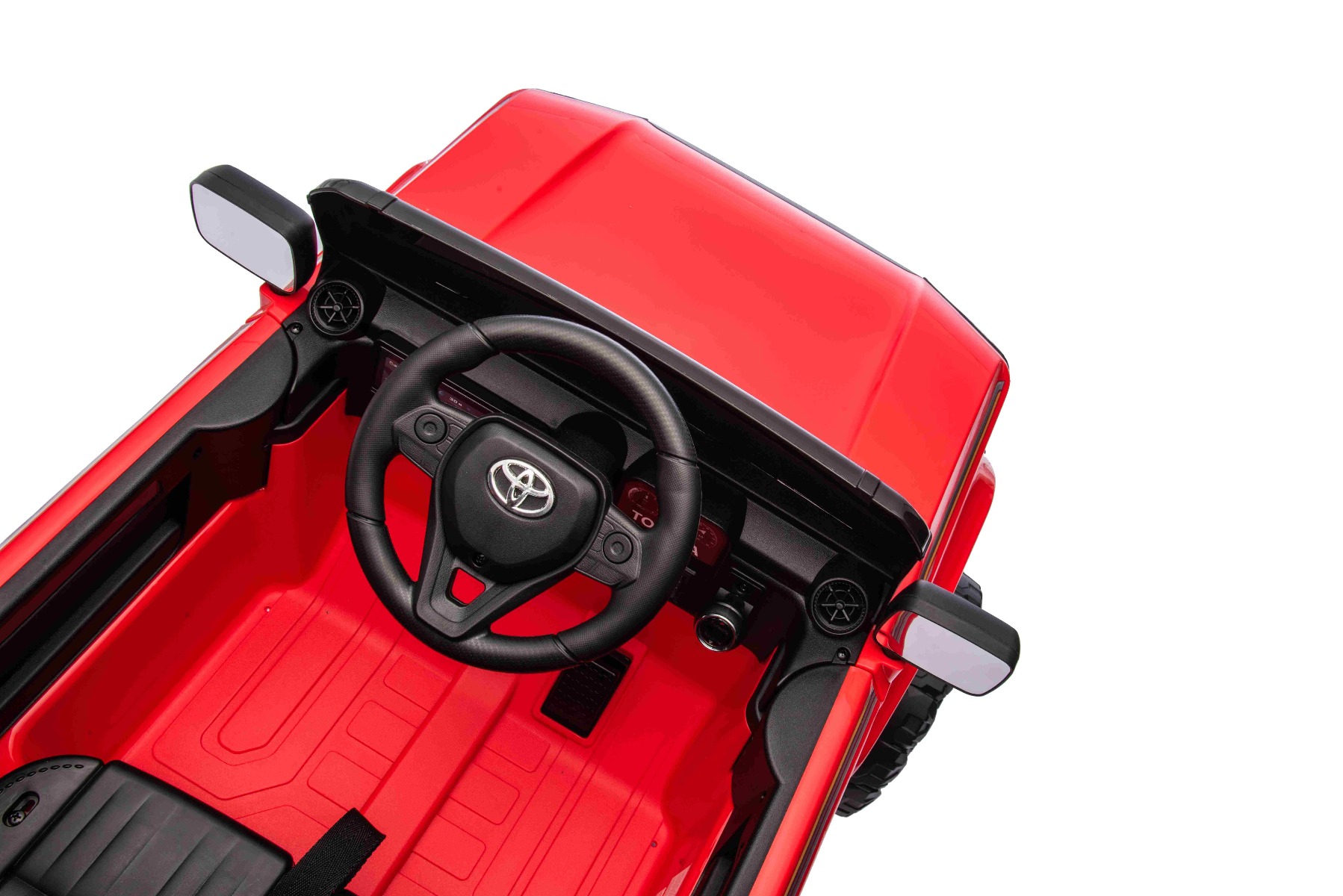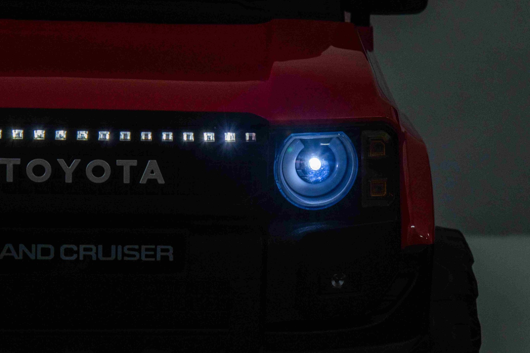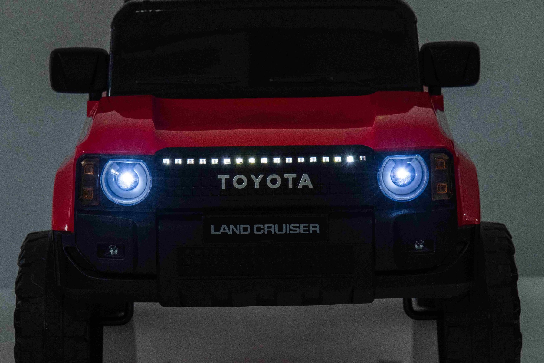 Mașinuță electrică Toyota Landcruiser 12V, roșu, scaun lat, telecomandă 2.4 GHz, intrare USB / AUX, Bluetooth, suspensie, baterie litiu, lumini LED, motor 2 x 25W, licență ORIGINALĂ