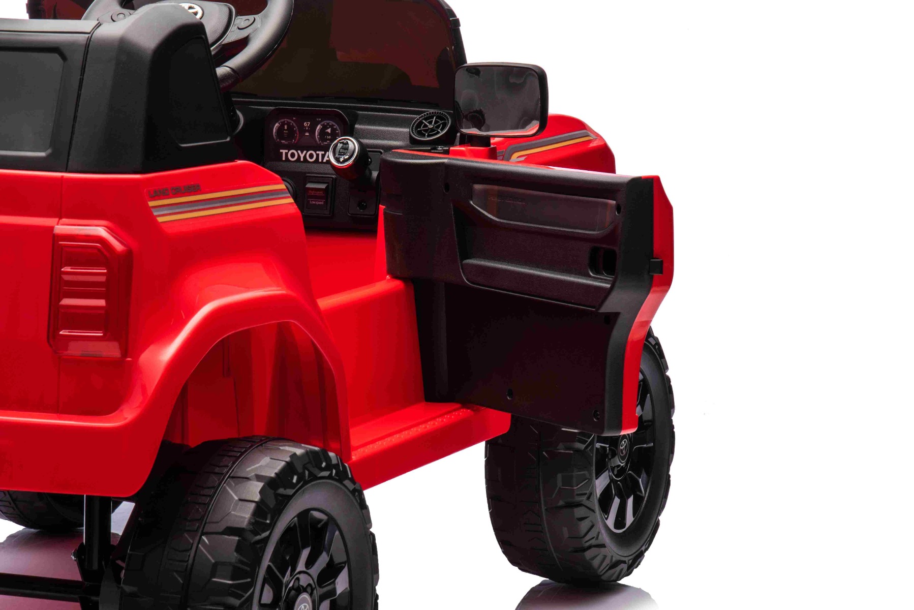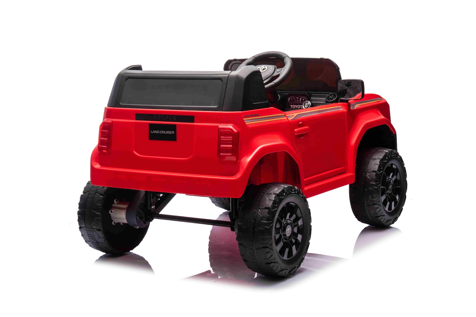 Mașină electrică de jucărie licențiată Toyota Land Cruiser NOU: Baterie litiu (12V/4Ah) Cel mai recent model Toyota Land Cruiser pentru copii combină un aspect luxos cu tehnologia modernă. Designul realizat cu precizie este completat de caracteristici atractive, cum ar fi un player MP3 cu intrare USB/AUX și conexiune Bluetooth, în timp ce volumul tuturor efectelor sonore este ușor de controlat direct de pe player. Bineînțeles, există și redare de muzică, iluminare LED frontală și un indicator al capacității bateriei care informează despre capacitatea rămasă în volți. Volan multifuncțional – Cu butoane pentru controlul claxonului și comutarea muzicii Mașina este echipată cu o telecomandă de nouă generație de 2,4 GHz, cu un buton de pornire iluminat. Siguranța este asigurată de o frână de urgență de pe controler, care dezactivează imediat toate funcțiile dacă este necesar, astfel încât părintele obține control deplin asupra călătoriei. Există, de asemenea, o centură de siguranță care oferă siguranță în timpul conducerii. Baterie cu litiu (12V4AH): Durată lungă de viață – Pot rezista la mai multe cicluri de încărcare. Capacitate mare – Sunt ușoare și puternice. Încărcare rapidă – Se încarcă rapid și se descarcă lent. Tracțiunea ambelor roți spate este asigurată de două motoare de 25W, care împreună cu suspensia spate oferă o călătorie stabilă și confortabilă chiar și pe suprafețe denivelate. Mașina are o frână de parcare electrică, o imitație realistă a vitezometrului și posibilitatea de a merge înainte și înapoi. Există două viteze de mers înainte (lent/rapid) și o viteză de mers înapoi, în timp ce viteza de deplasare poate fi reglată și direct prin intermediul telecomenzii. Accelerare lină – Când apeși pedala de accelerație, mașina începe să se deplaseze, iar pornirea este controlată electronic pentru a fi lină datorită accelerației line integrate. Aceasta înseamnă că nu există smucituri neplăcute atunci când pedala este apăsată. Caracteristici Lumini LED MP3 player Port USB Telecomandă Volan multifunctional Suspensii Uși care se deschid Centură de siguranță Bluetooth Selector viteză Buton pornire Baterie litiu-ion Caracteristici speciale Player MP3 cu Bluetooth Uși care se deschid Centură de siguranță cu 3 puncte Specificații tehnice / Dimensiunile produsului Model cu licență Tip mașină: cu 1 loc Tracțiunea mașinii: 2×2 Motor mașină: 2x motoare 12 V / 25 W Număr de viteze: 3 (2 înainte și 1 înapoi) Viteză: 3-6 km/h Capacitate de încărcare: max. până la 30 kg Baterie: Litiu 12V / 4Ah Adaptor: de la 220V la 12V / 1000mA. Timp de încărcare: min. 6-8 ore Pornire lină Frână de urgență Centură de siguranță: centură cu 3 puncte Suspensii spate Ușă: deschidere cu blocare Iluminare: faruri Echipament multimedia: MP3, USB, Aux, Bluetooth, control volan Vârstă recomandată: 3 până la 7 ani DIMENSIUNI: 98 x 64 x 57 cm Dimensiuni pachet: 100 x 57 x 32 cm Autonomie: 2 până la 3 ore.